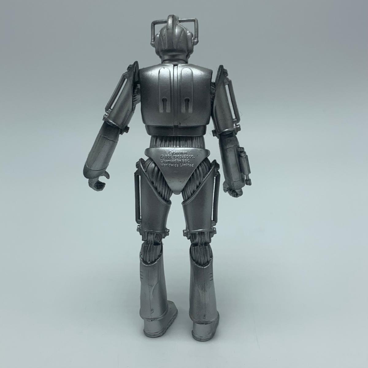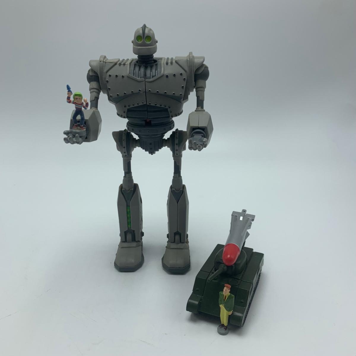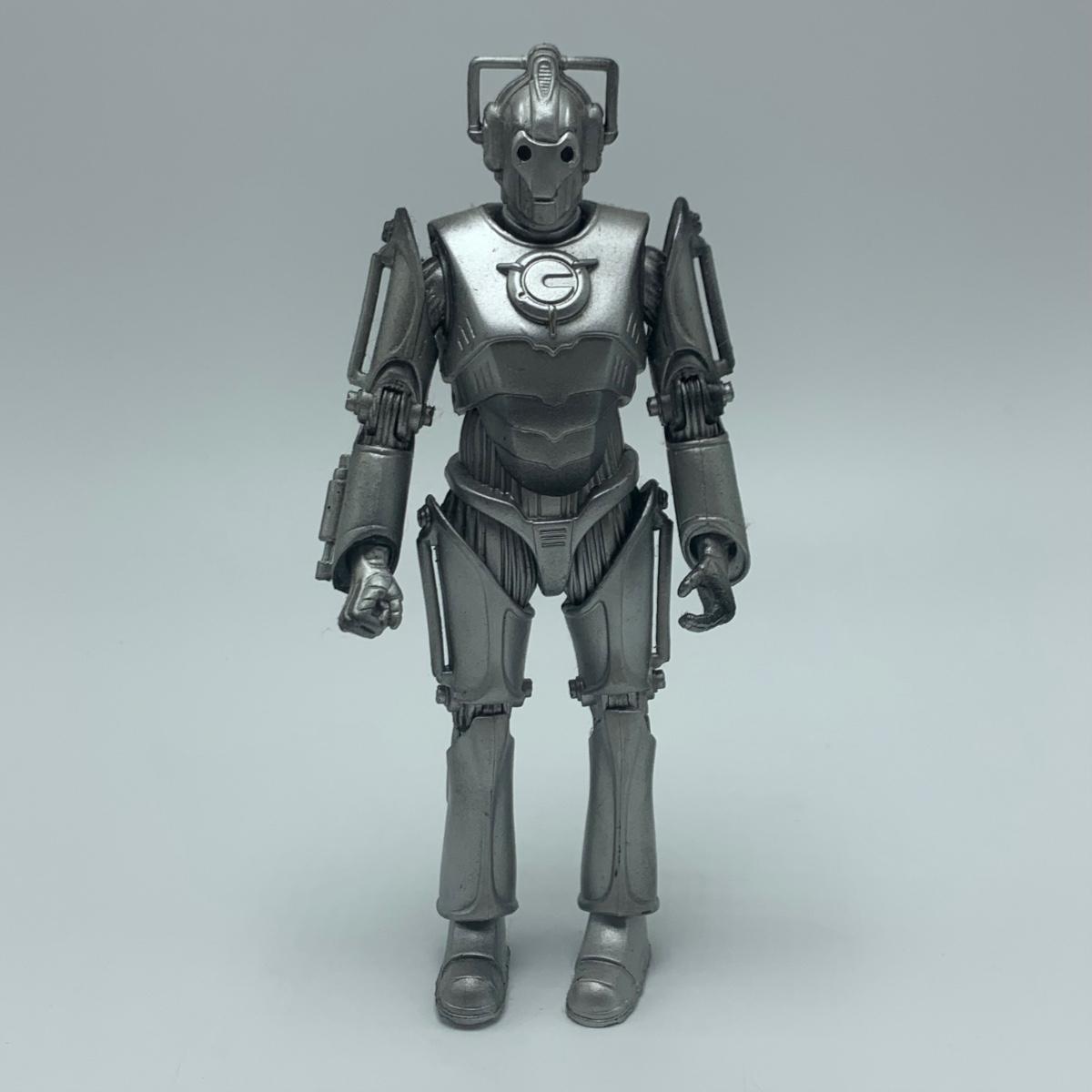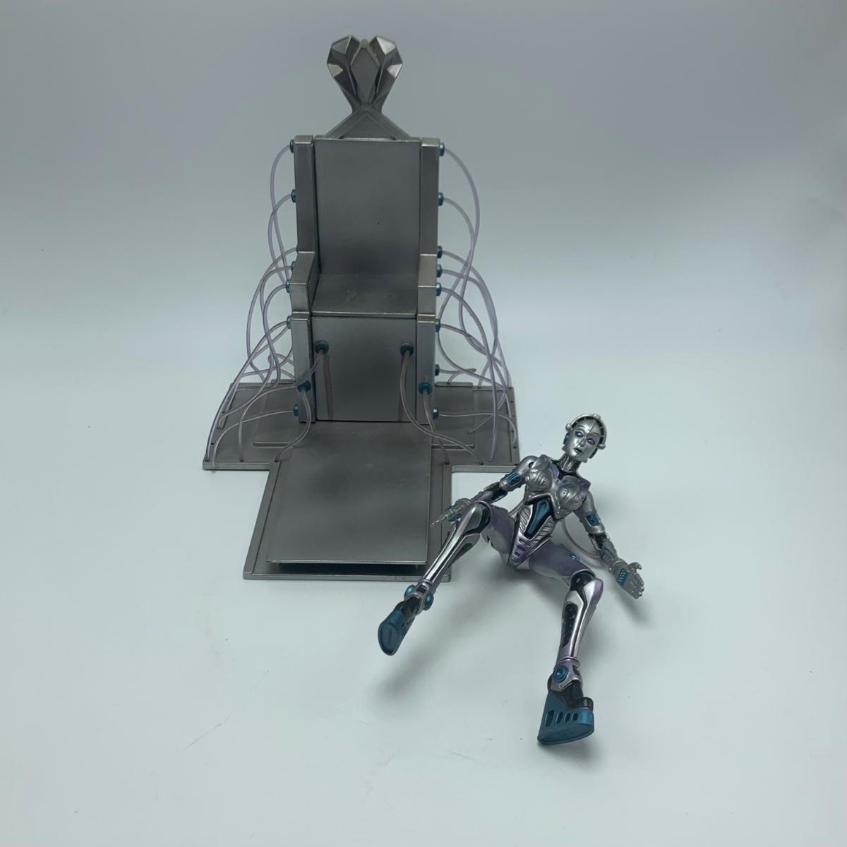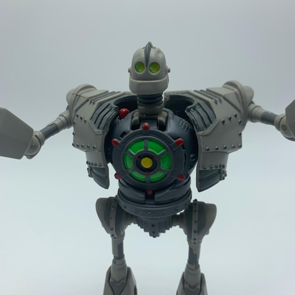 A variety of seven robot action figures. Featuring Maria from Metropolis, Phaeton from Exo Squad, Cyberman from Dr. Who, the Iron Giant, Cylon Centurion from Battlestar Galactica, and a robot from Lost in Space. The Lost in Space is the largest at 8” x 8” x 9”H. All items are plastic. The electronic items did not power on and likely need new batteries.
