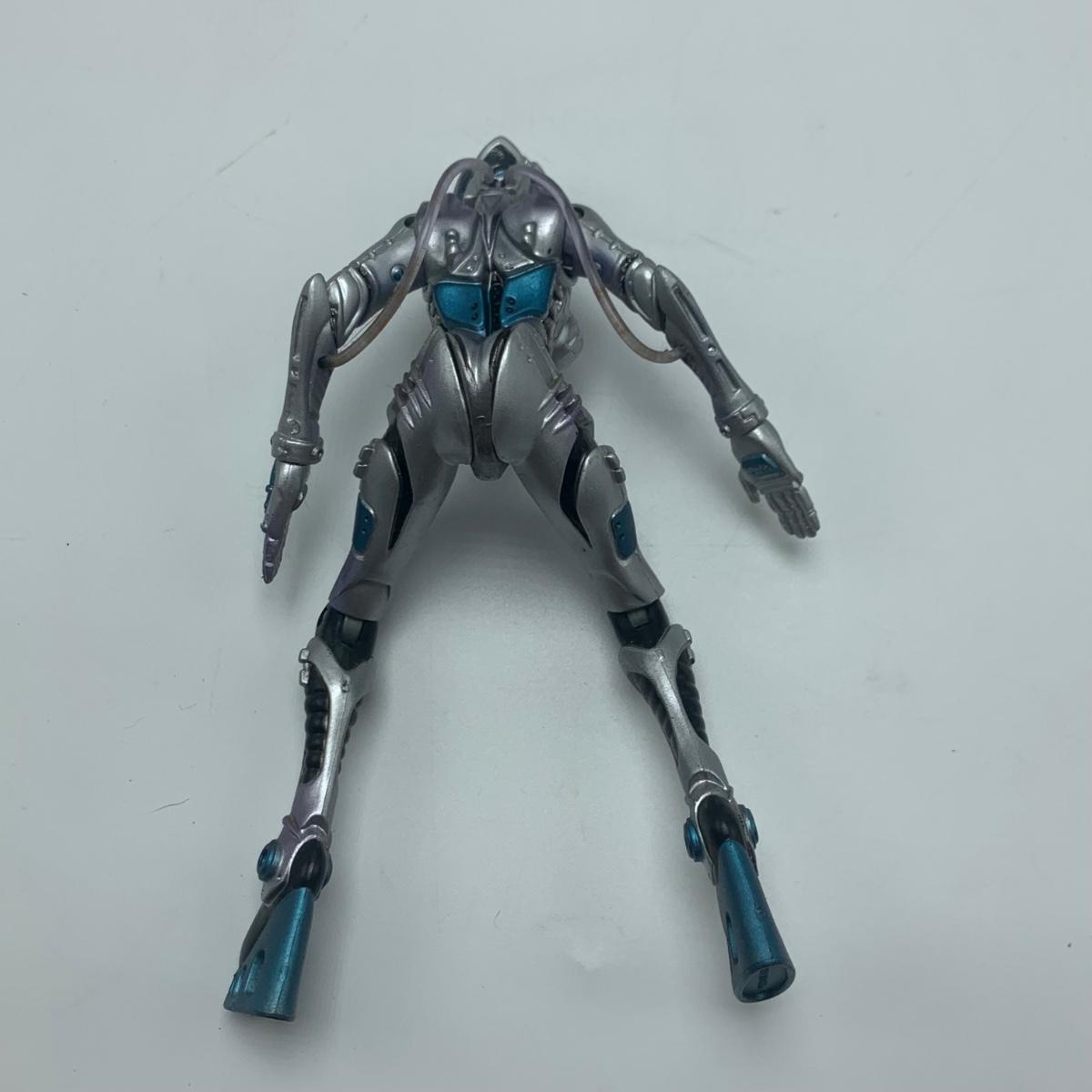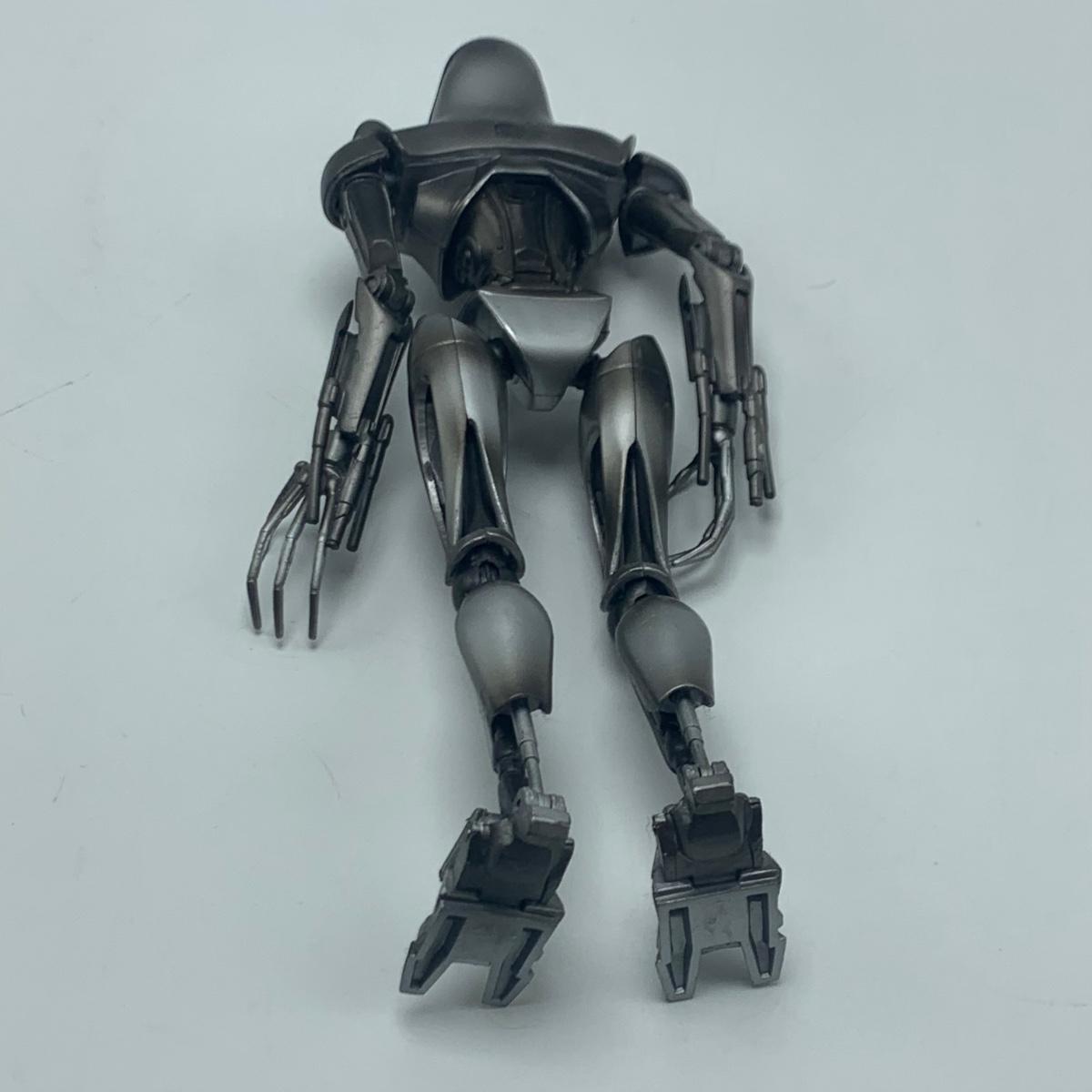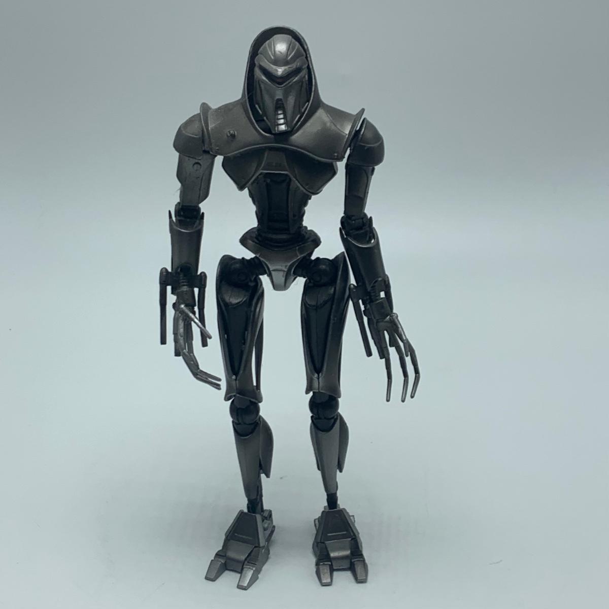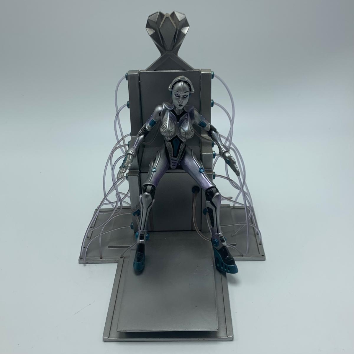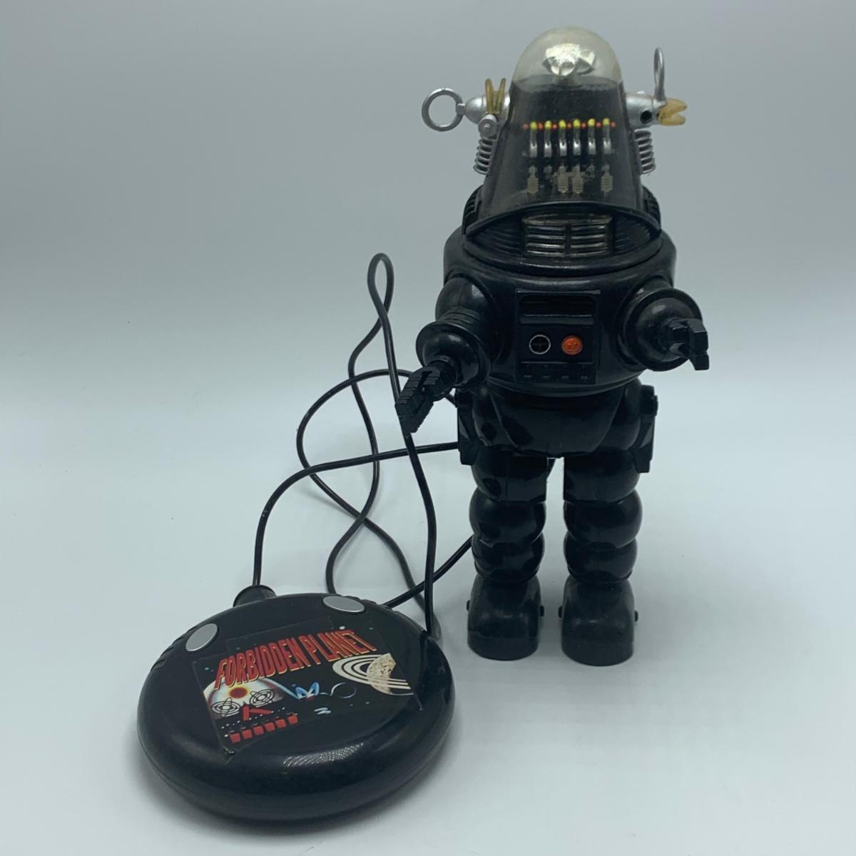 A variety of seven robot action figures. Featuring Maria from Metropolis, Phaeton from Exo Squad, Cyberman from Dr. Who, the Iron Giant, Cylon Centurion from Battlestar Galactica, and a robot from Lost in Space. The Lost in Space is the largest at 8” x 8” x 9”H. All items are plastic. The electronic items did not power on and likely need new batteries.
