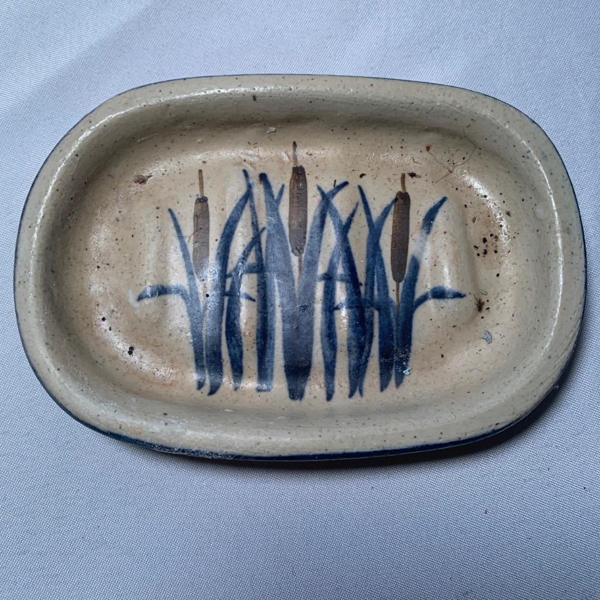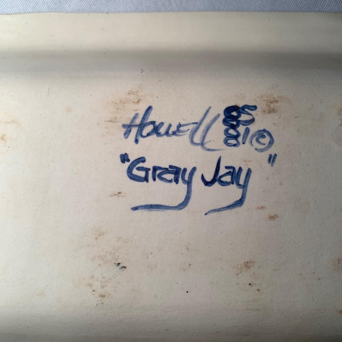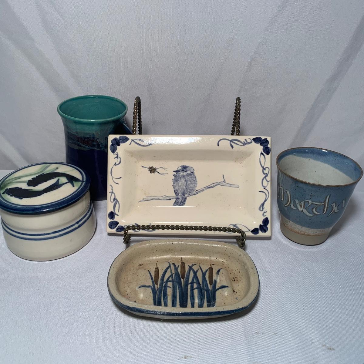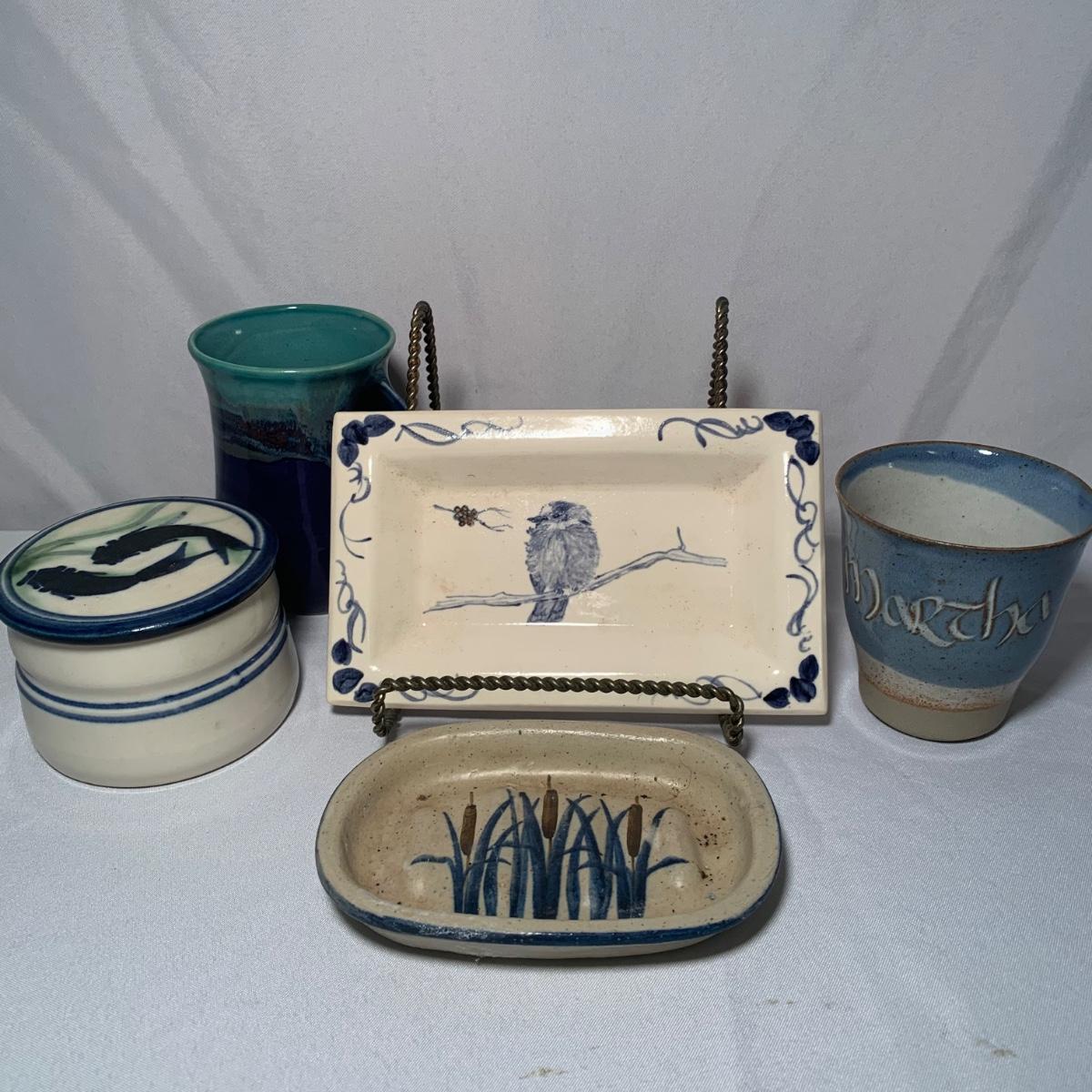 Breathe blue into your kitchen with this selection of blue themed ceramics. Lot includes a painted cattail soap dish, hand painted “Gray Jay” dish, “Martha” mug, glazed teal and blue mug, and koi fish butter bell. All items are signed by their respective artists and in good condition. See photos for details. “Gray Jay” dish measures 8”L x 5”W x 1”H. Wire stand not included.