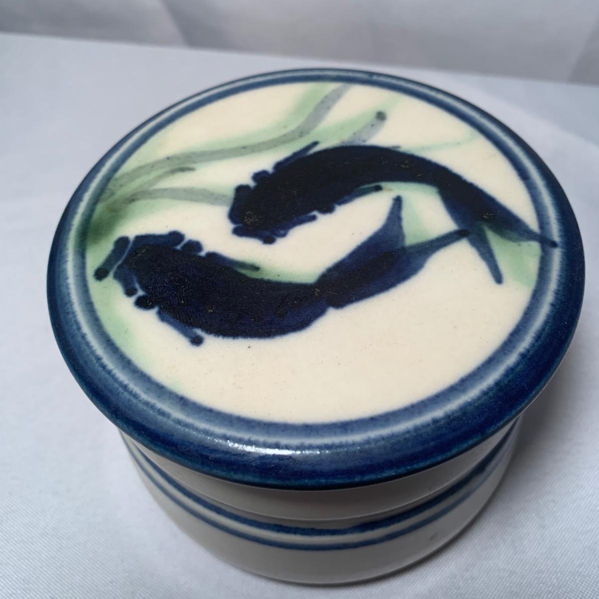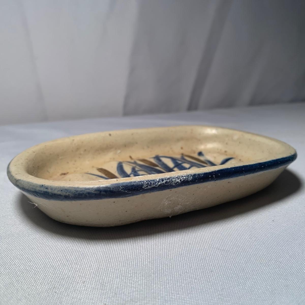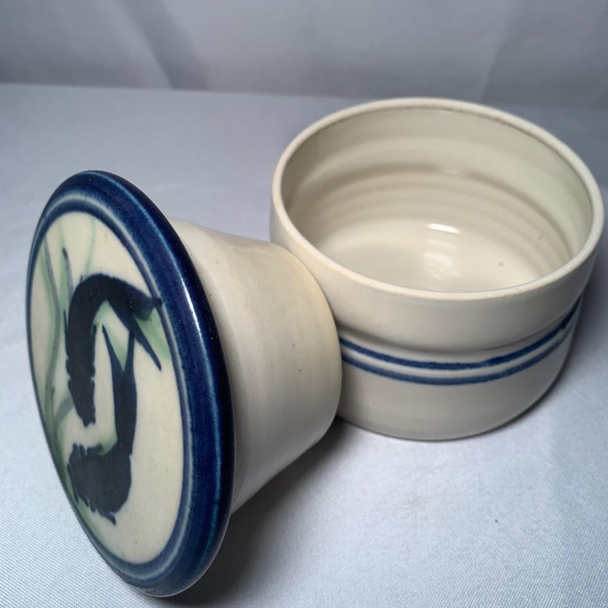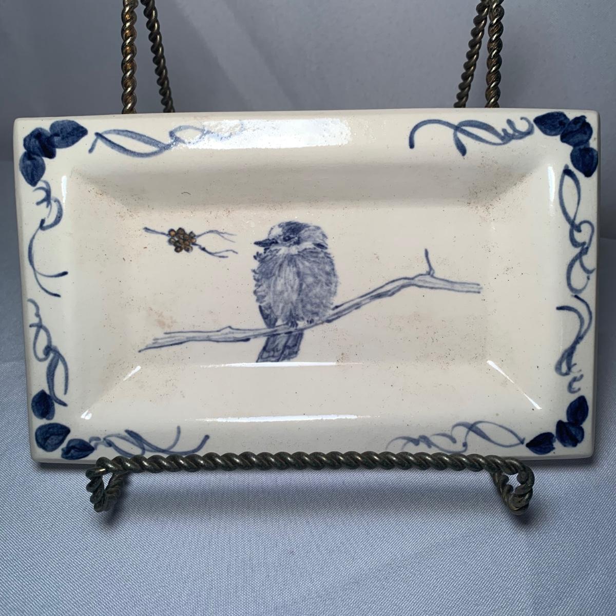 Breathe blue into your kitchen with this selection of blue themed ceramics. Lot includes a painted cattail soap dish, hand painted “Gray Jay” dish, “Martha” mug, glazed teal and blue mug, and koi fish butter bell. All items are signed by their respective artists and in good condition. See photos for details. “Gray Jay” dish measures 8”L x 5”W x 1”H. Wire stand not included.