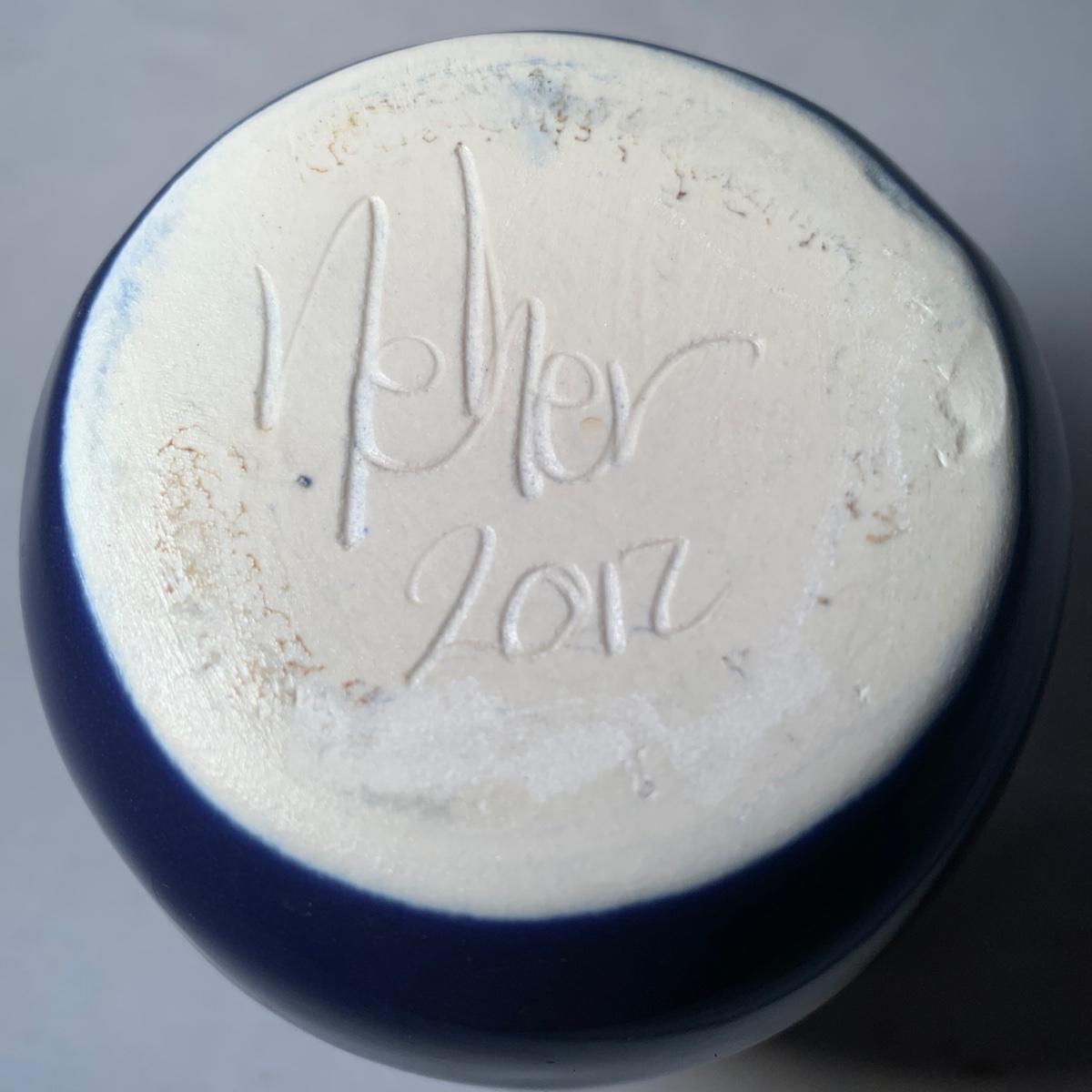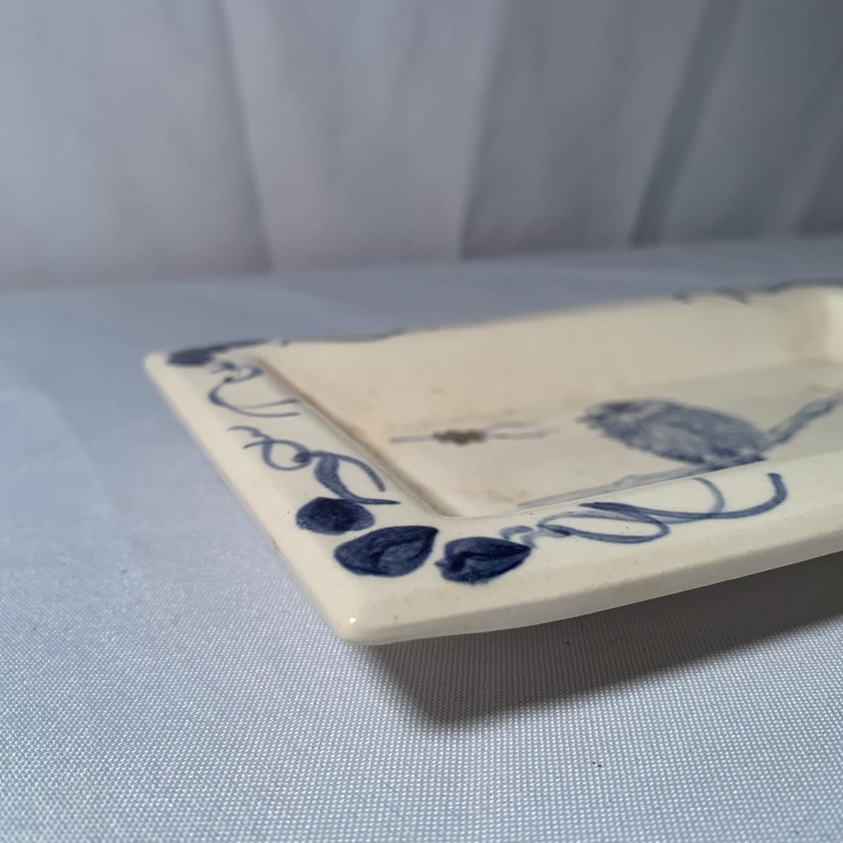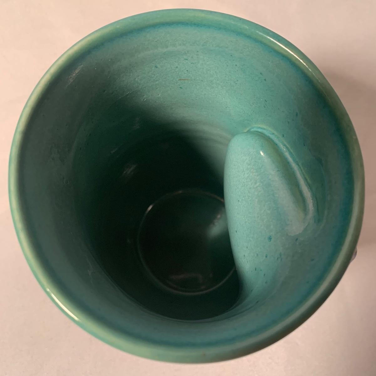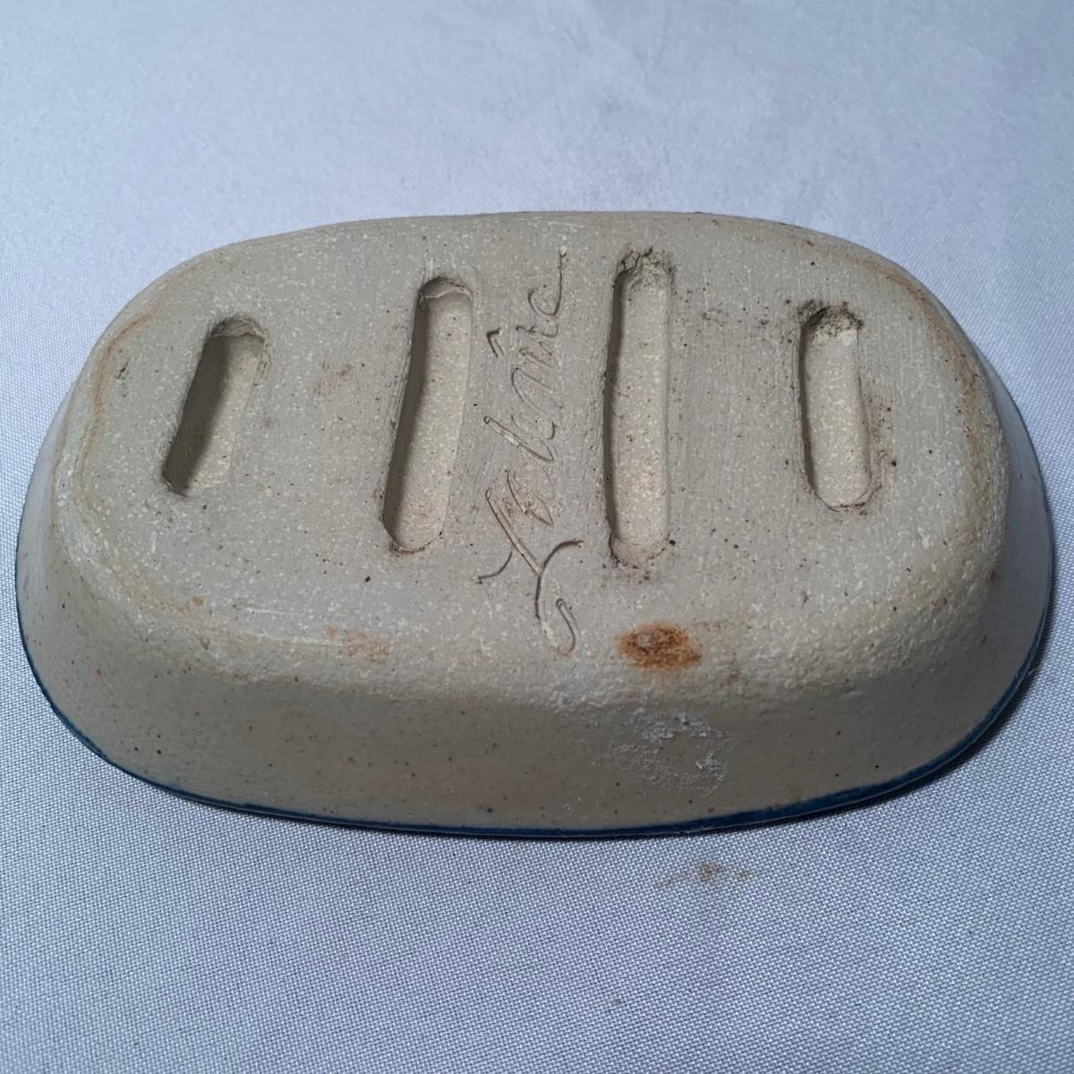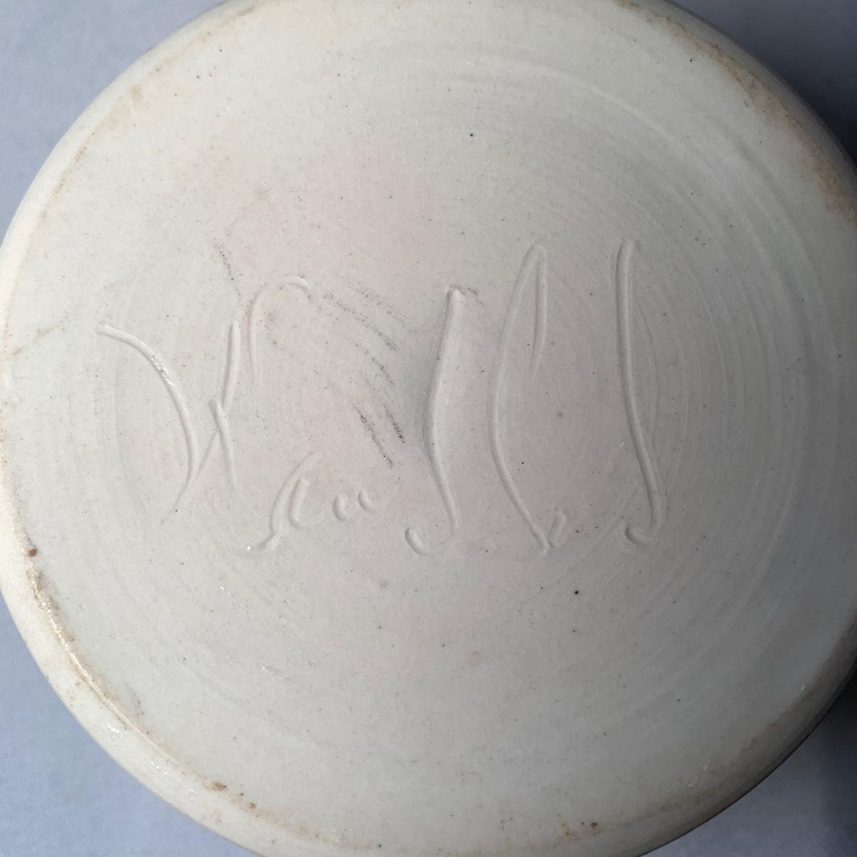 Breathe blue into your kitchen with this selection of blue themed ceramics. Lot includes a painted cattail soap dish, hand painted “Gray Jay” dish, “Martha” mug, glazed teal and blue mug, and koi fish butter bell. All items are signed by their respective artists and in good condition. See photos for details. “Gray Jay” dish measures 8”L x 5”W x 1”H. Wire stand not included.