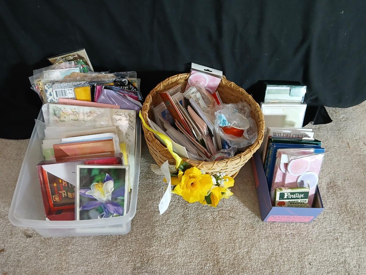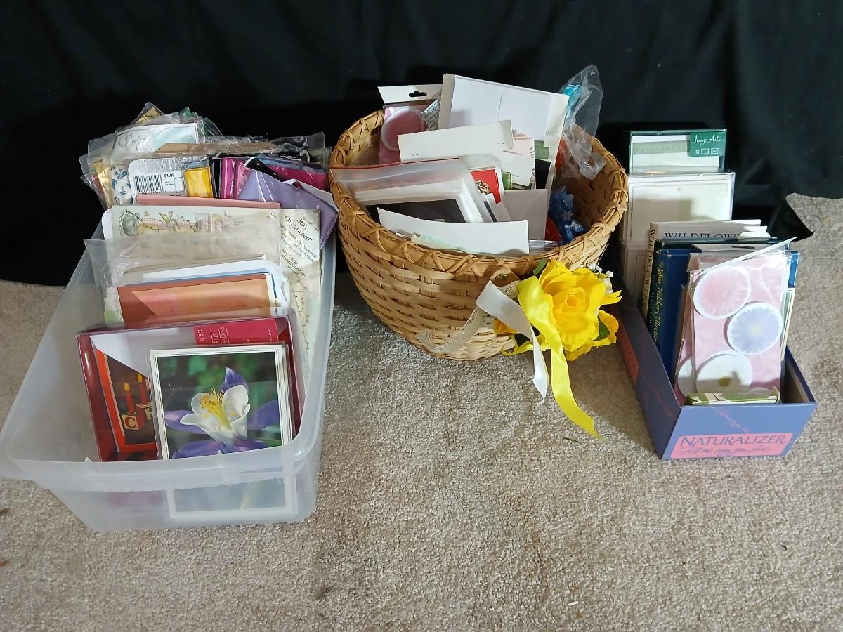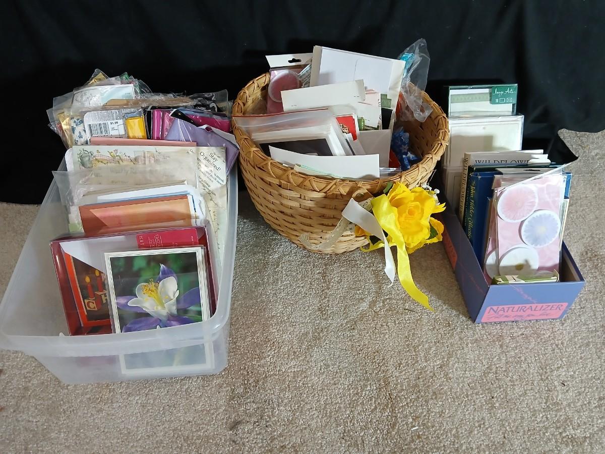 Variety of stationary and greeting cards - many still brand new in a tote and a basket