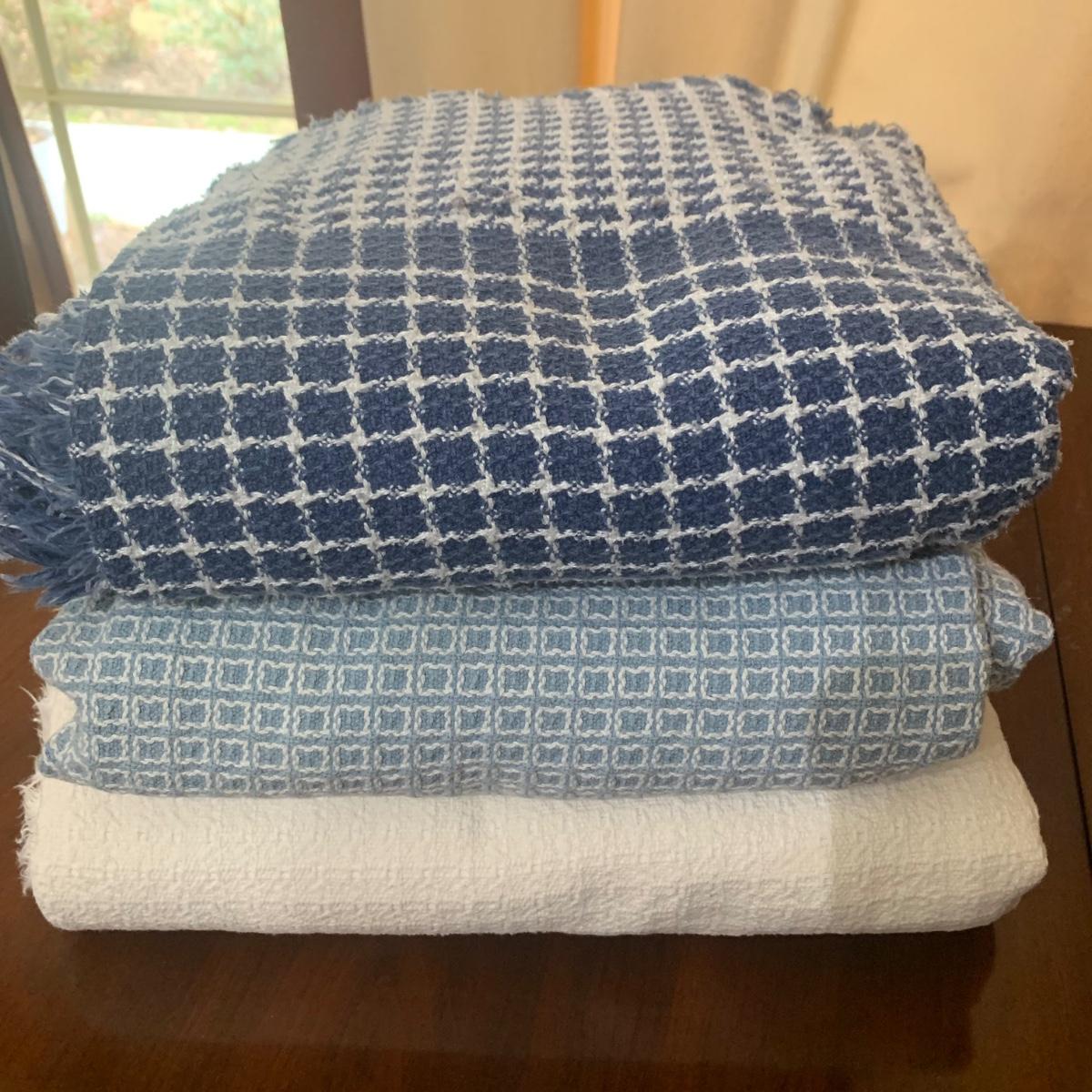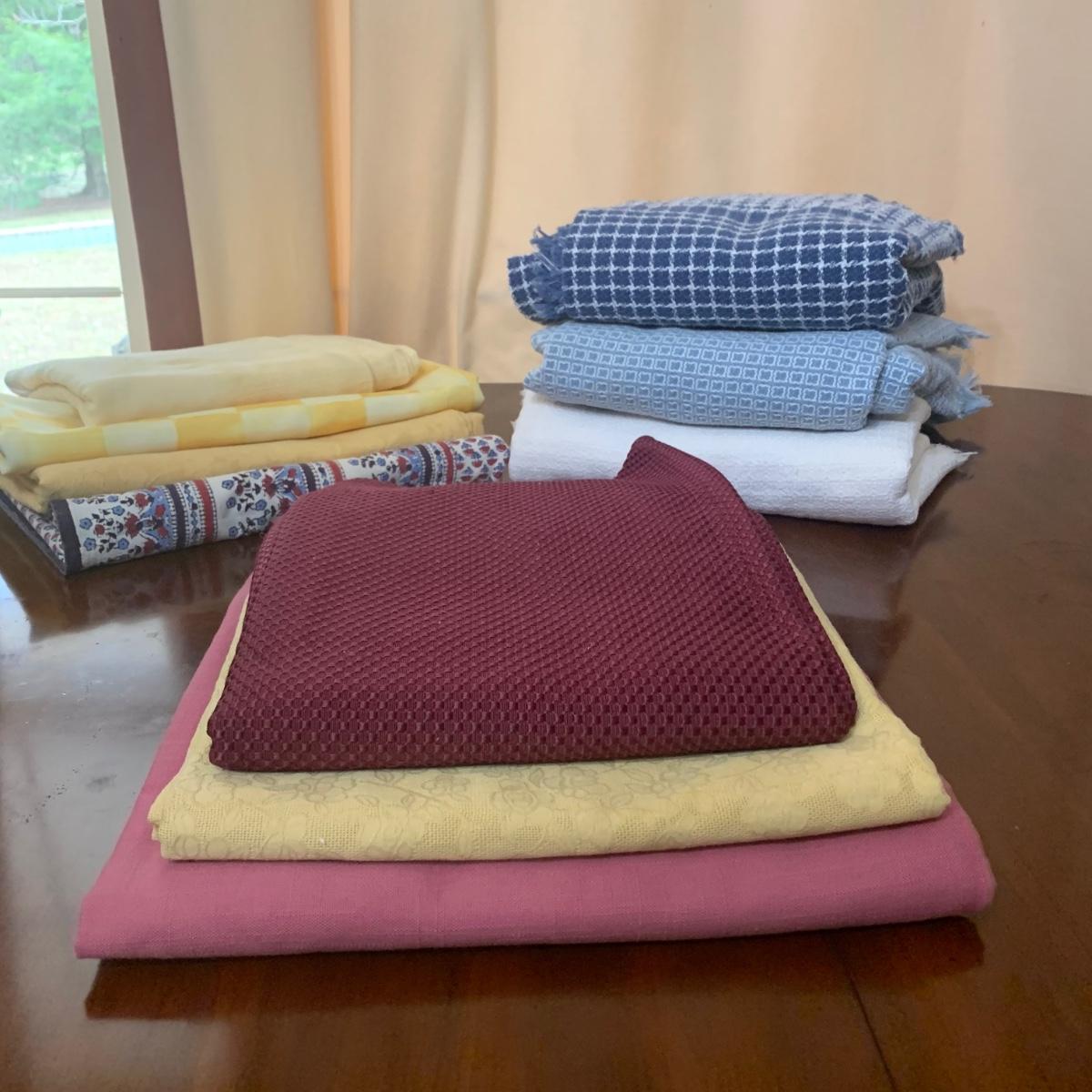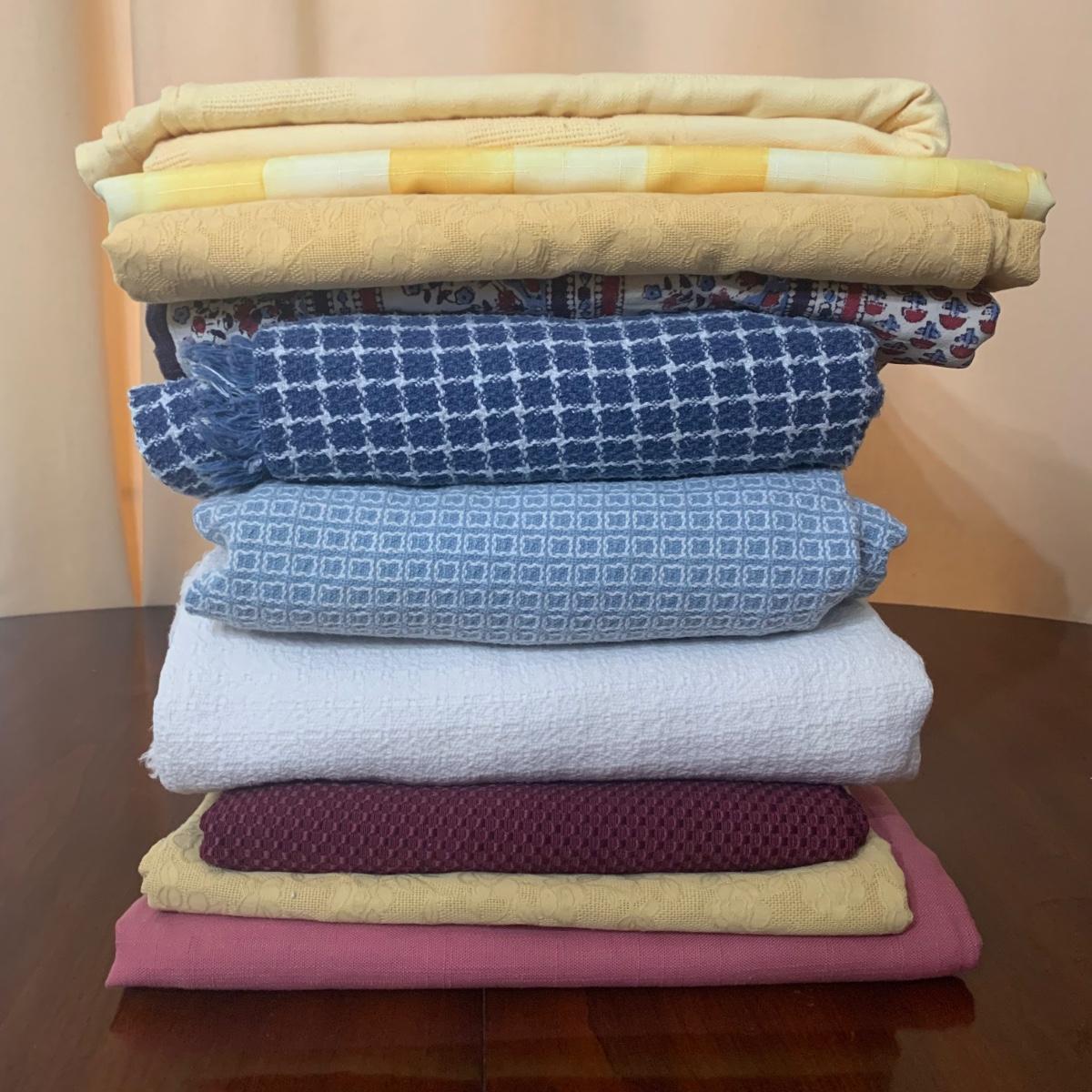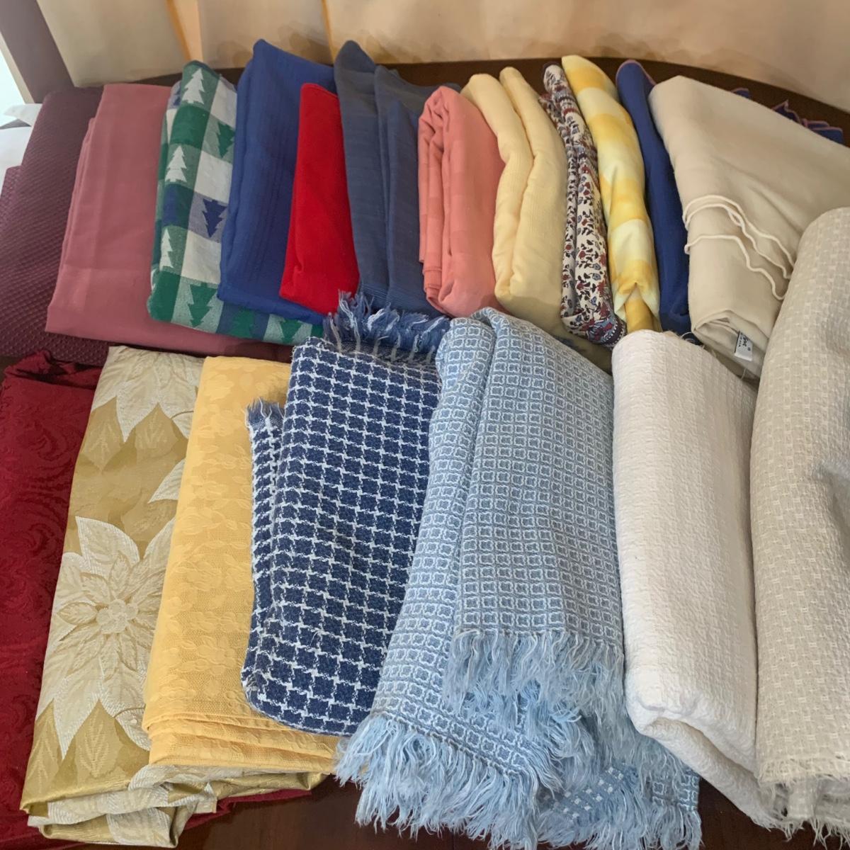 This lot includes about twenty-one table cloths. Most measure 80”L x 54”W. There are rectangular cloths and circular; formal and casual. You’ll find blue, green, white, red, and even gold table linens. Linens could use cleaning, but appear to be in good condition. Let this lot surprise you!