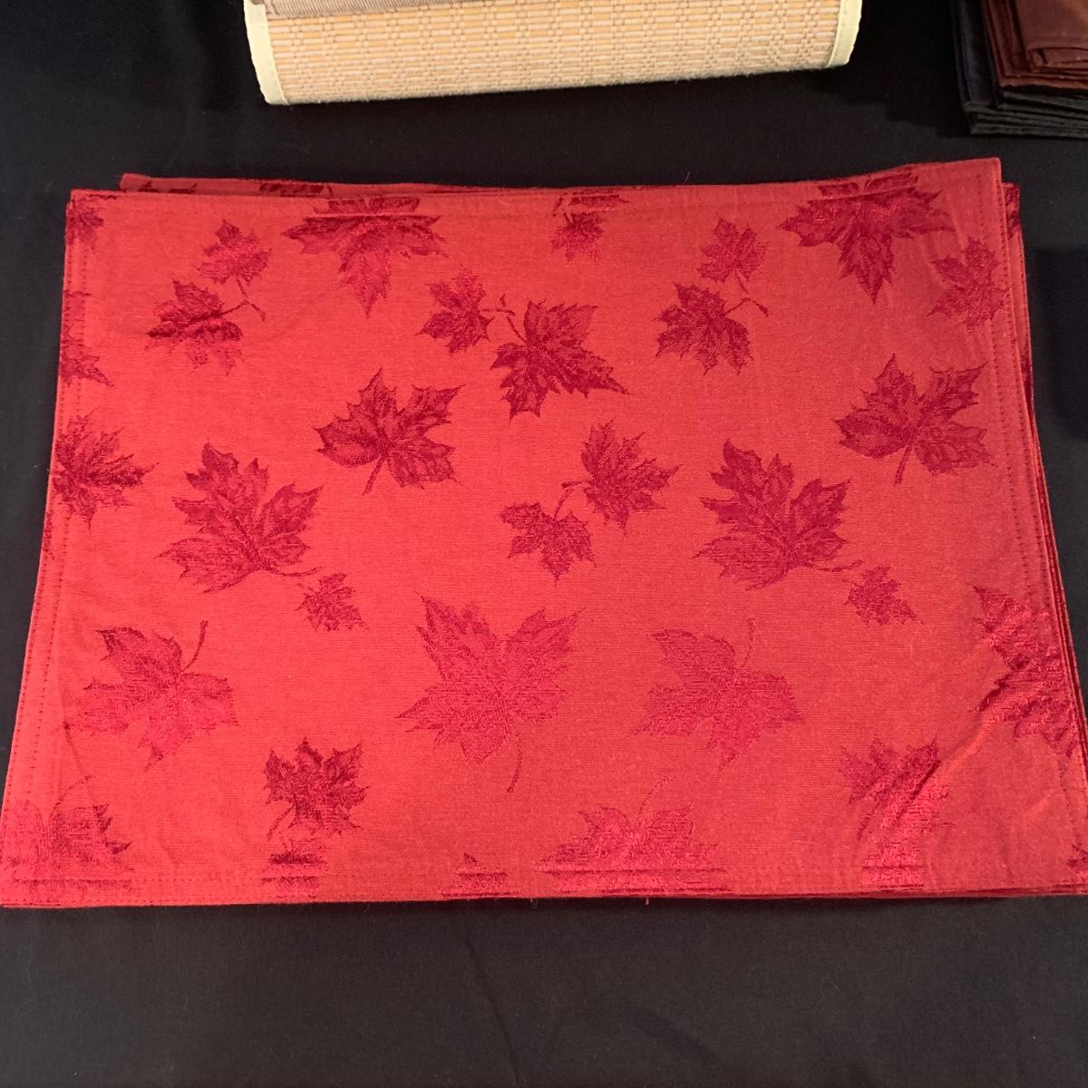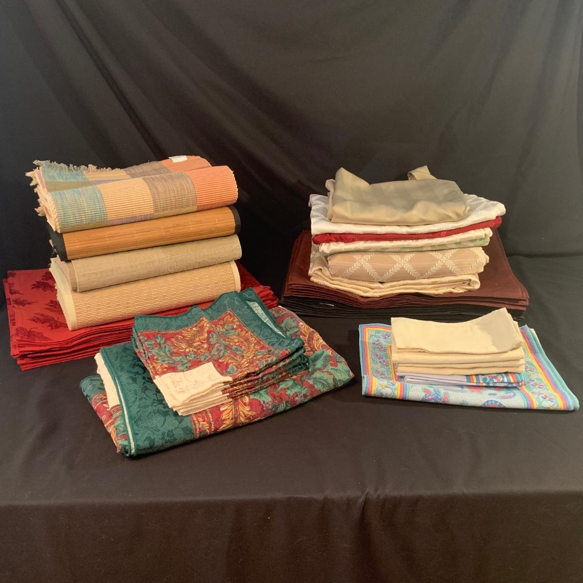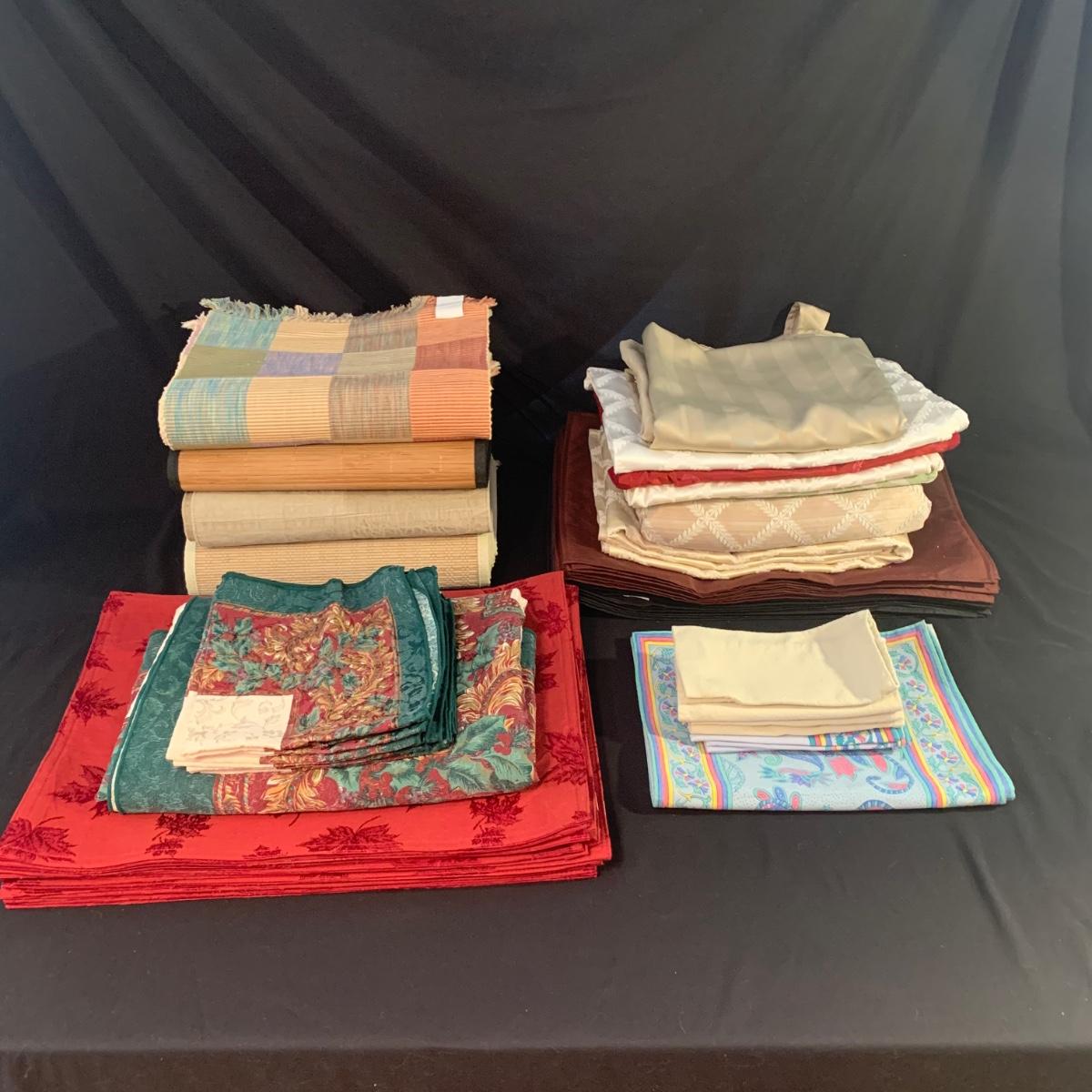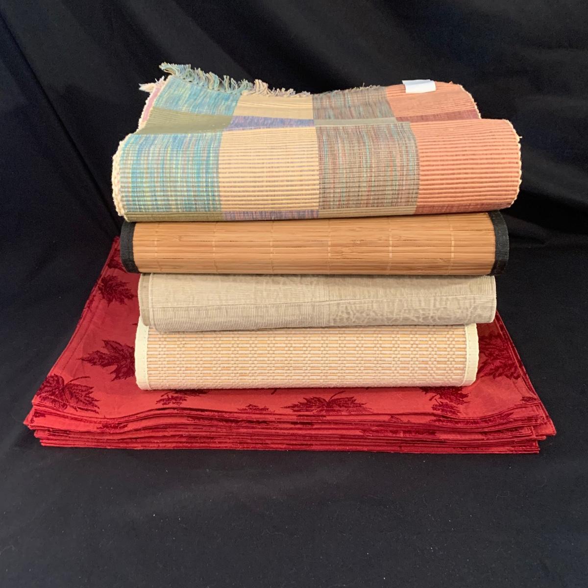 This variety of table linens includes sixteen red maple placemats, nine bamboo placemats , eight beige corduroy placemats, twelve colorful checkered placemats, eight light up maroon placemats, eight light up black placemats, eight napkins, and four table runners. Light up-linens will likely need batteries replaced, as they do not power on. Aside from this, linens appear to be in good condition.