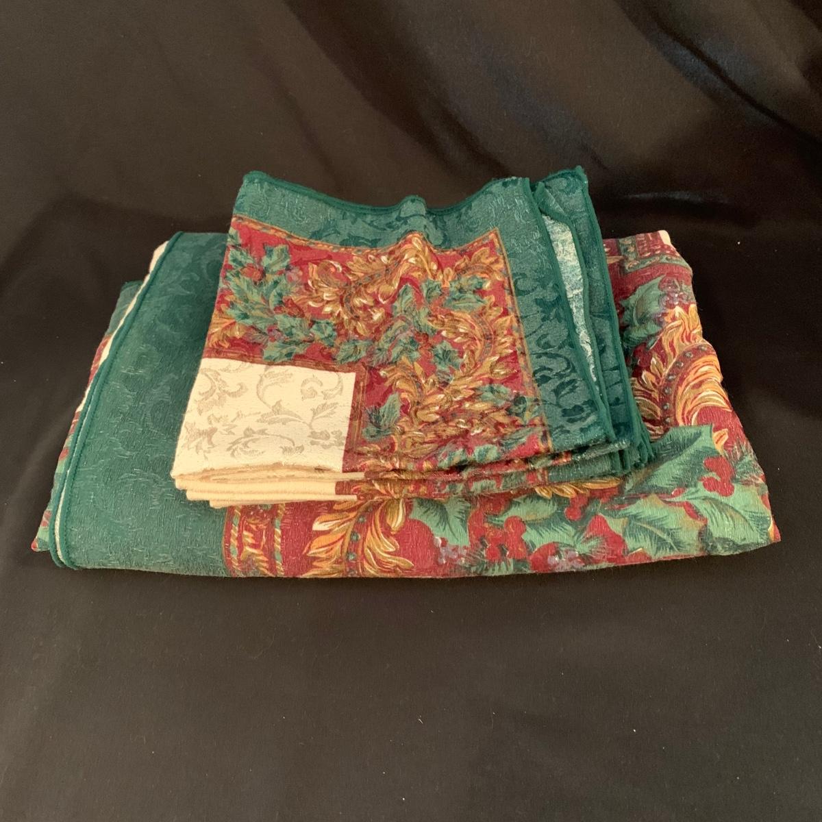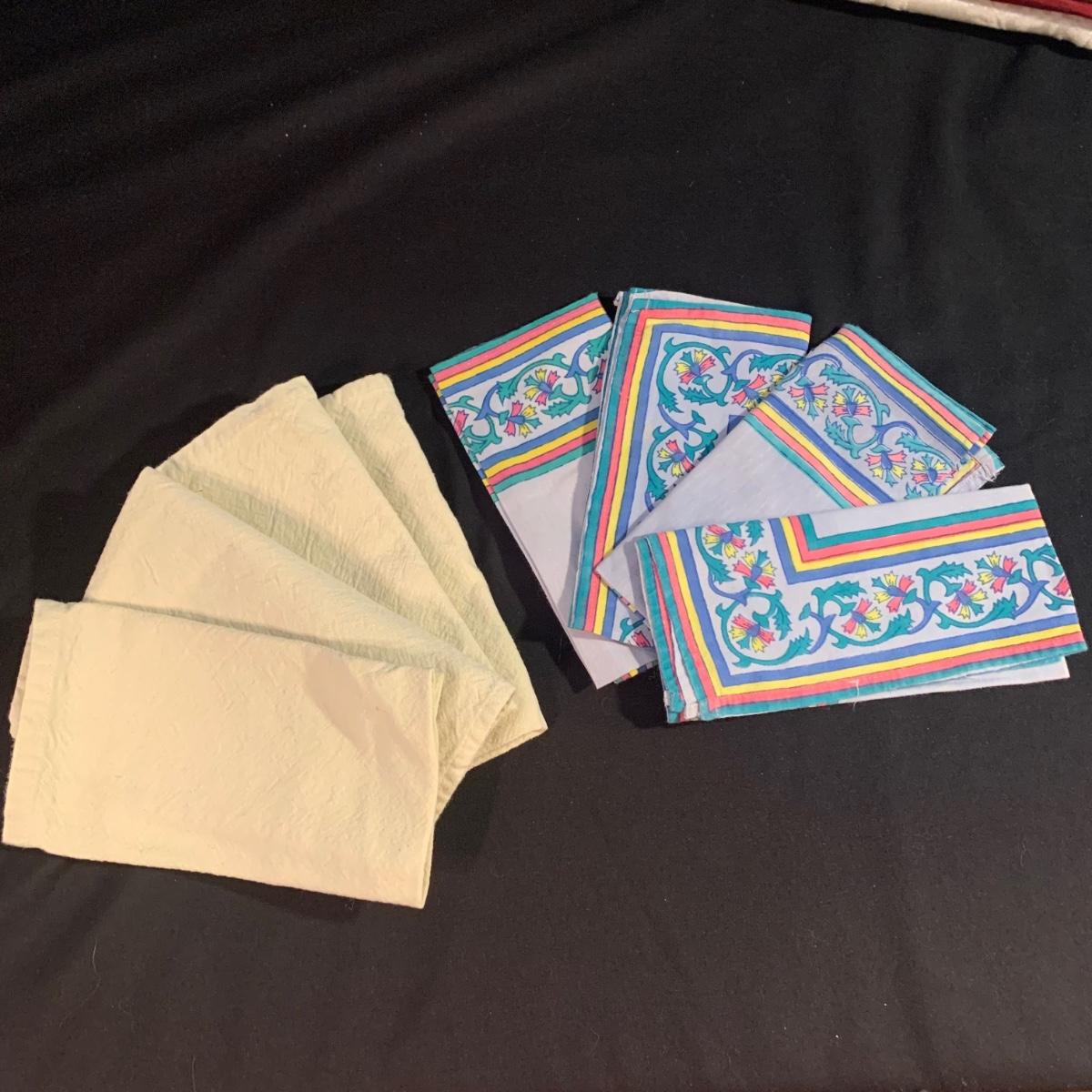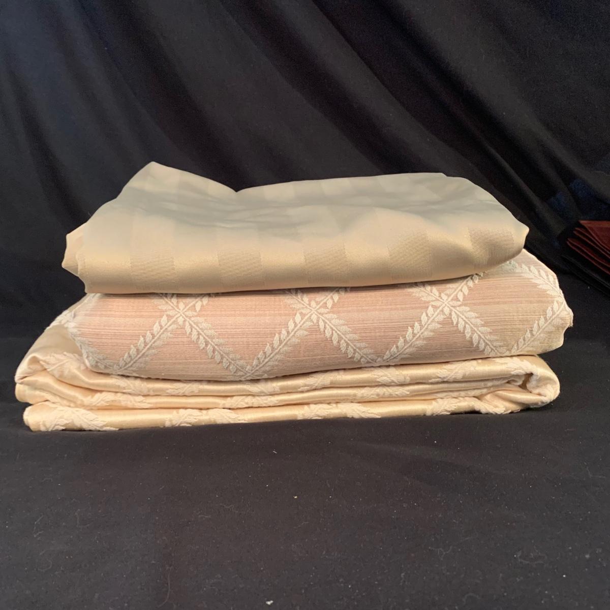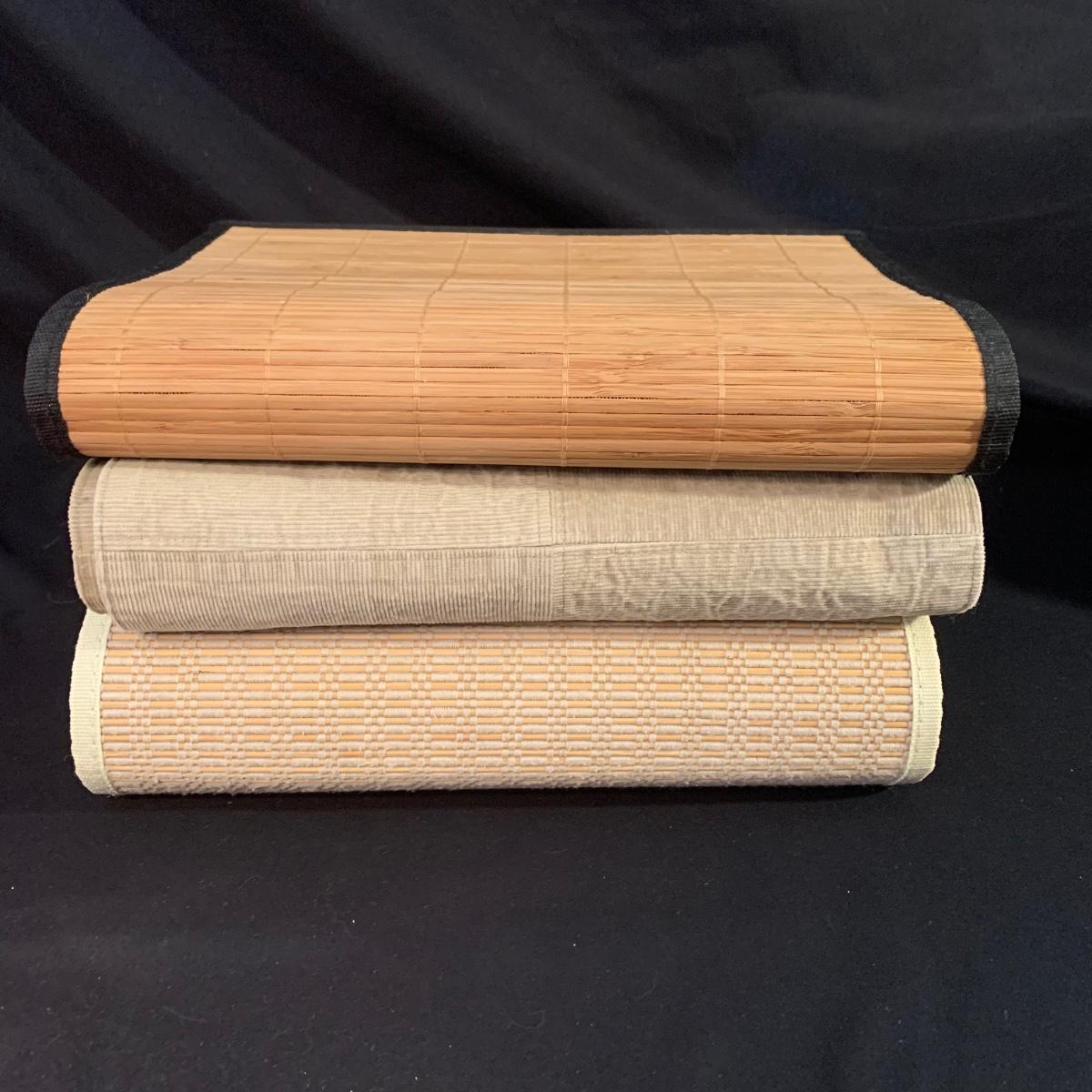 This variety of table linens includes sixteen red maple placemats, nine bamboo placemats , eight beige corduroy placemats, twelve colorful checkered placemats, eight light up maroon placemats, eight light up black placemats, eight napkins, and four table runners. Light up-linens will likely need batteries replaced, as they do not power on. Aside from this, linens appear to be in good condition.