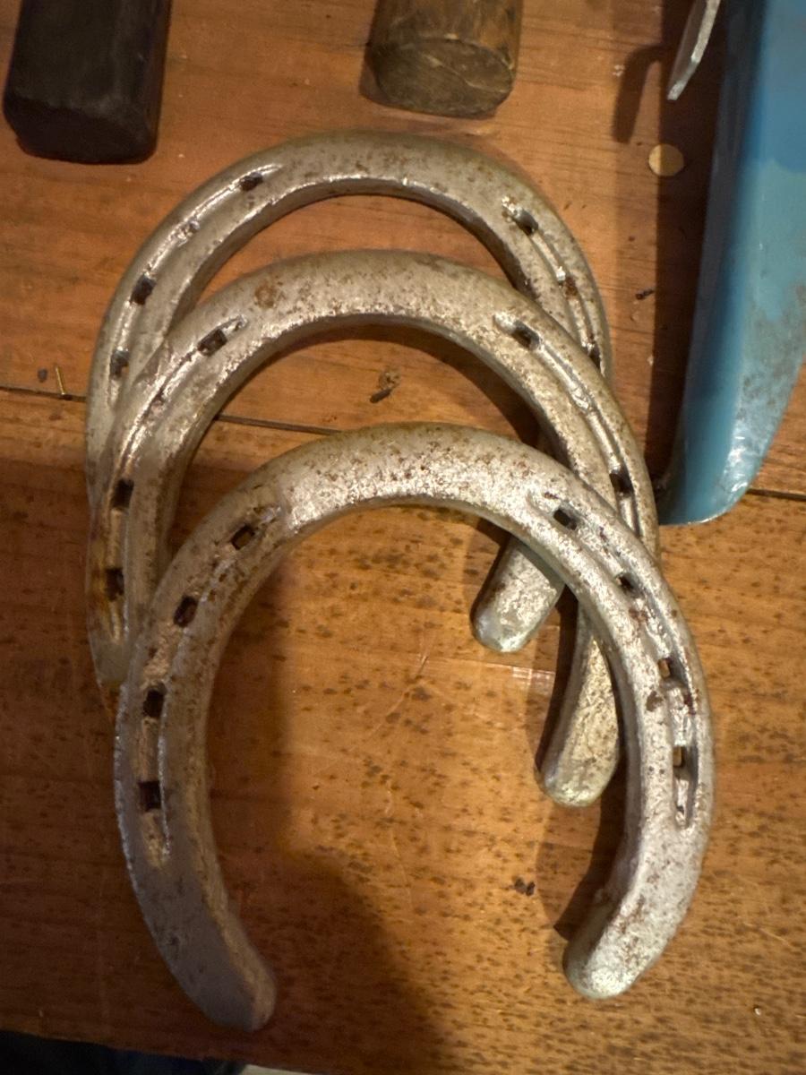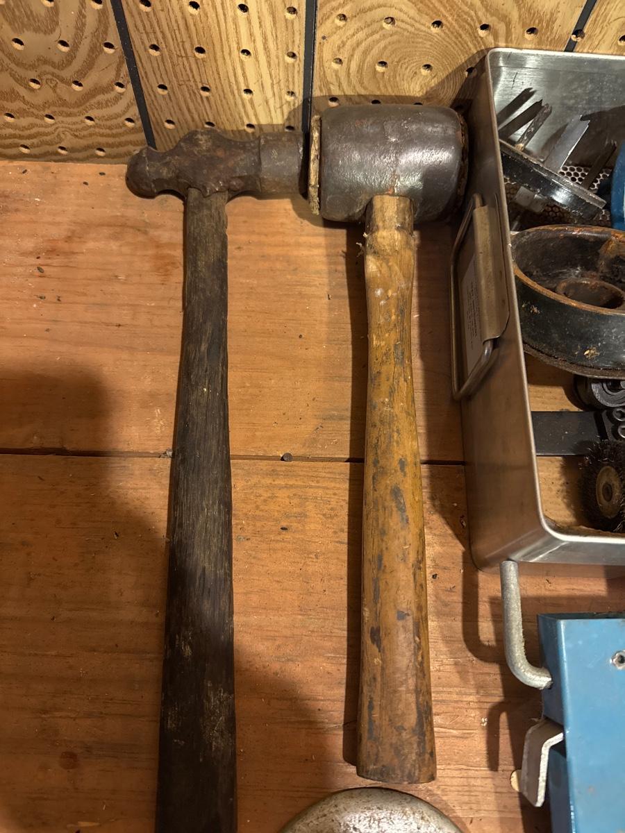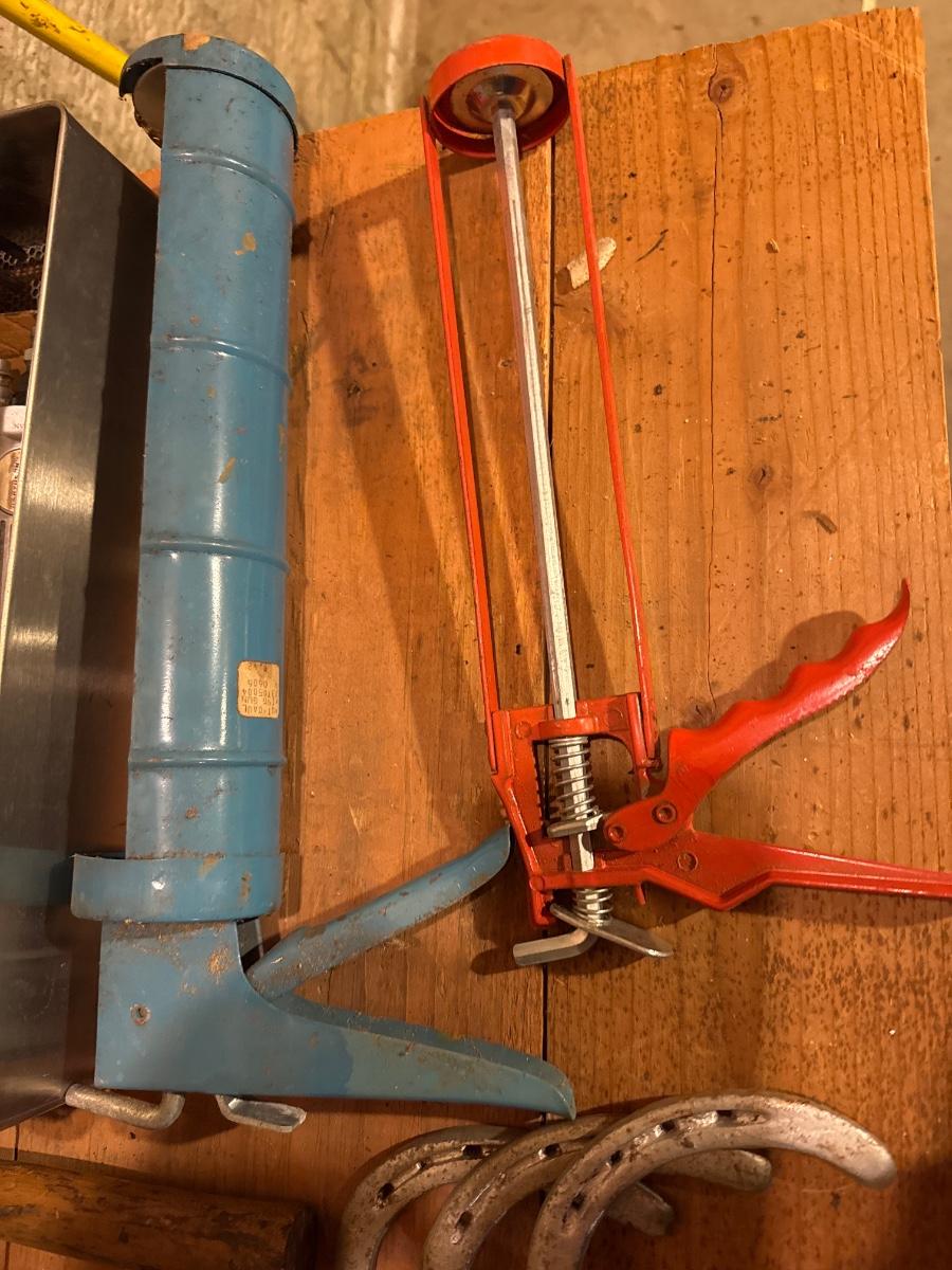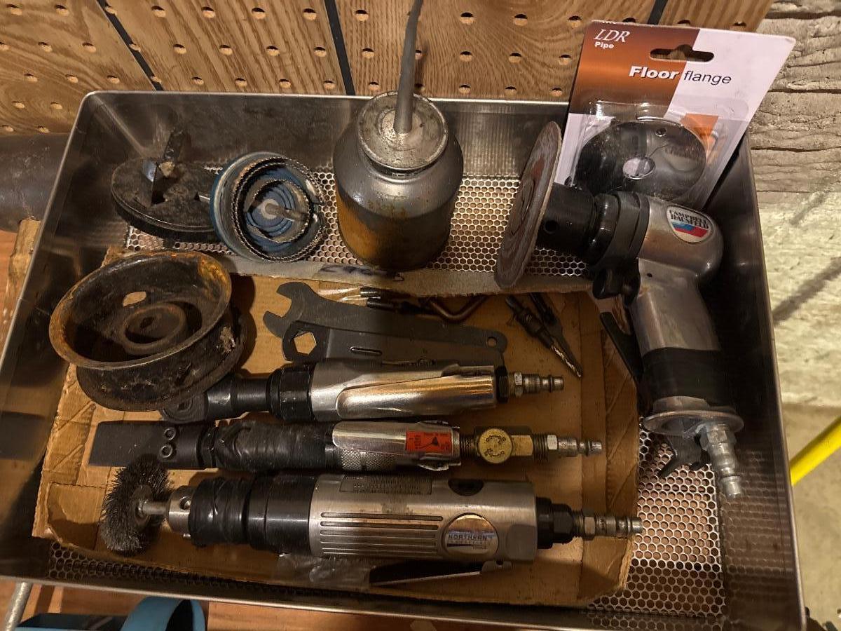 Includes two hammers, three horseshoes, two caulking, guns, four air powered tools, small oil can, and metal pan.