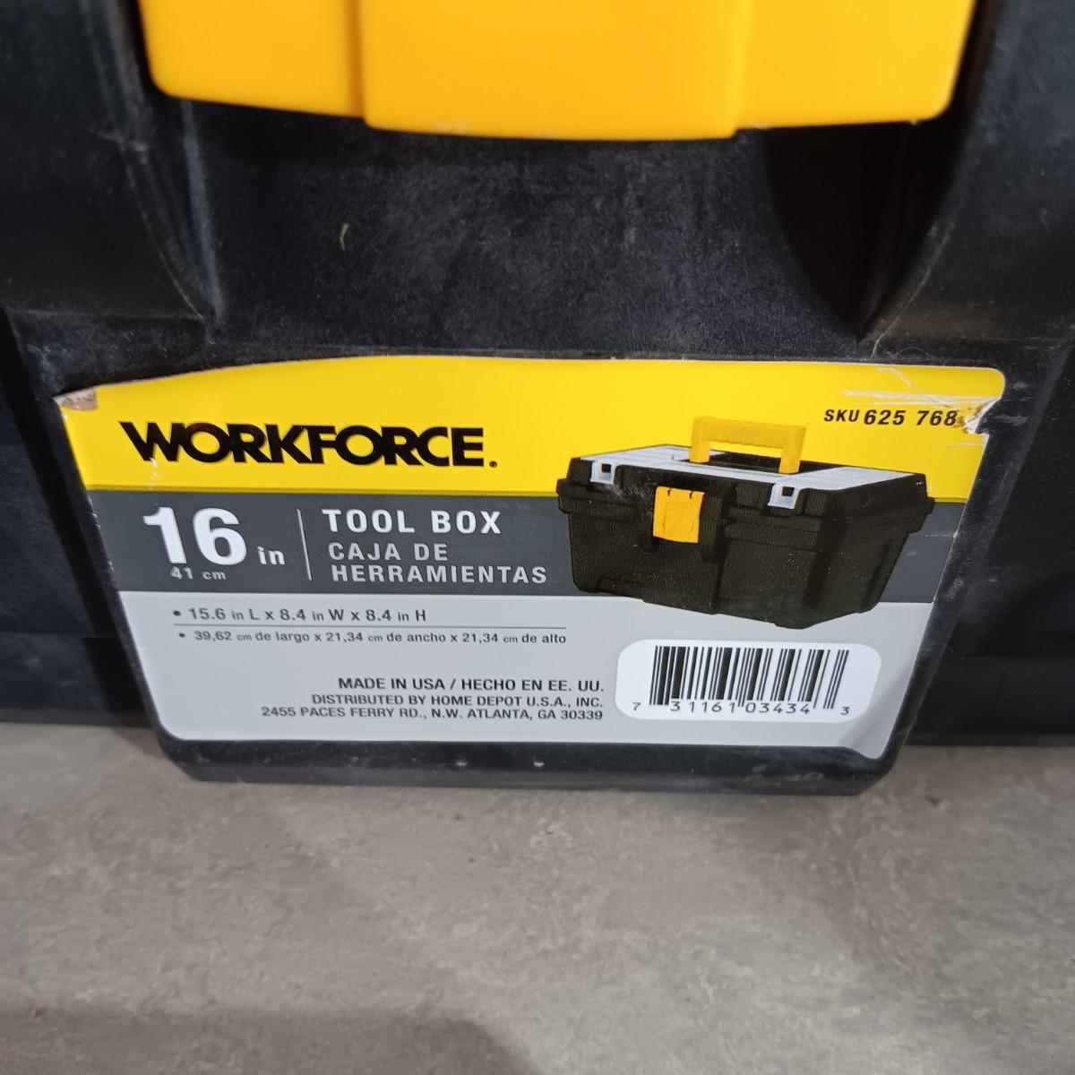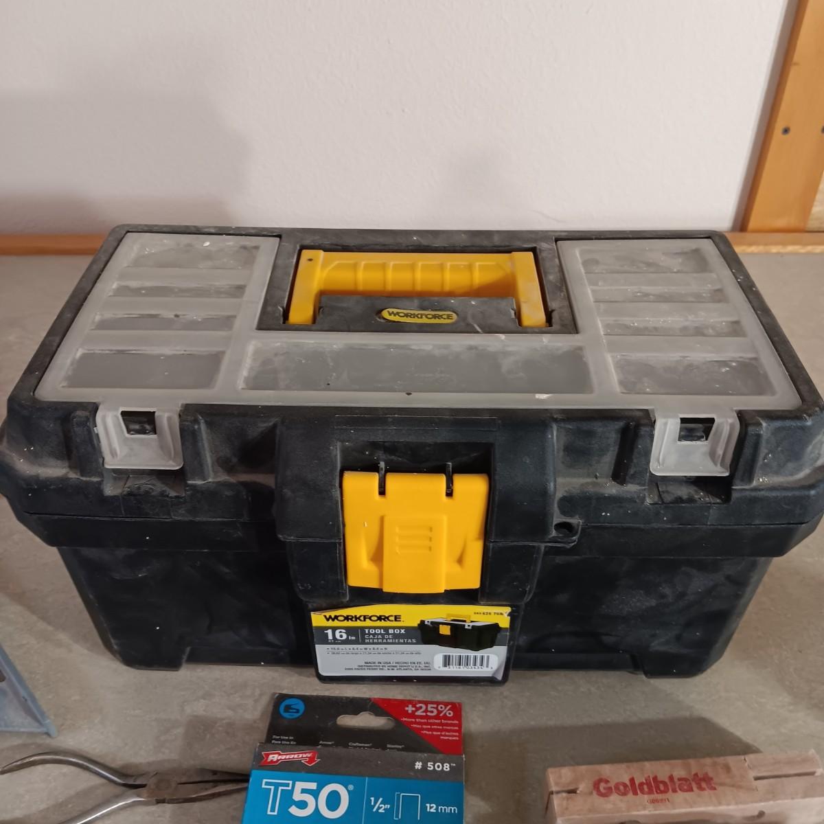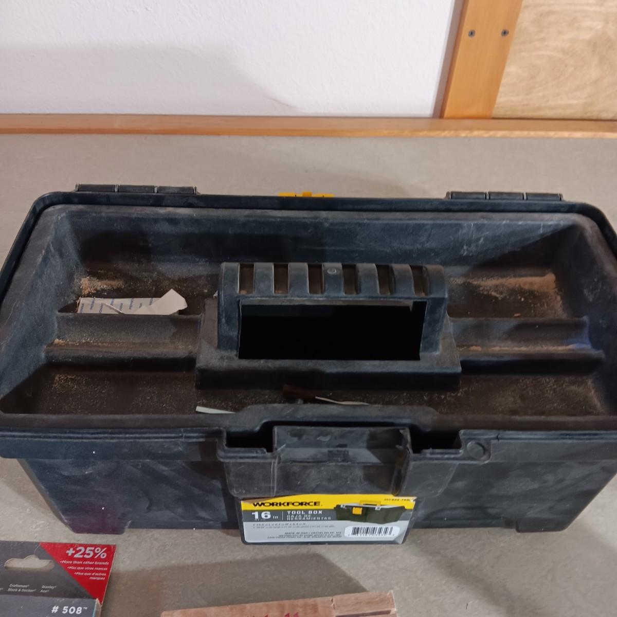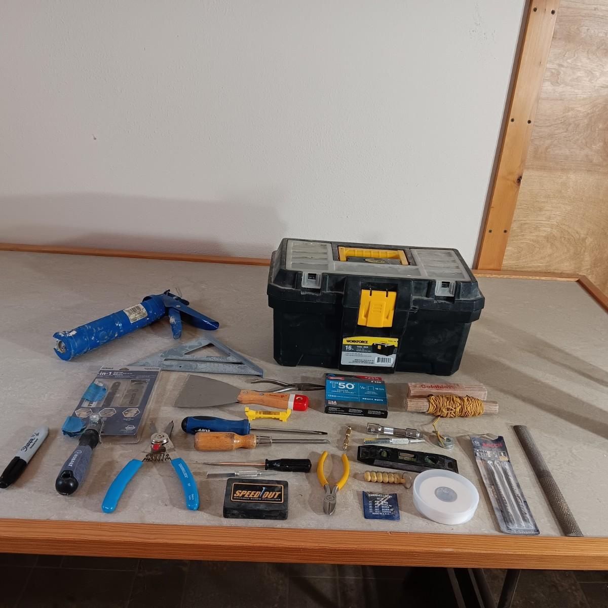 VARIETY OF TOOLS AND A TOOL BOX W/SHELF