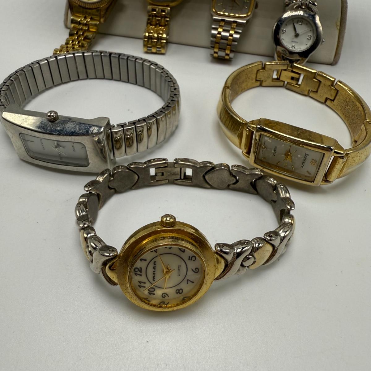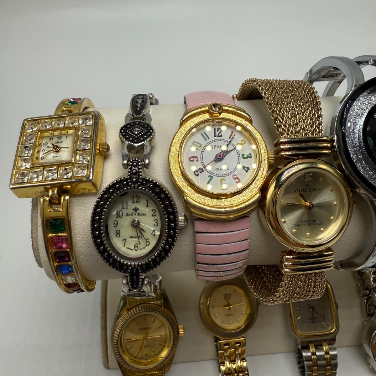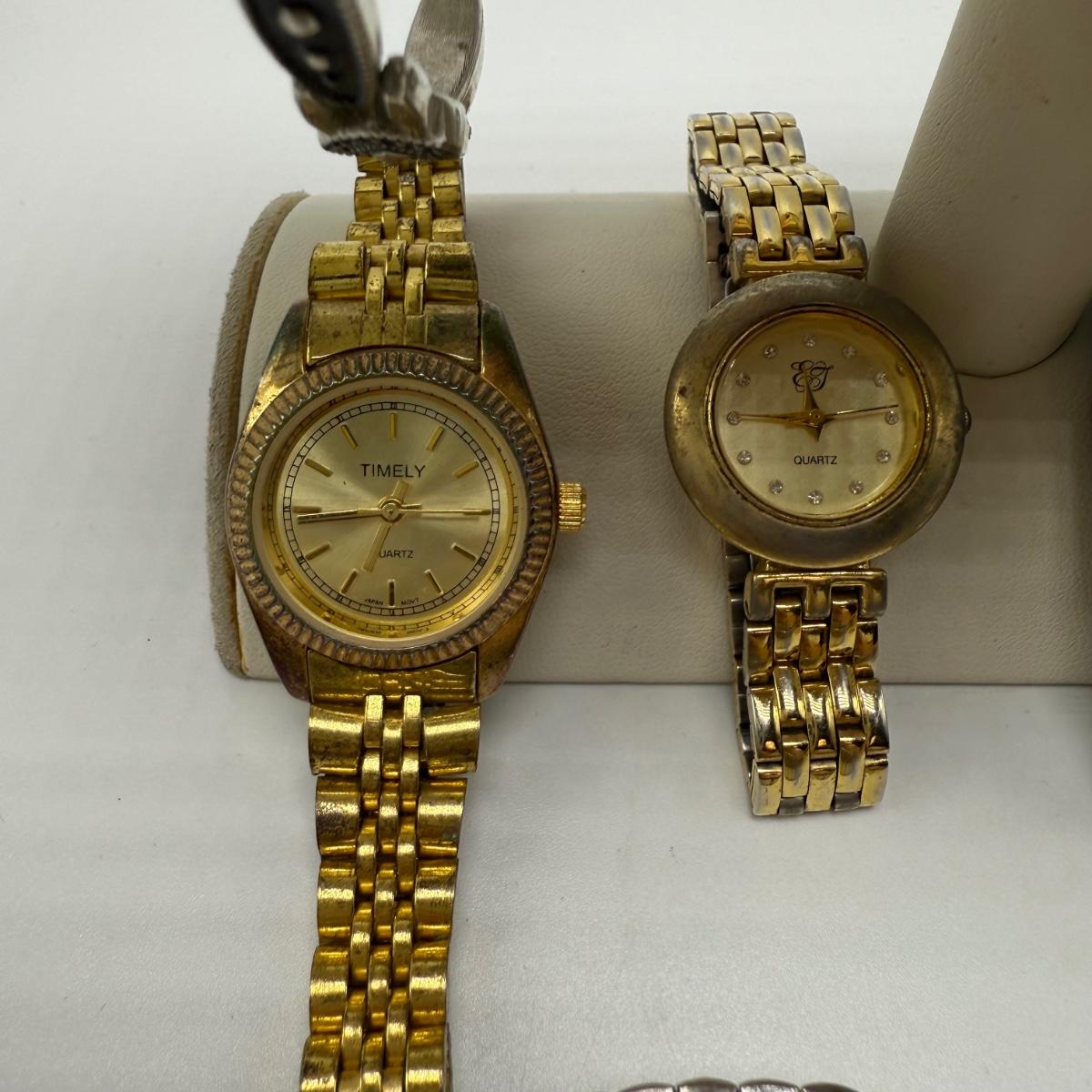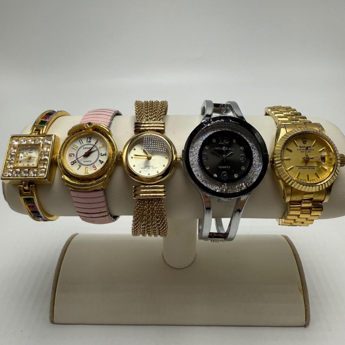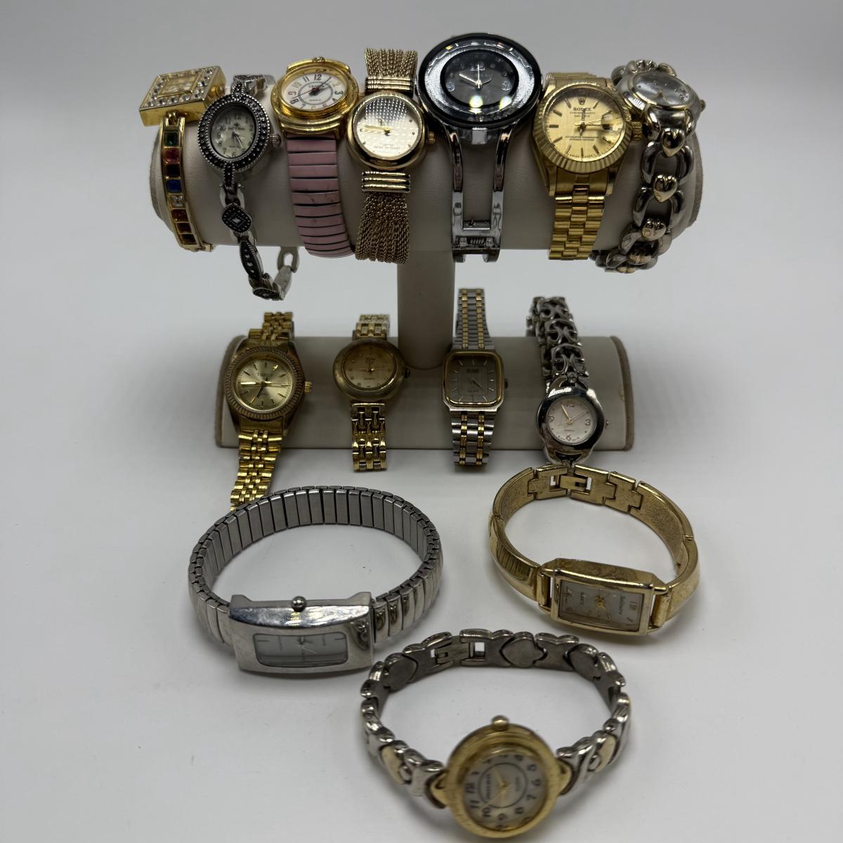 14 women’s watches, all with metal bands (some with clasps, some elastic). A fun and elegant variety from many different brands. Most appear to be in good condition, but some are worn. None are currently functioning. We do not believe the Rolex is authentic. Please see photos for inventory and details.