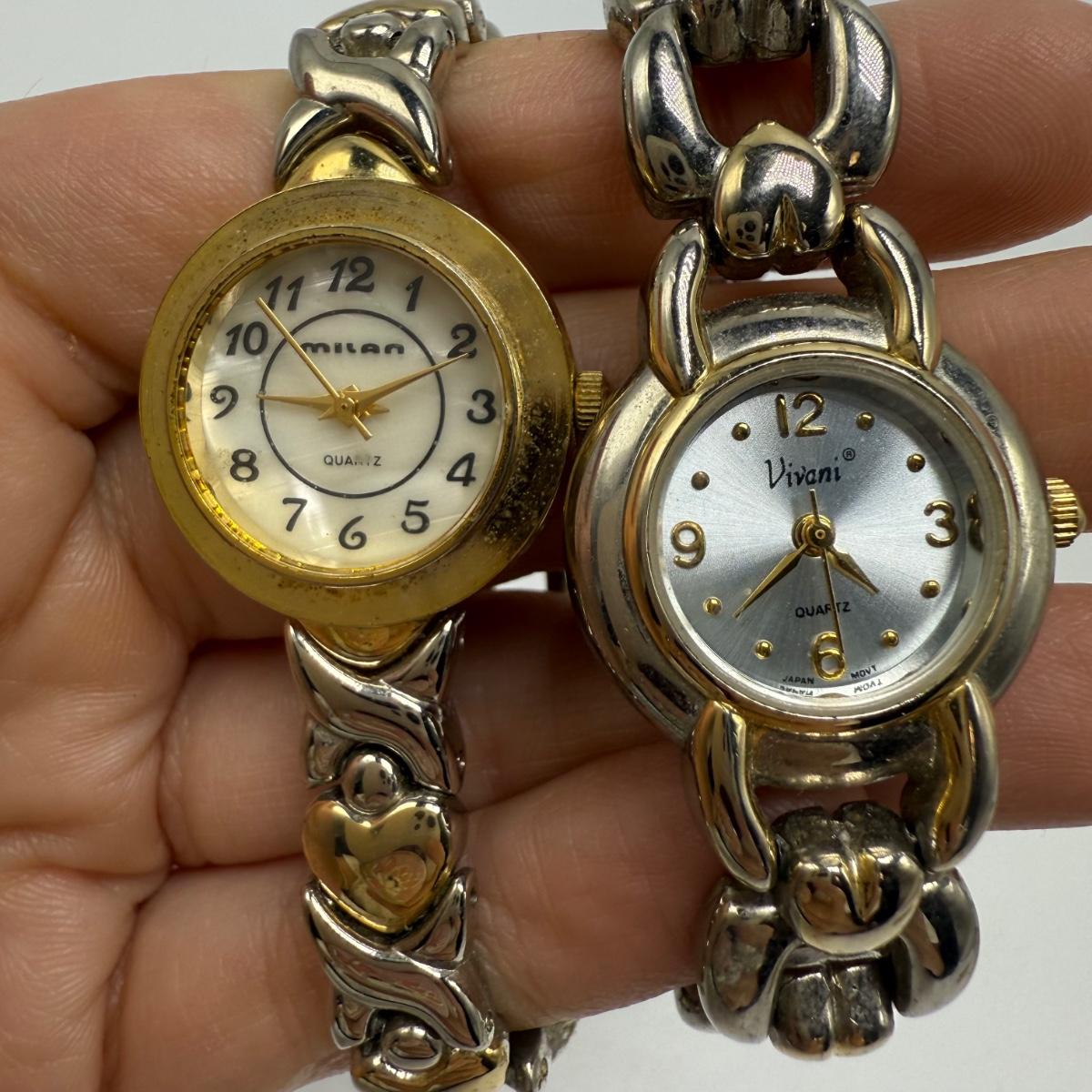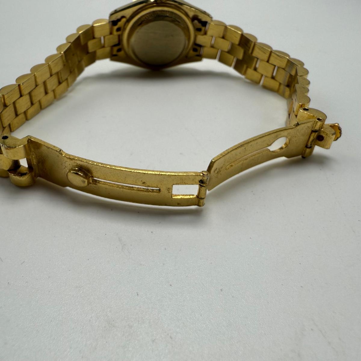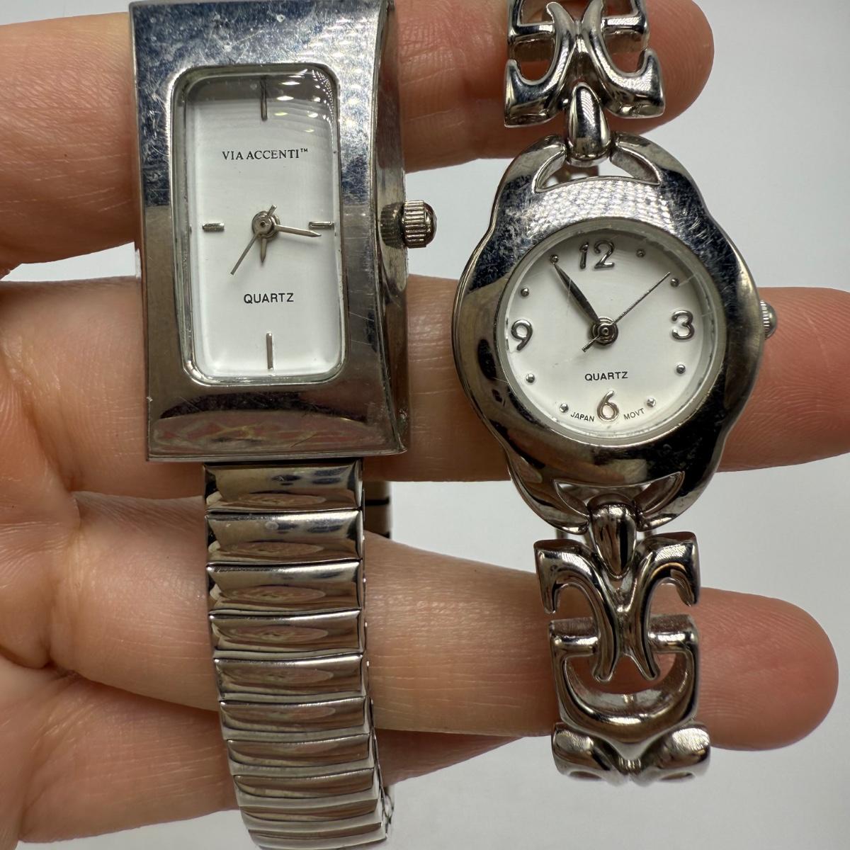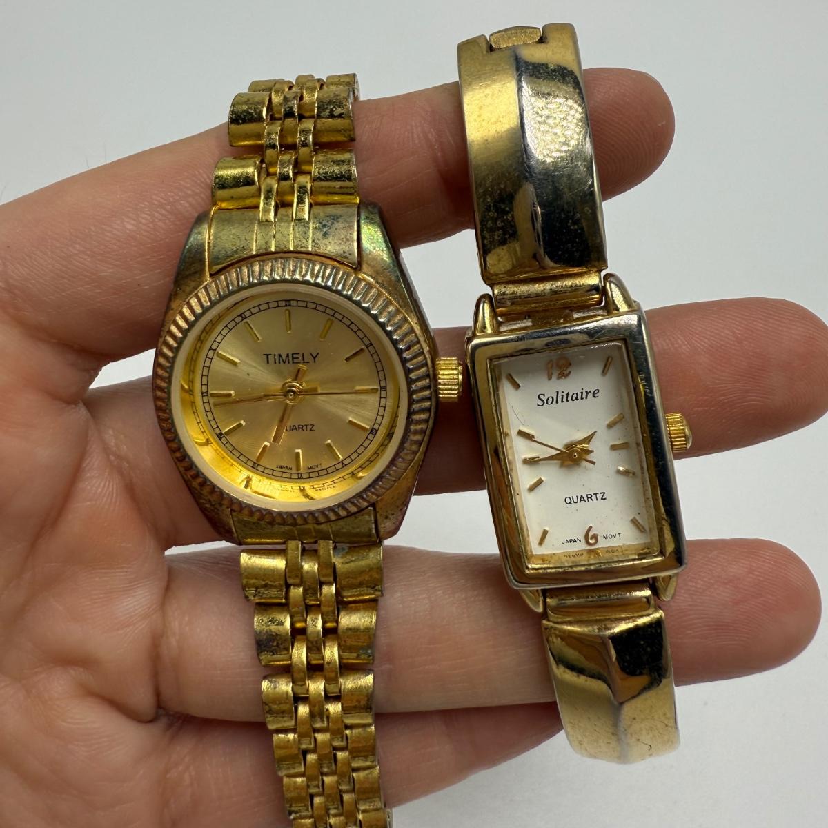 14 women’s watches, all with metal bands (some with clasps, some elastic). A fun and elegant variety from many different brands. Most appear to be in good condition, but some are worn. None are currently functioning. We do not believe the Rolex is authentic. Please see photos for inventory and details.