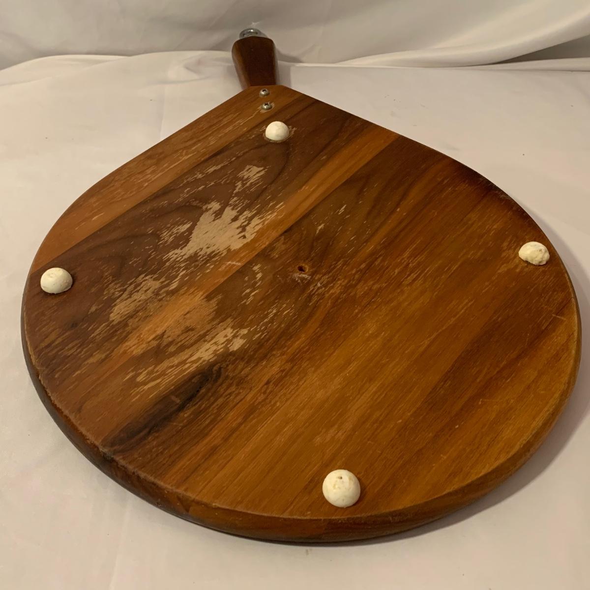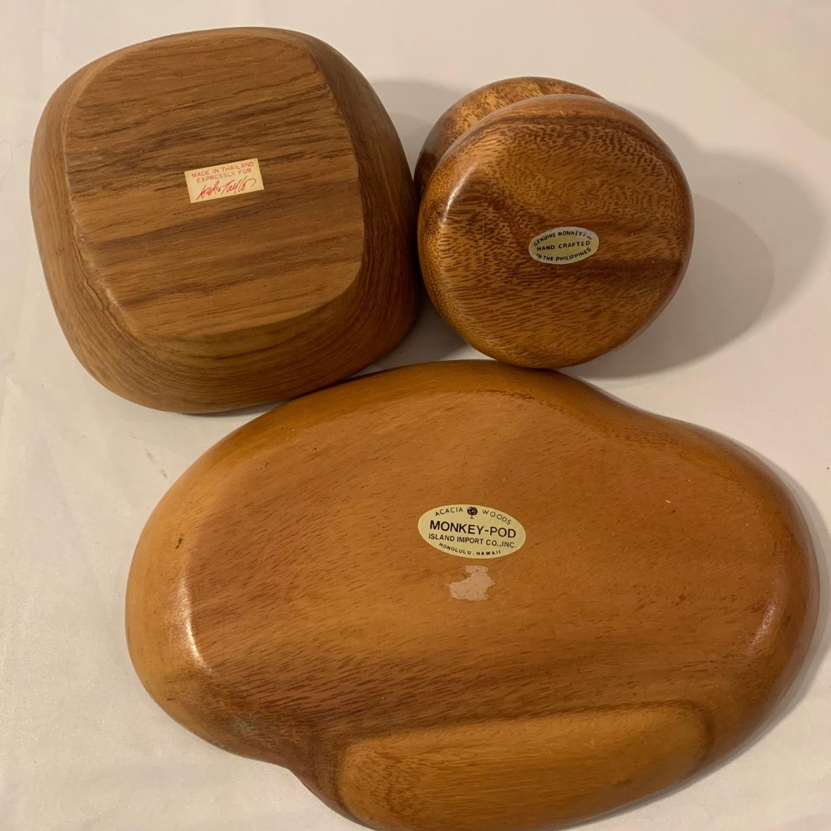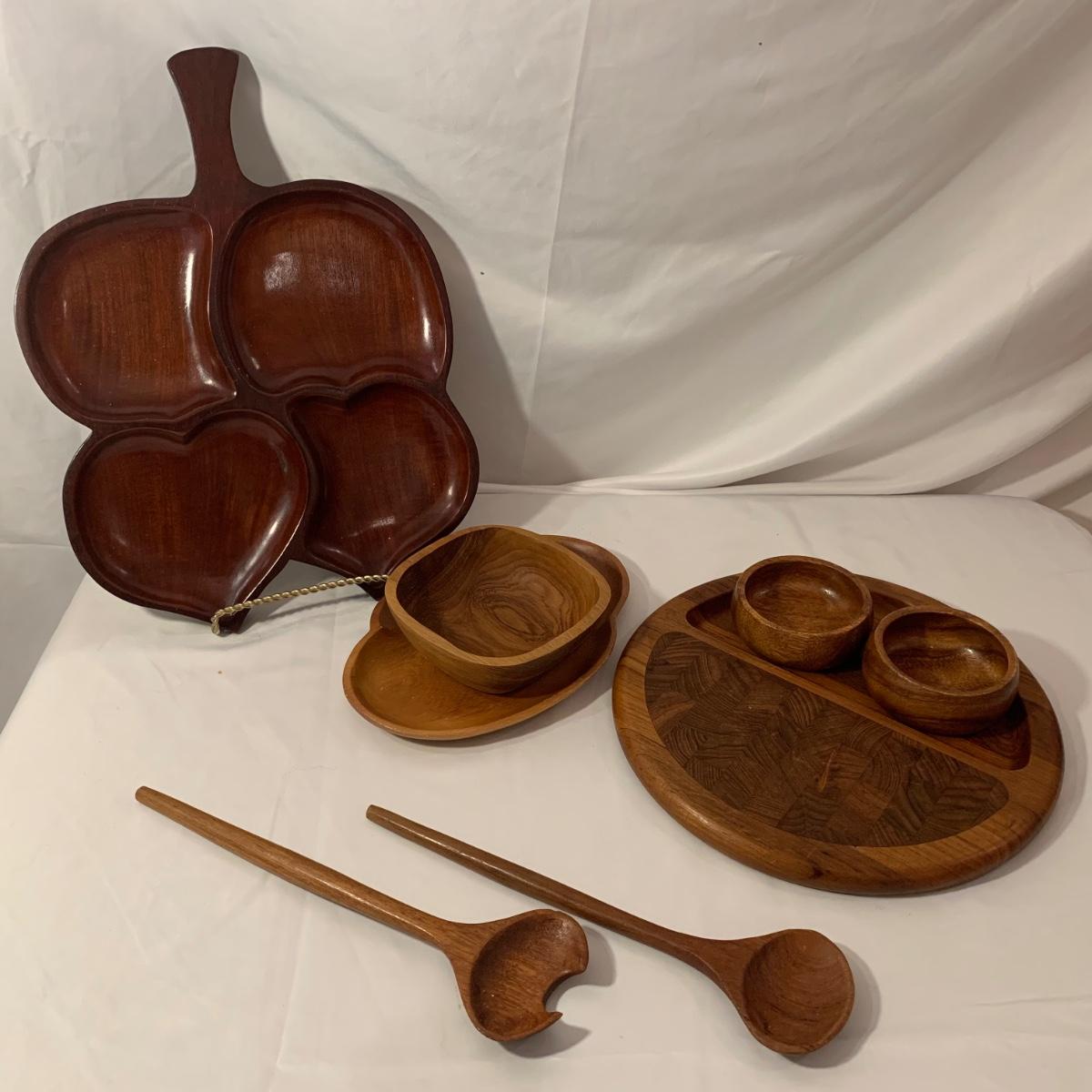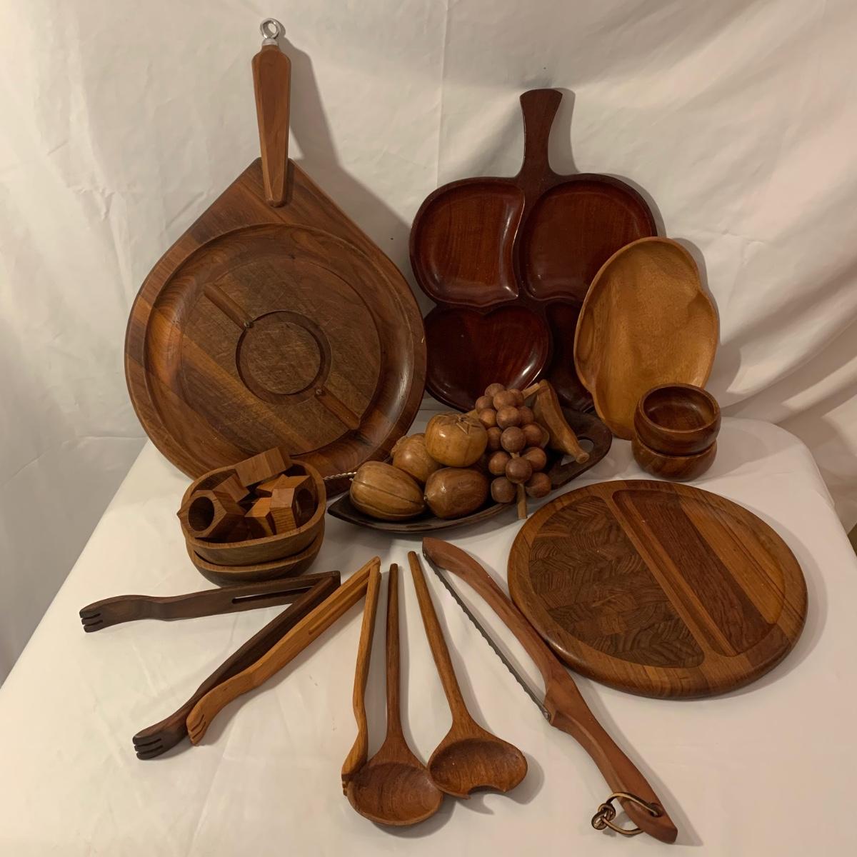 This lot features a variety of wood serving dishes from Hawaii, the Philippines, and Thailand. Lot includes large wooden pizza peel, two small salad bowls, two small sauce bowls, one acacia wood plate, one Dansk International cheese plate, cherrywood- like platter, wooden fruit and bowl, salad spoons, two salad tongs, and eight wood napkin rings. Pizza peel measures, 13.5”D x 2”H. Shipping available.