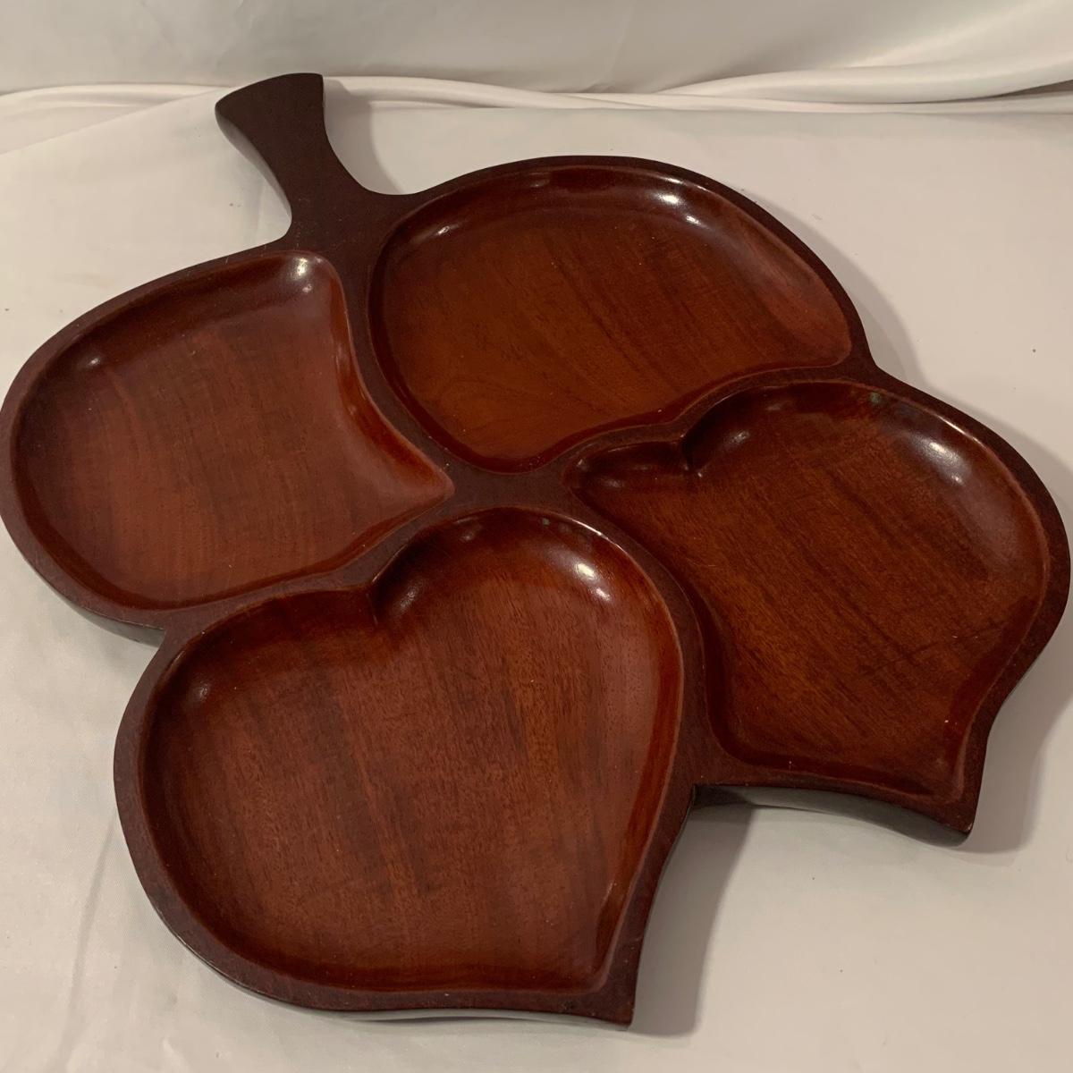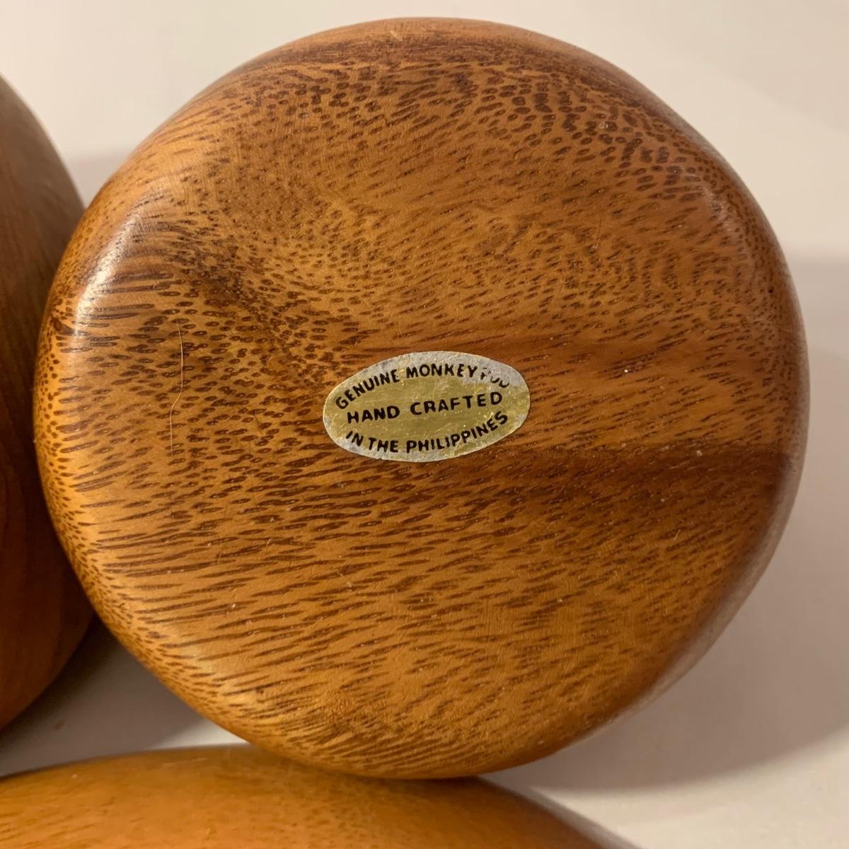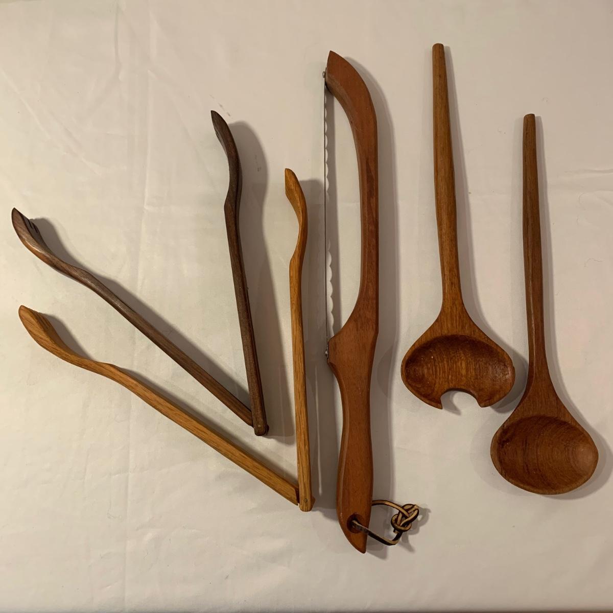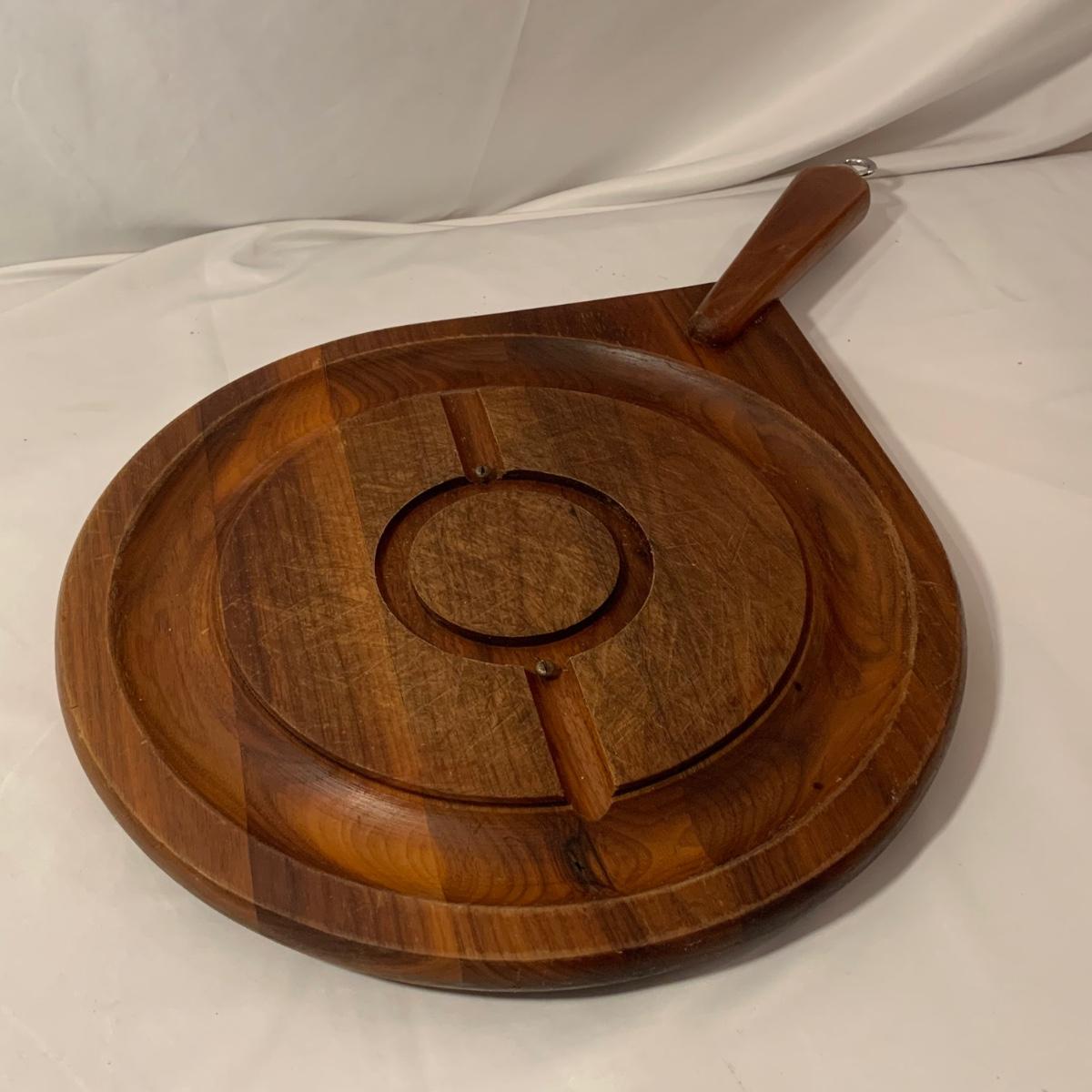This lot features a variety of wood serving dishes from Hawaii, the Philippines, and Thailand. Lot includes large wooden pizza peel, two small salad bowls, two small sauce bowls, one acacia wood plate, one Dansk International cheese plate, cherrywood- like platter, wooden fruit and bowl, salad spoons, two salad tongs, and eight wood napkin rings. Pizza peel measures, 13.5”D x 2”H. Shipping available.