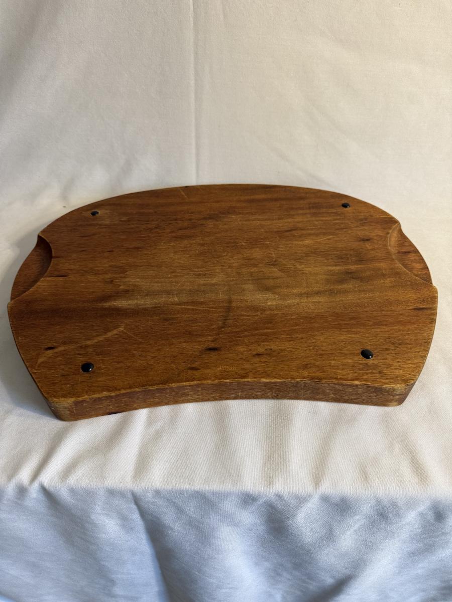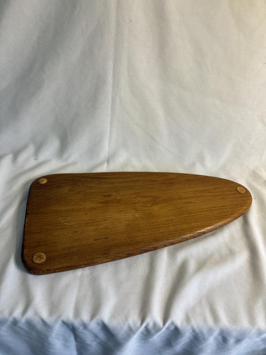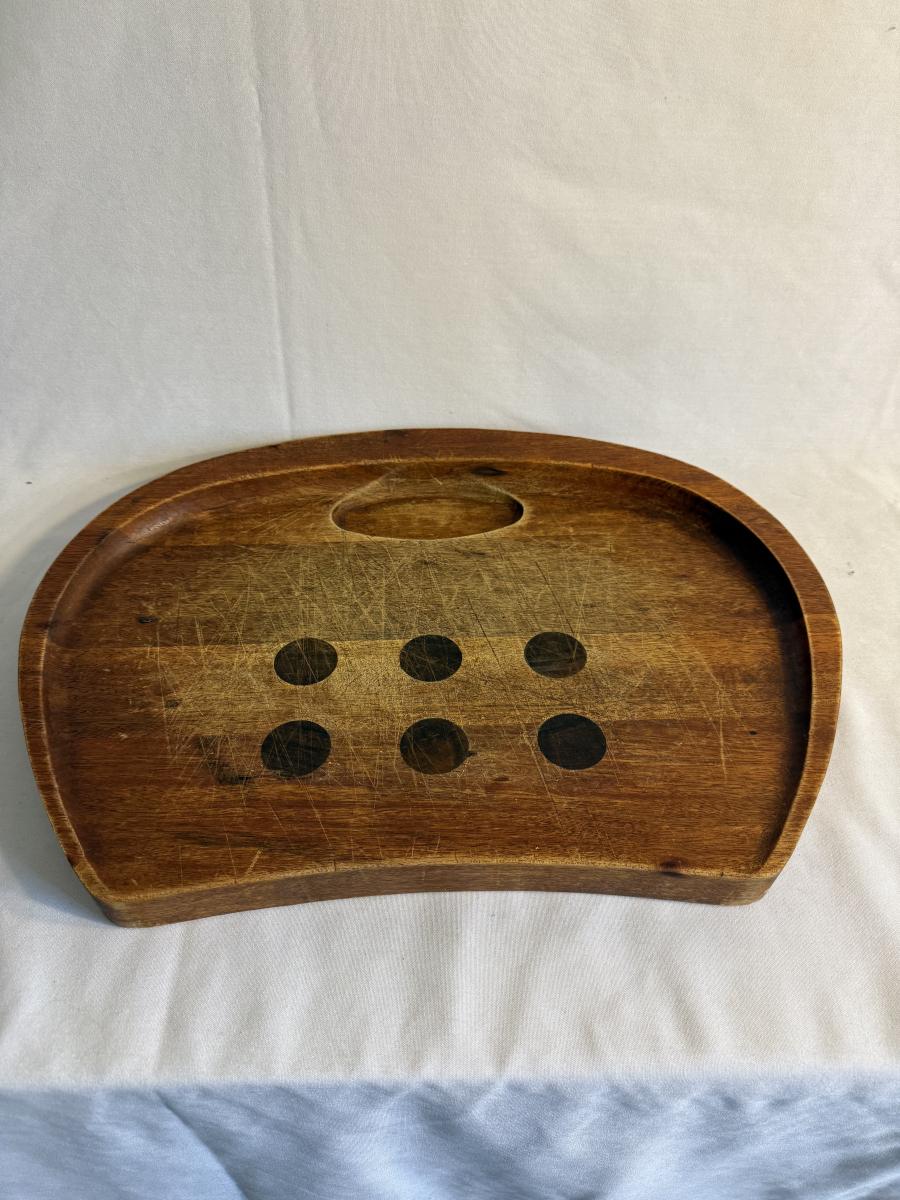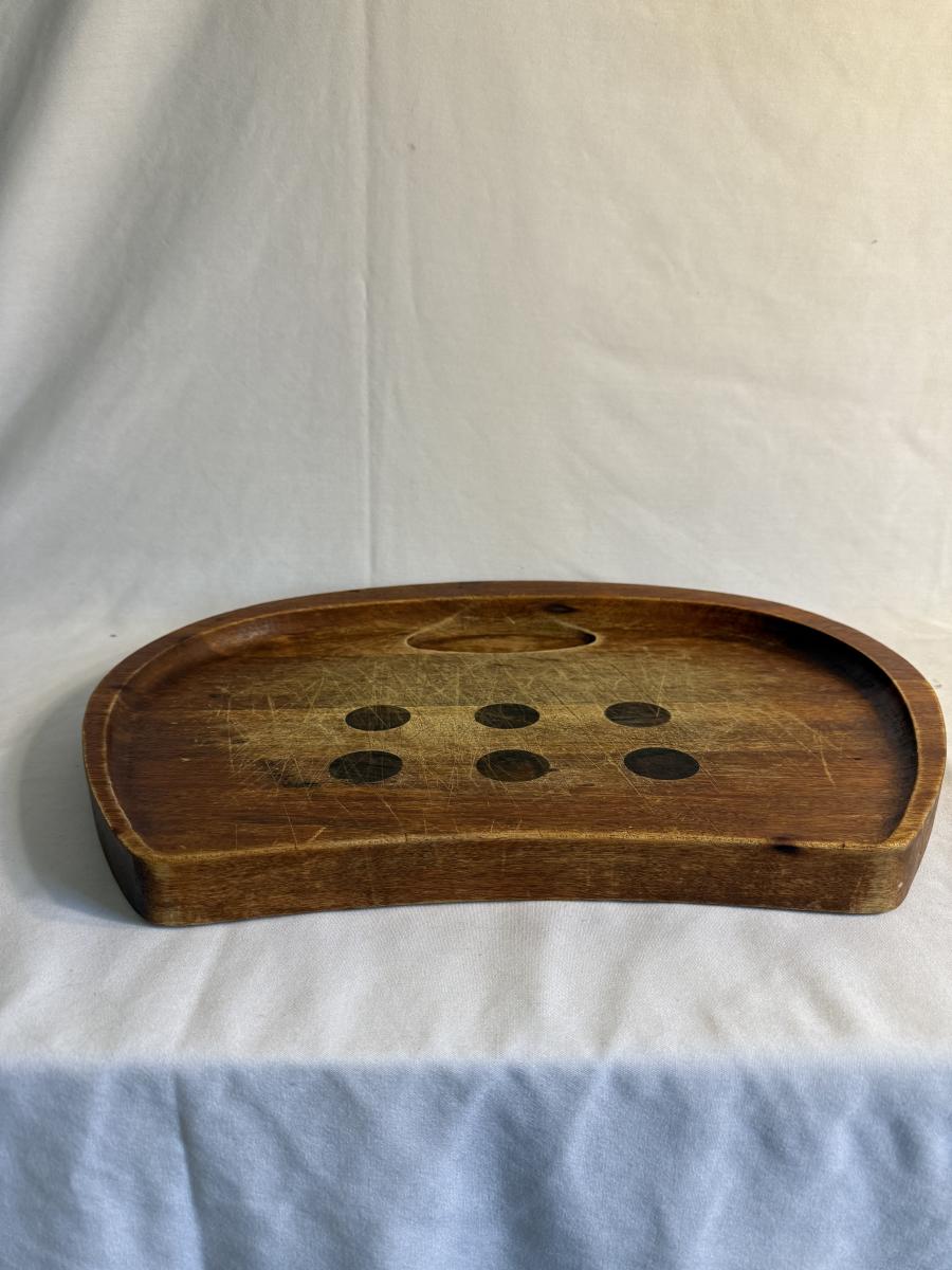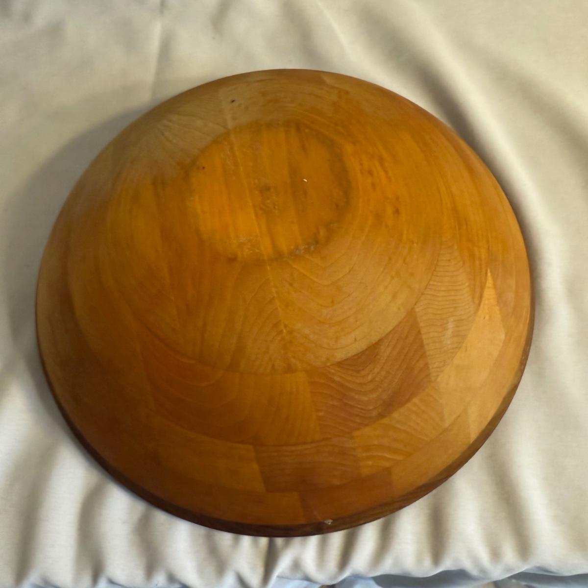This lot contains a total of five items which are a collection of wooden bowls, cutting boards, and a lazy Susan. In this collection we have two wooden bowls, the first is a taller, multicolored bowl. This one has an 11”D and stands 3.5”H. It is made of light wood with a dark wooden rim. The next bowl is a dark brown with sharp square edges. It measures 9”D x 2.5”H. Moving on, we have two cutting boards. The first is a triangular shape and appears to be a serving board. It has a groove to put a bowl or spread, and does appear to be well loved. This measures 20” x 10” at its widest. The next cutting board is a unique shape as well and appears to be a serving tray of some sort. It has two divots on either side for hands. It also has six dark wooden rim circles and another divot on the surface, assuming to hold something. The one measures 18” x 12” 1.25”H. The last item in this lot is a wooden lazy Susan. The top sits on a wooden base and the top piece has a ridge to keep things from slipping off. This item measures 12”D x 2”H. None of these items have any discerning marks or stamps. Shipping available. Shipping can be costly. We suggest contacting our preferred local shipping provider, Postage Express, with dimensions and getting an estimate before bidding: (828) 255-9250 or shipping@postageexpressnc.com.