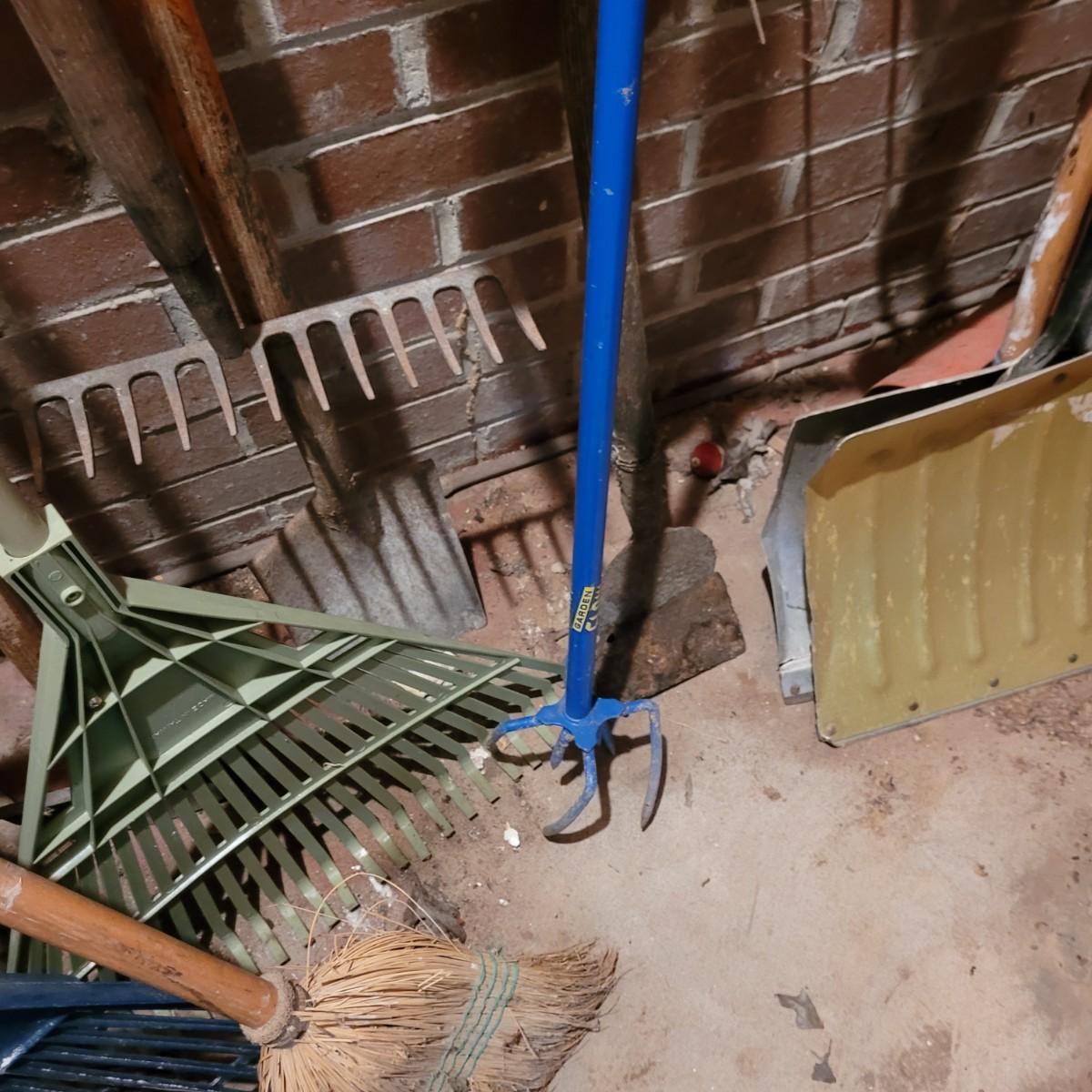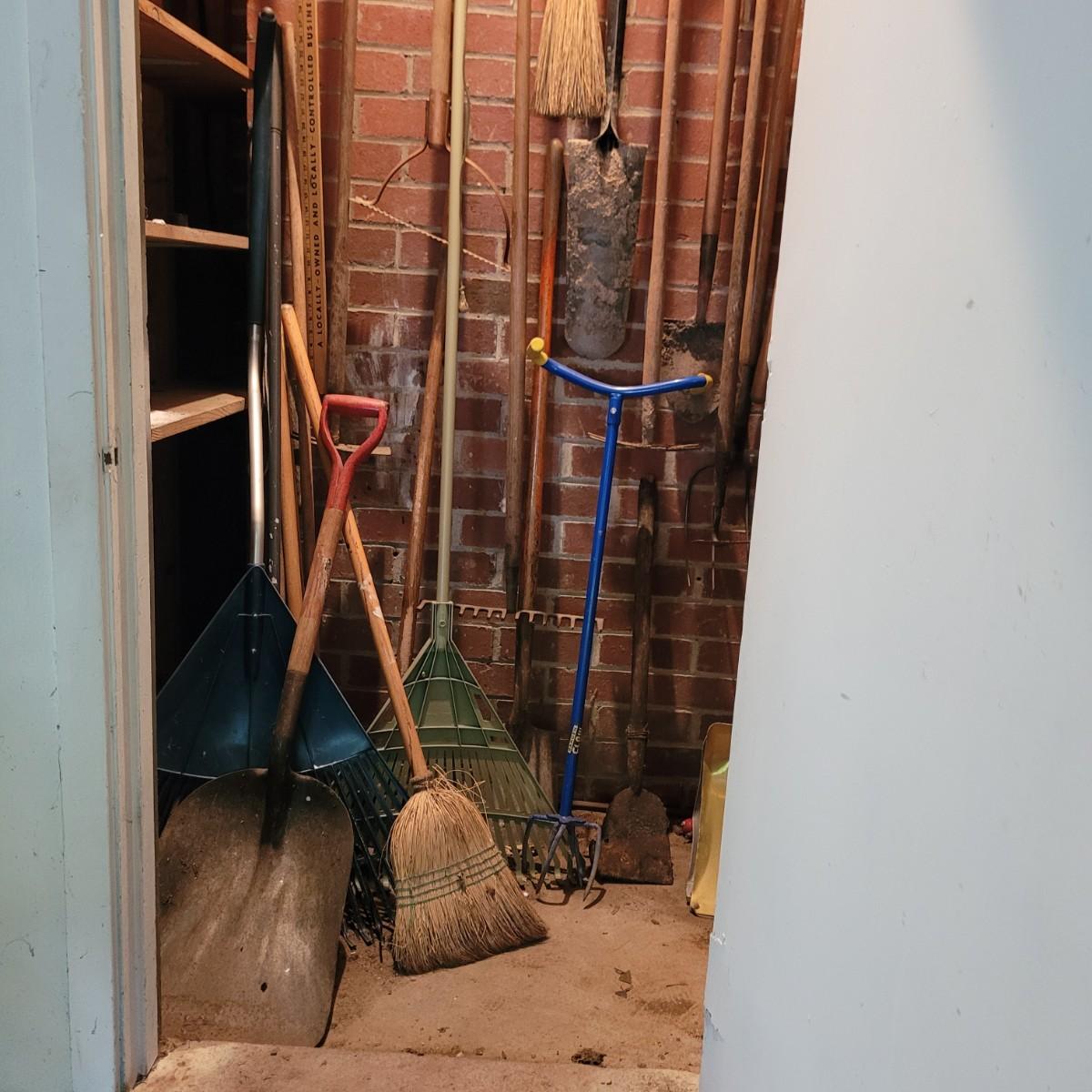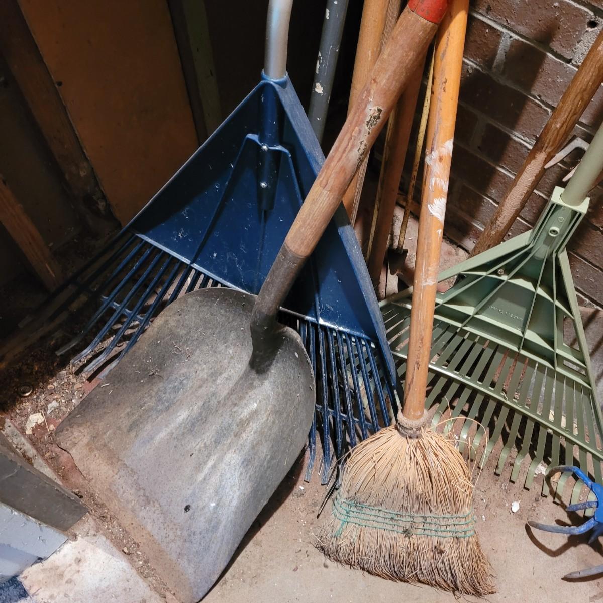 Set includes shovels (wide, narrow, spaded, flat, trench), plastic and metal rakes, broom, hoe, forks, picks, tree trimmer, post hole digger, & more. Local pick up only.