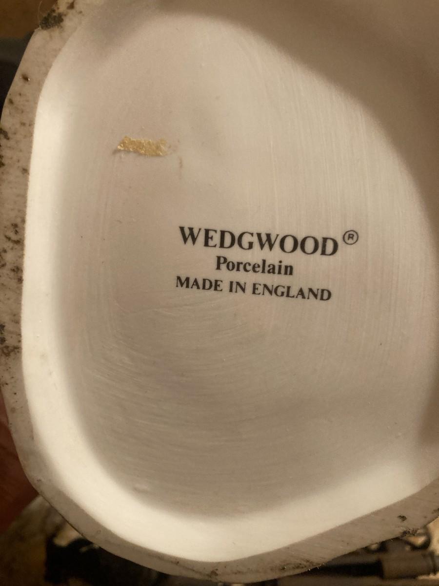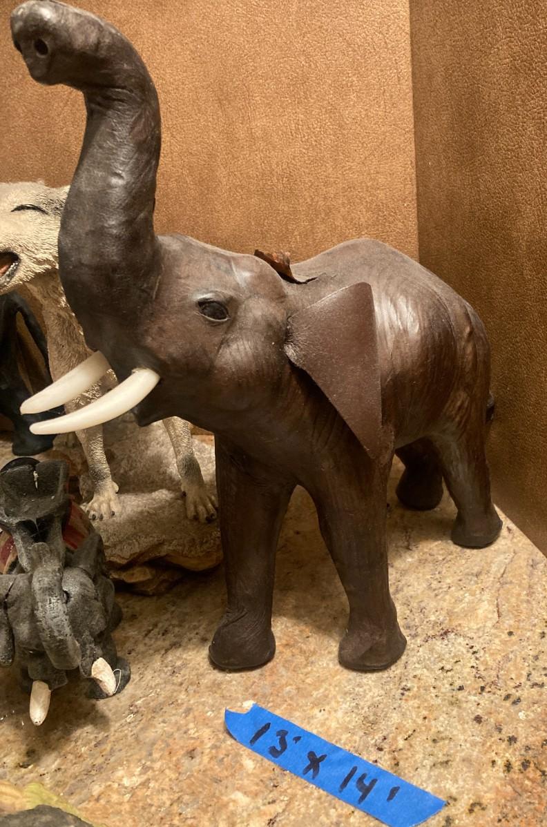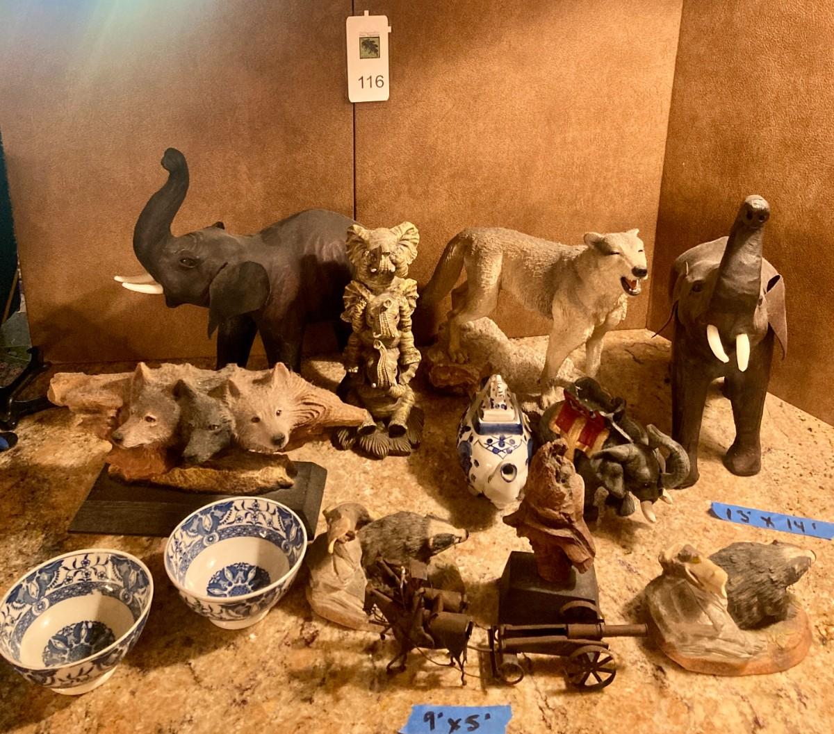 Grouping of animal figurines including hide skin elephants, resin wolf, pair of Wedgwood porcelain badgers (one having a piece missing), blue and white bowls, teapot signed and numbered