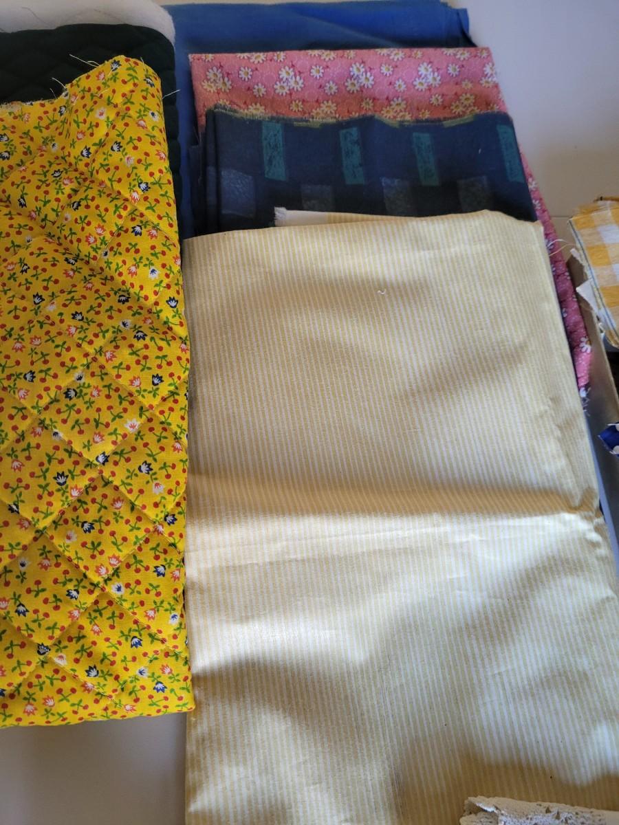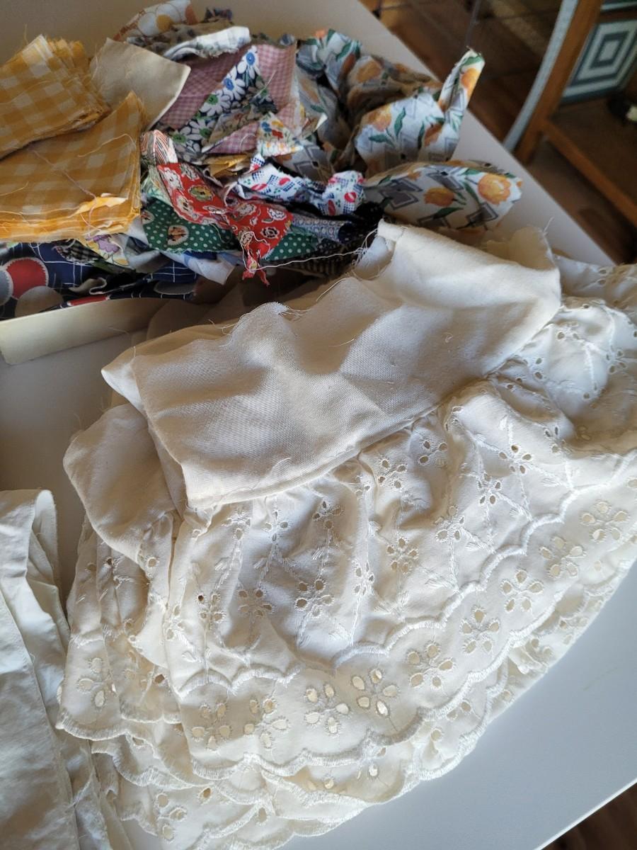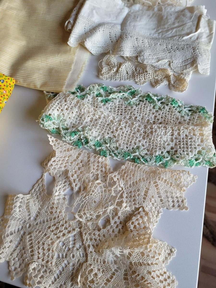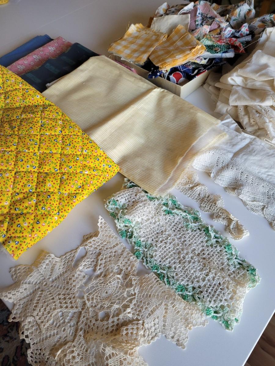 Various pieces, lace, doilies, quilted pieces, cotton fabric