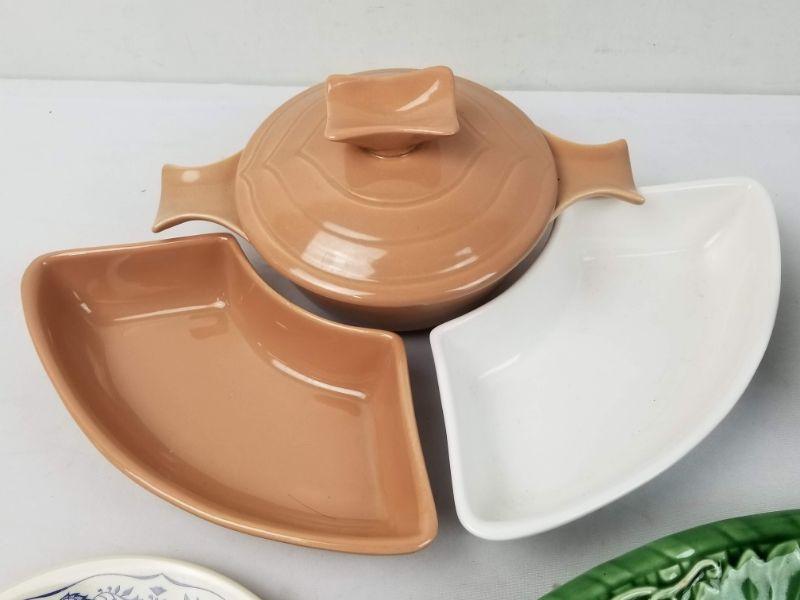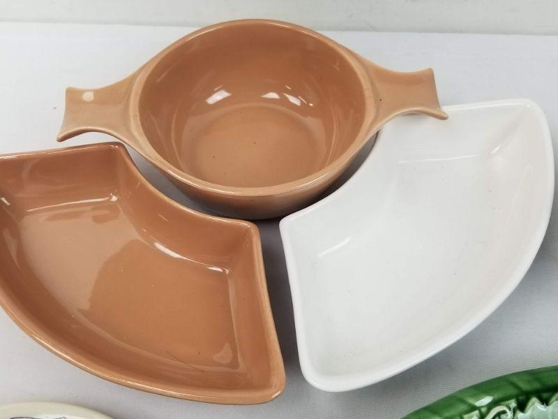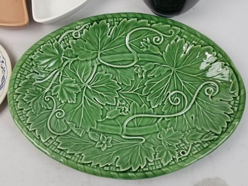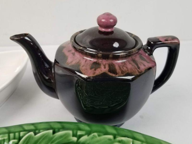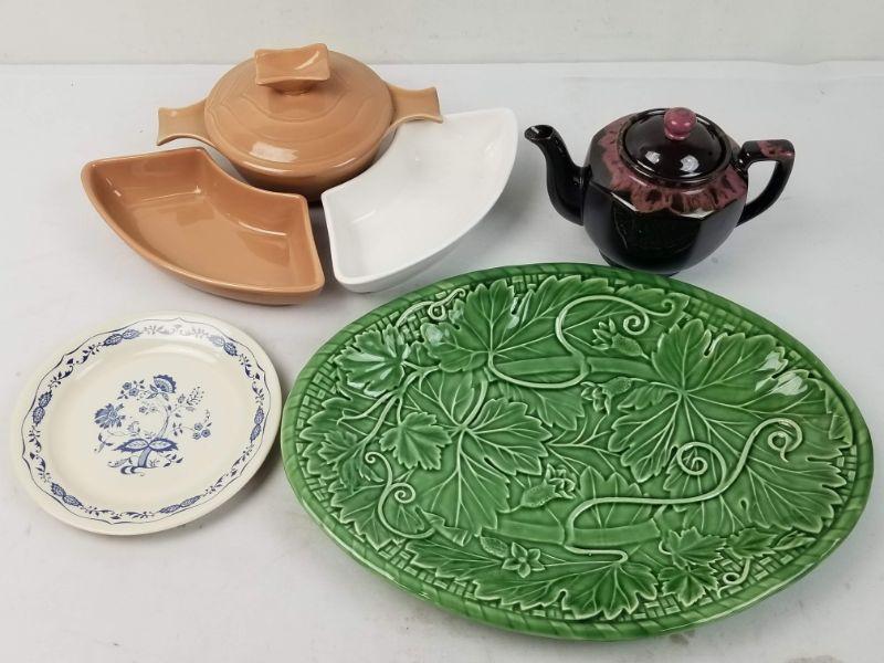 Various Ceramic Dishes Lot: Serving Dishes, Tea Pot, Green Platter (Repaired)