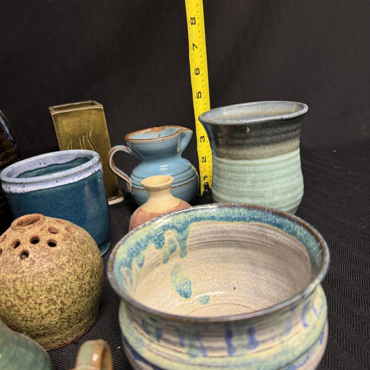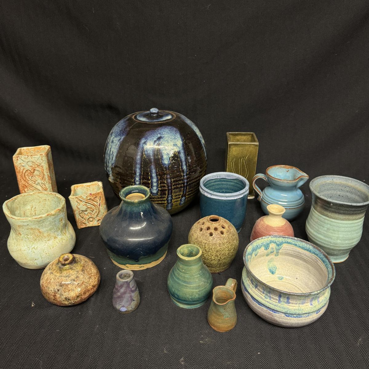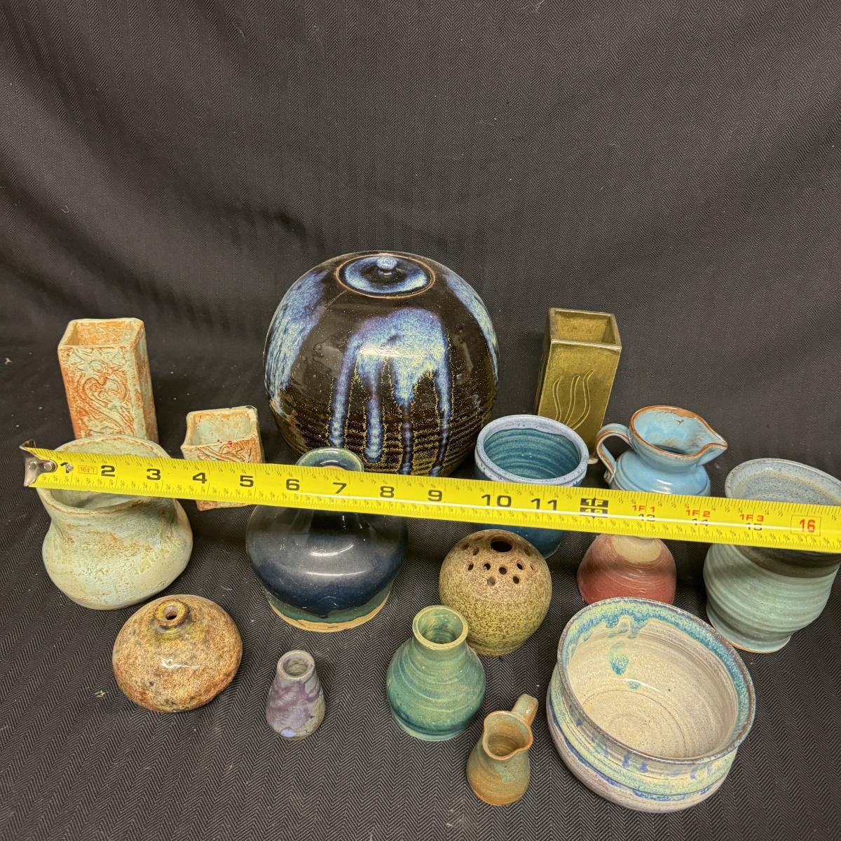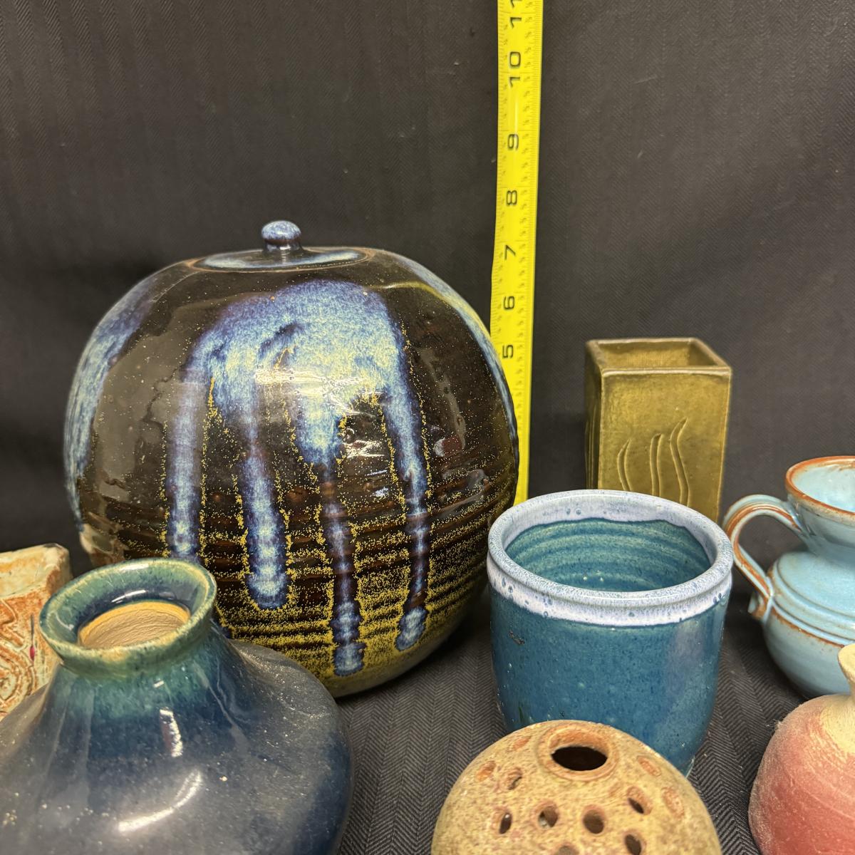 Many ceramic pieces in all shapes and sizes. Largest being a lidded pot. Some pieces are signed. See photos. Sixteen pieces in all. Shipping available.