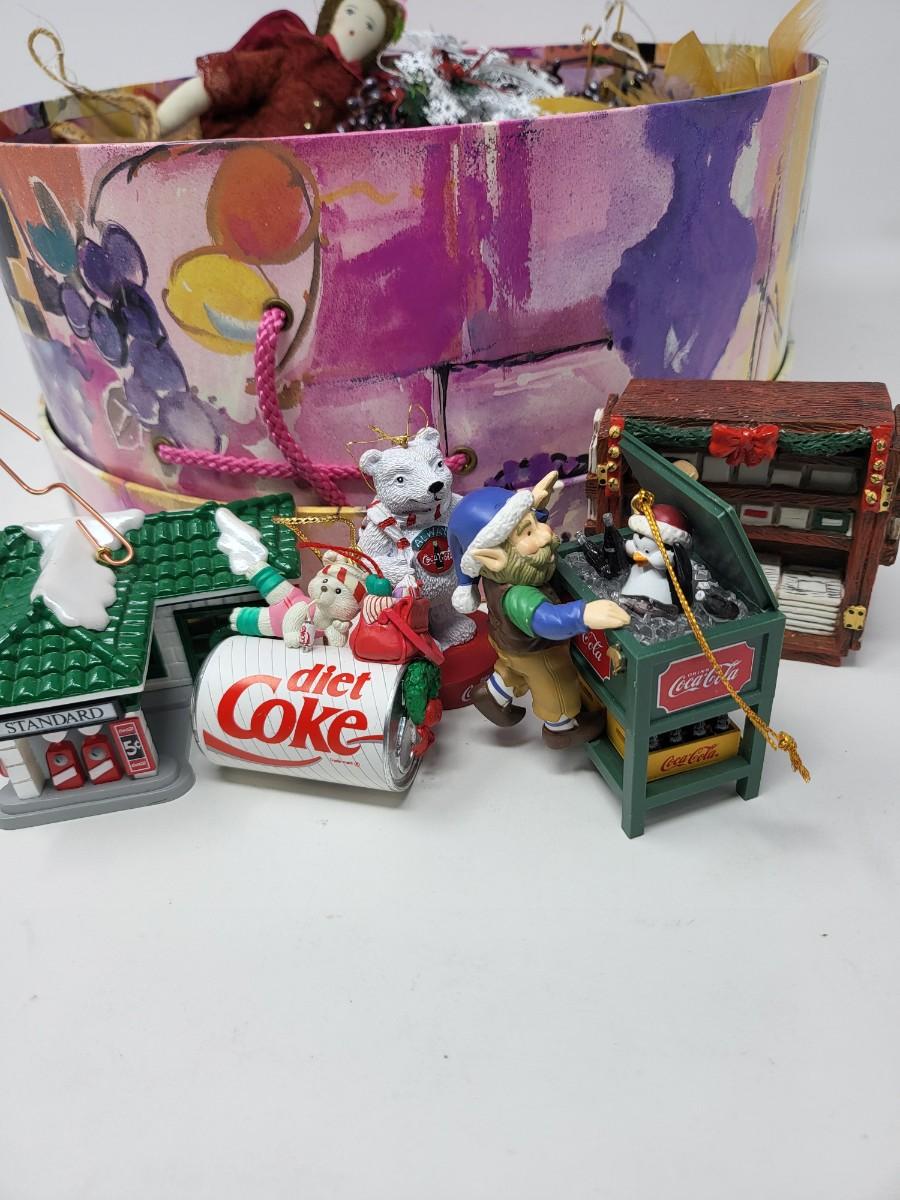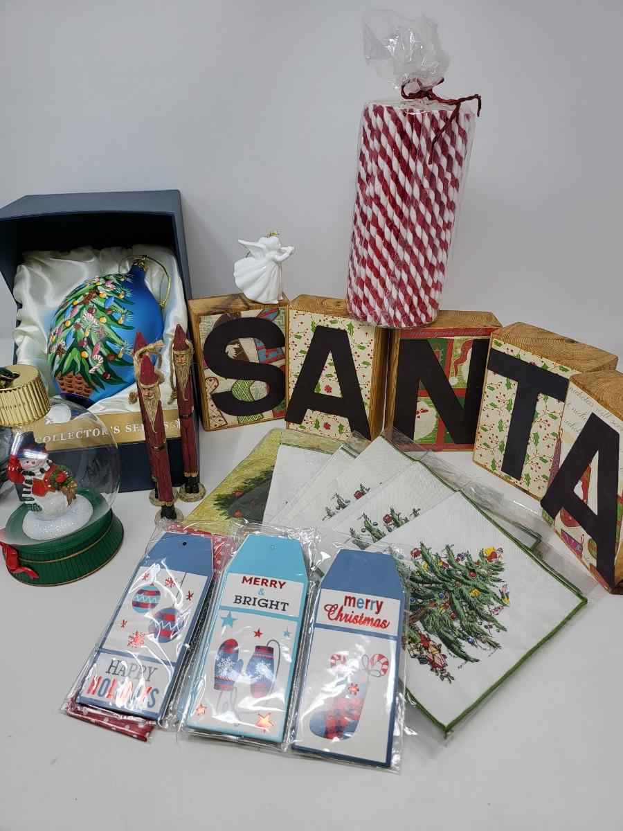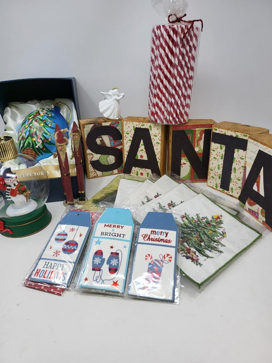 Candle, various ornaments including Barbie, Coca- Cola, Hallmark, greeting cards, napkins, wood SANTA decor, gift tags & more. Shipping not available for this lot.