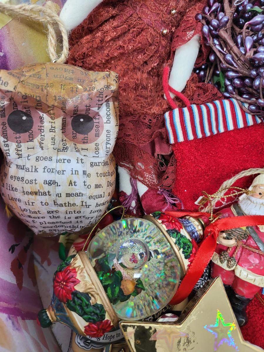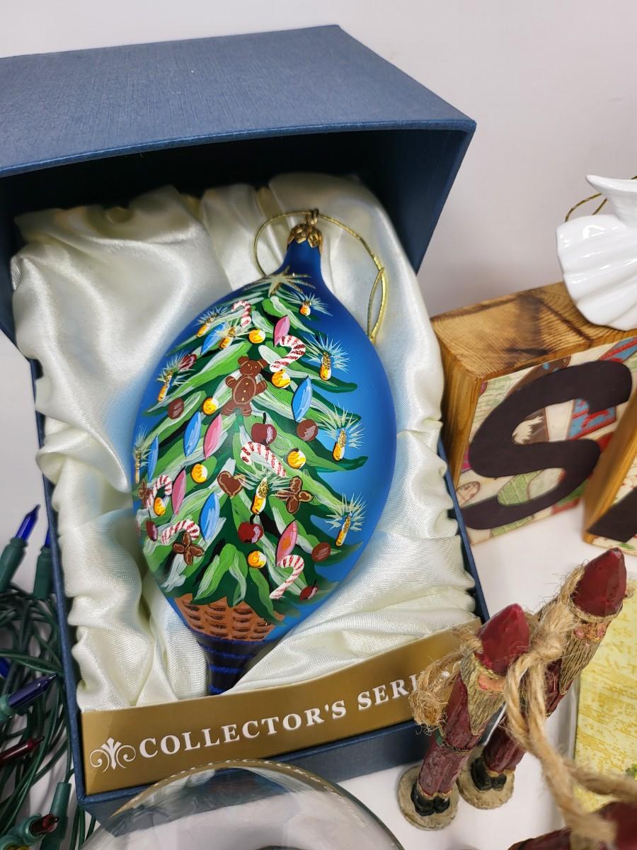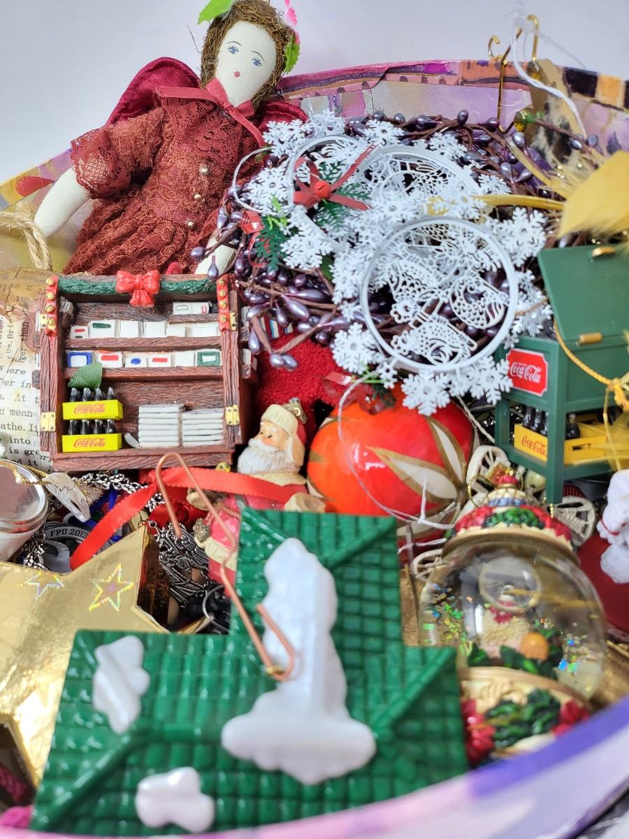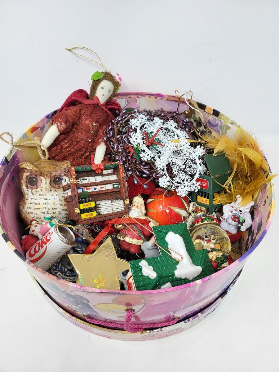 Candle, various ornaments including Barbie, Coca- Cola, Hallmark, greeting cards, napkins, wood SANTA decor, gift tags & more. Shipping not available for this lot.