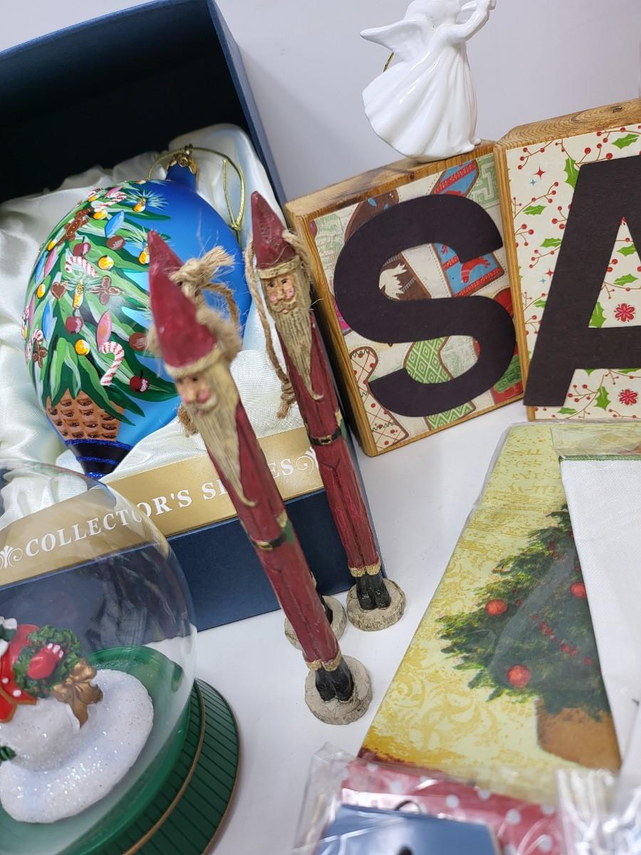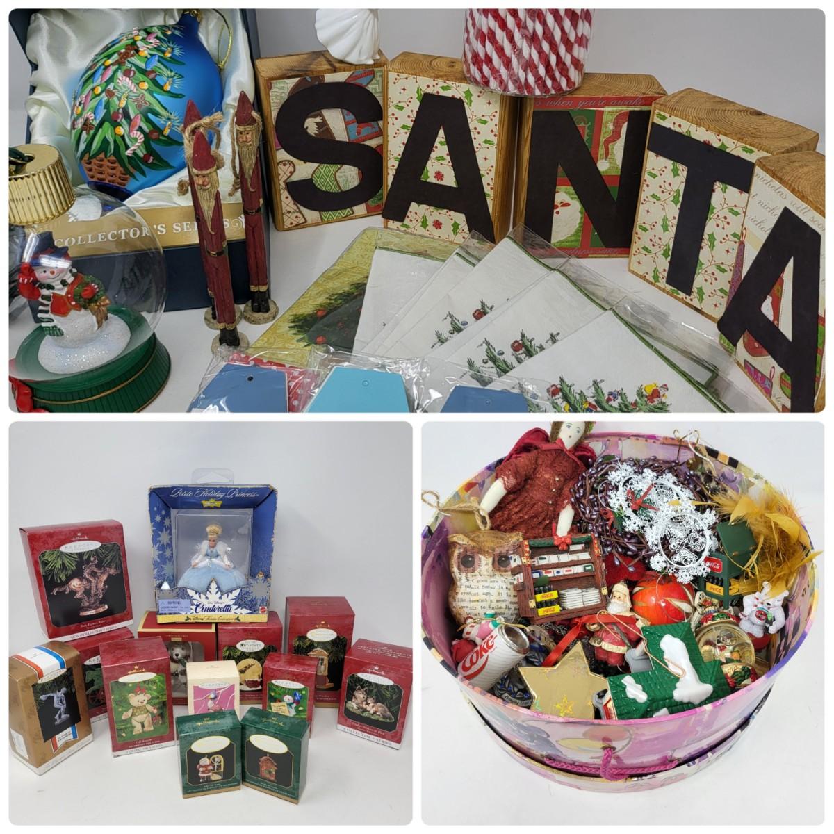 Candle, various ornaments including Barbie, Coca- Cola, Hallmark, greeting cards, napkins, wood SANTA decor, gift tags & more. Shipping not available for this lot.