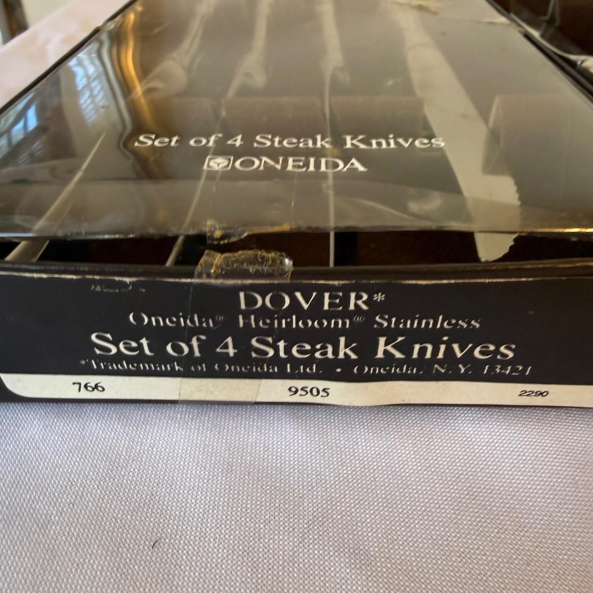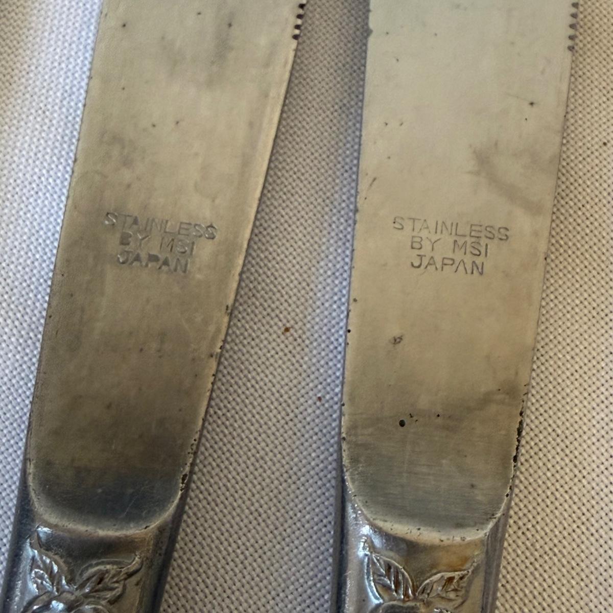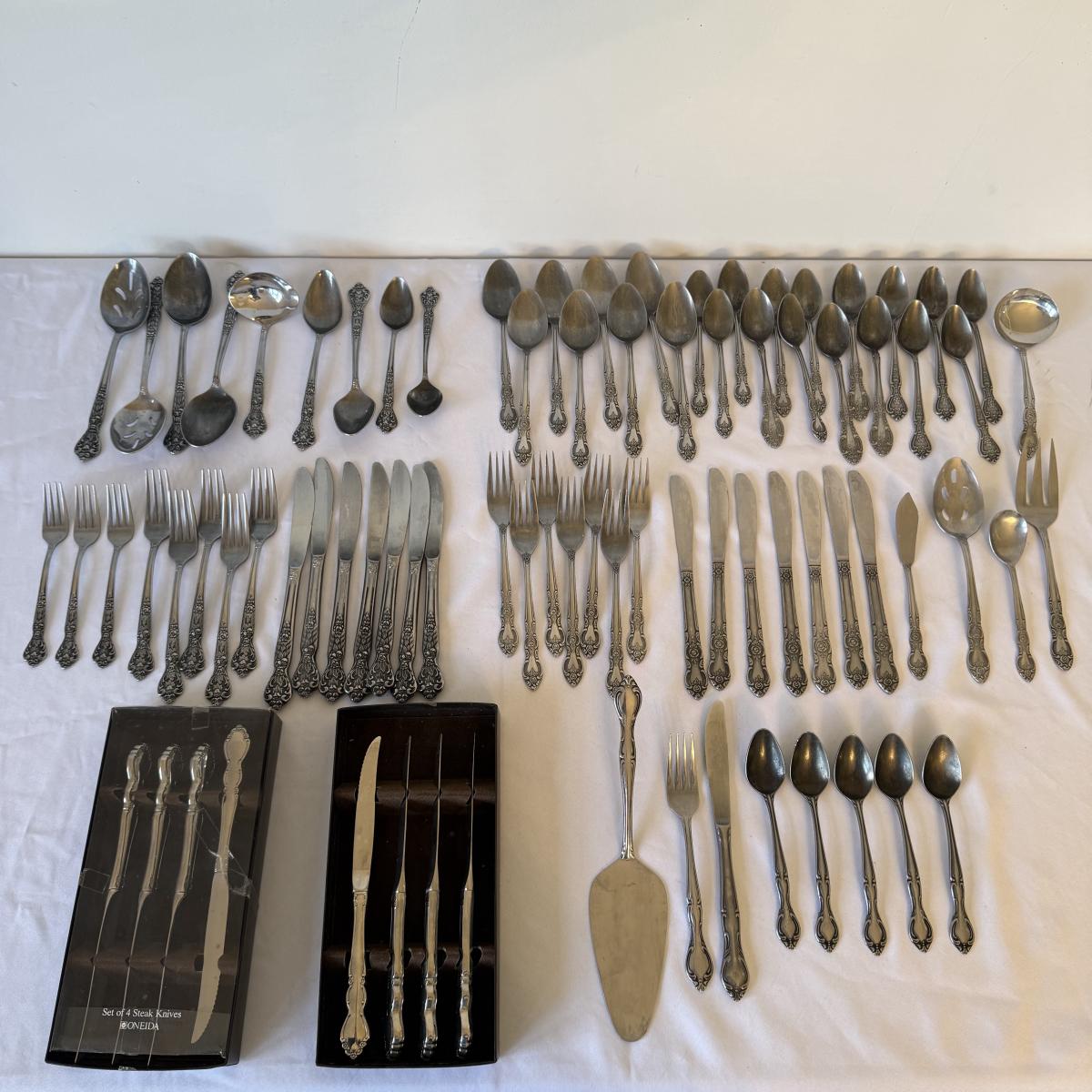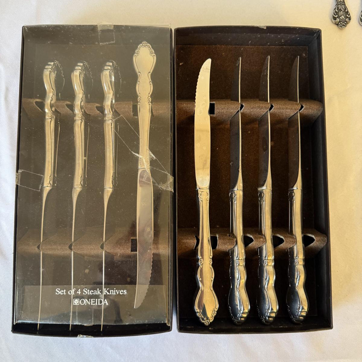 This lot includes flatware from multiple different sets. The MSI Japan “Versailles” pattern has three salad forks, five dinner forks, seven knives, two each of teaspoons and soup spoons, and five serving spoons. The Imperial “Fleurette” set has seven dinner forks, seven knives, six teaspoons, eight soup spoons, and five serving utensils. There are two sets of four Oneida “Dover” steak knives in their original boxes. A very small group of Hampton Court flatware includes one knife, one fork, five spoons, and a pie server. Five Normandy teaspoons and four Springtime Japan teaspoons are included as well. Some wear/age seen on the sets.