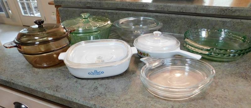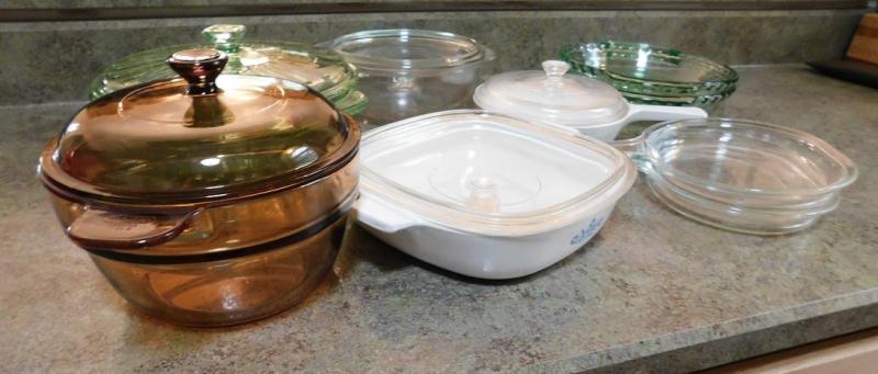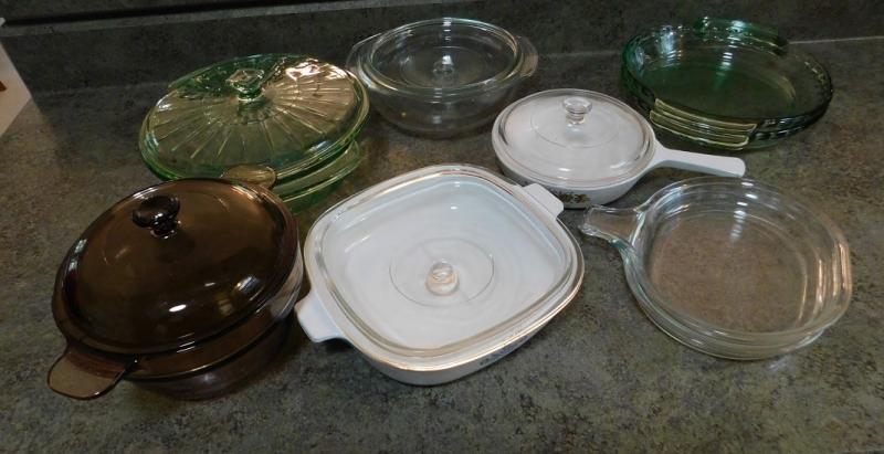 Various Glass Baking and Pie Dishes Including Pyrex and Corning Ware. Nice selection of color and style.