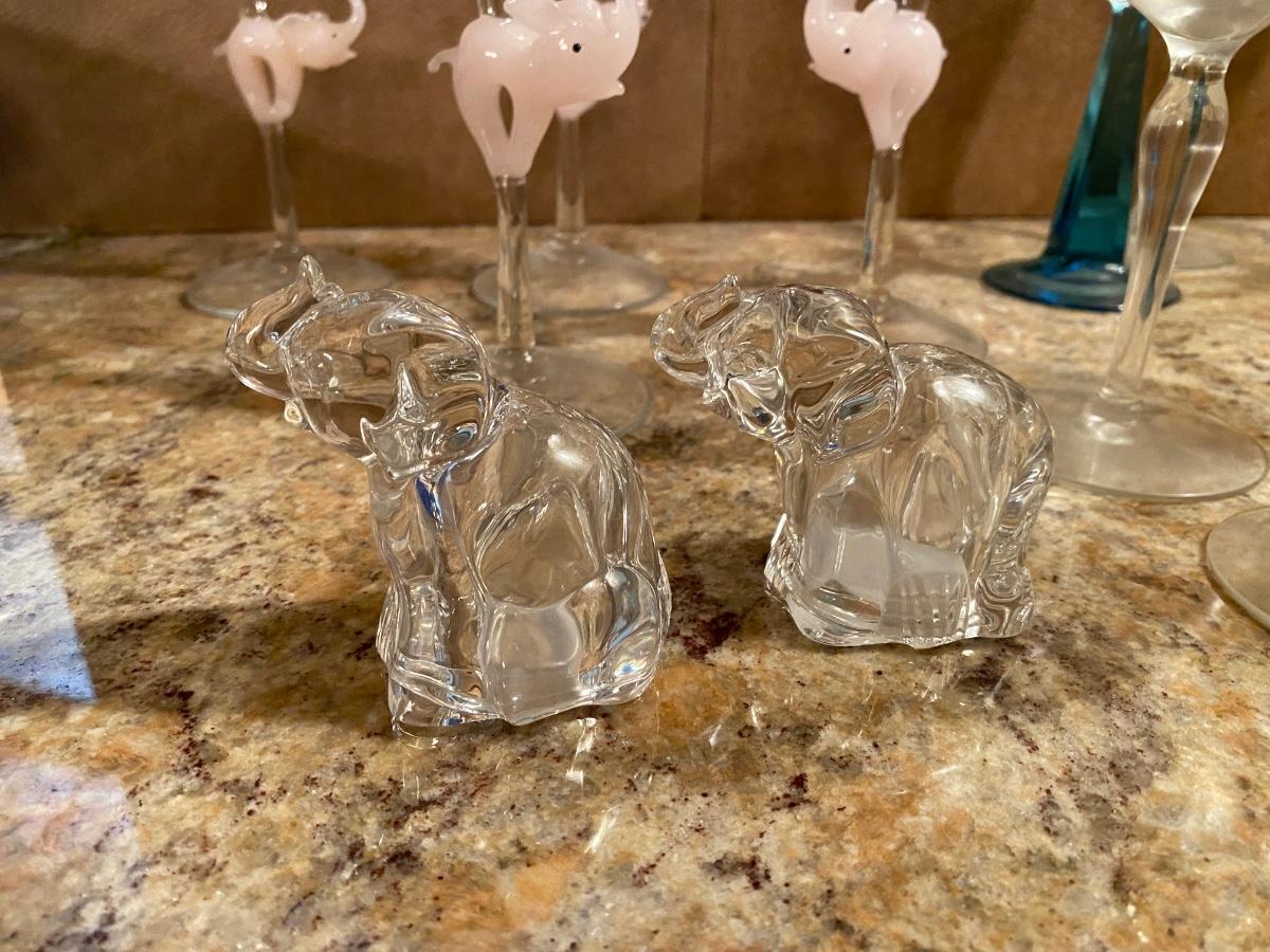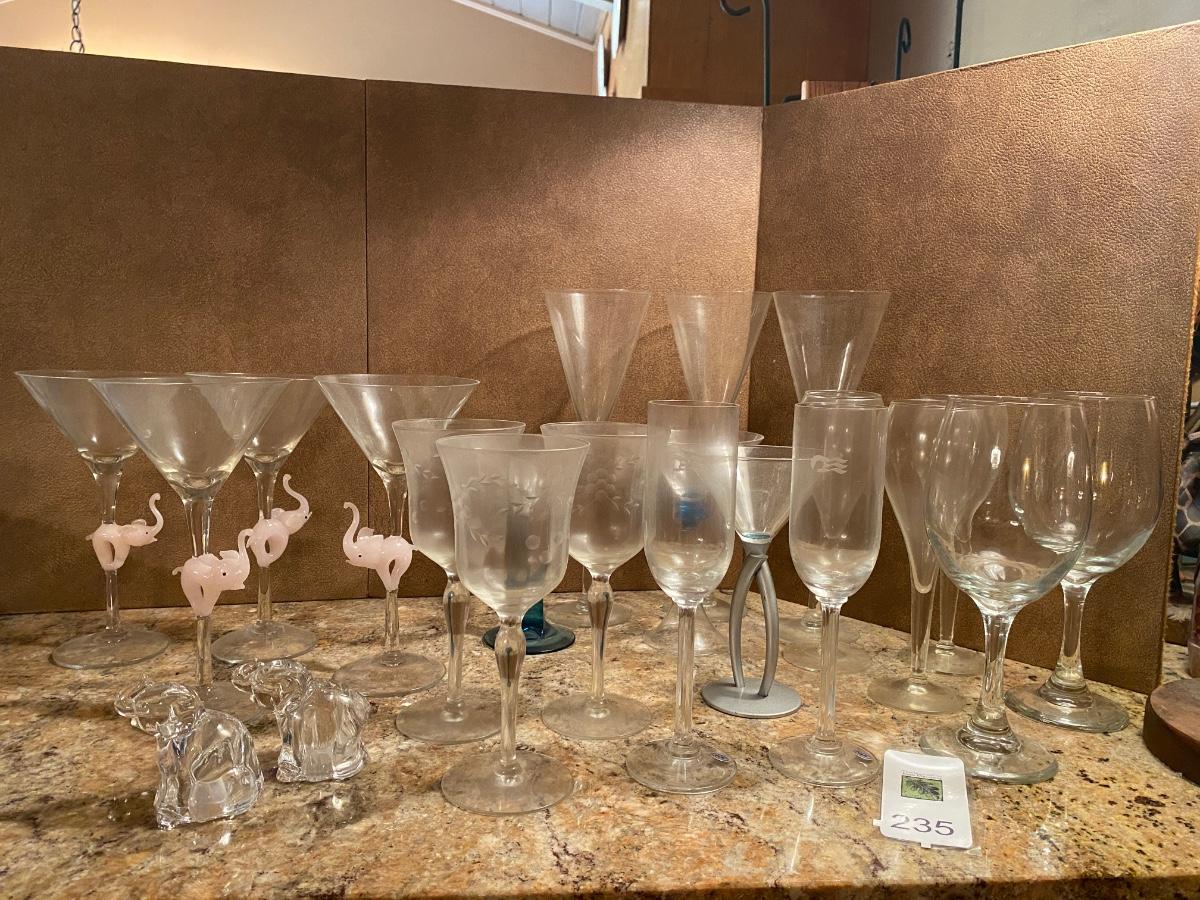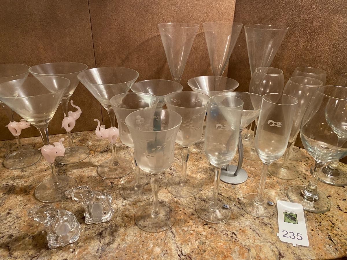 Collection of various glassware. Tall champagne flutes 12”. Small etched glasses 8”.