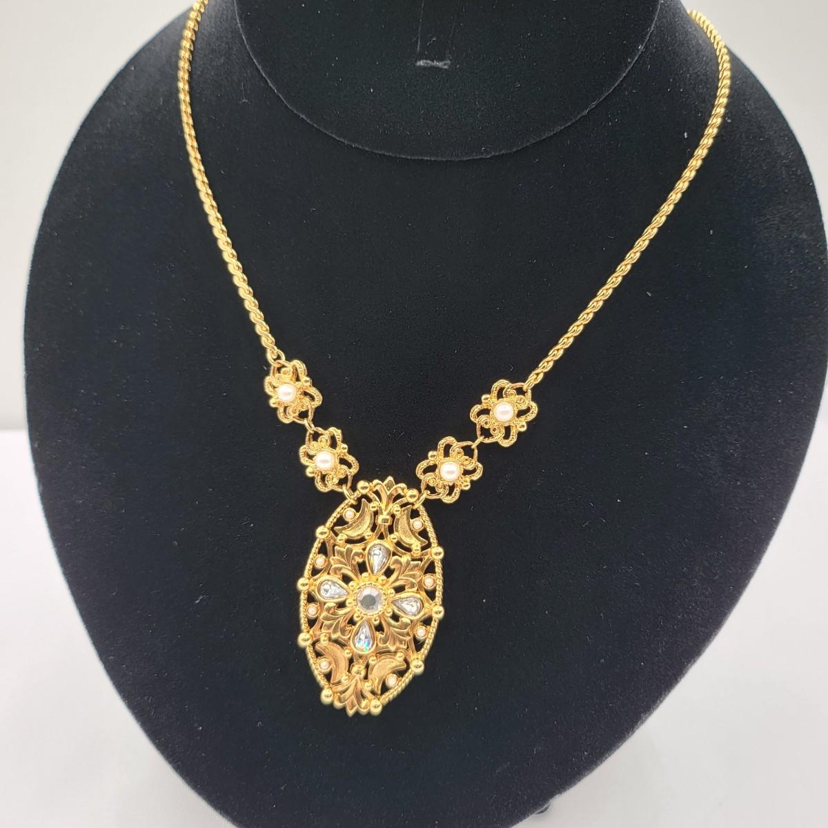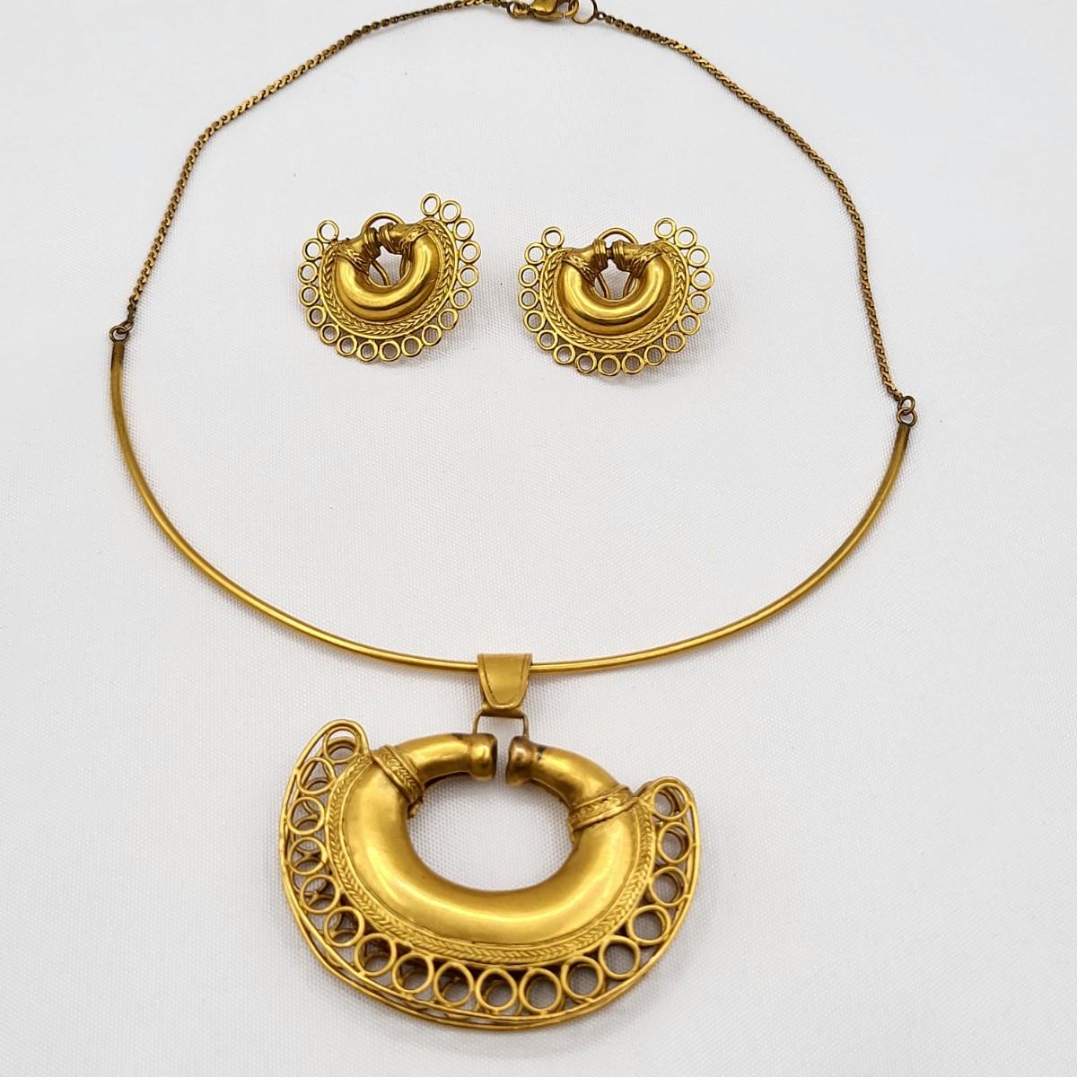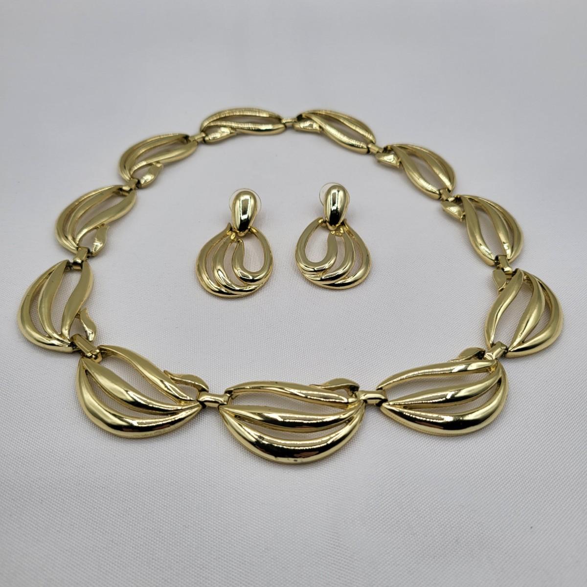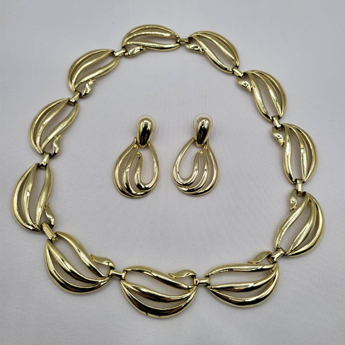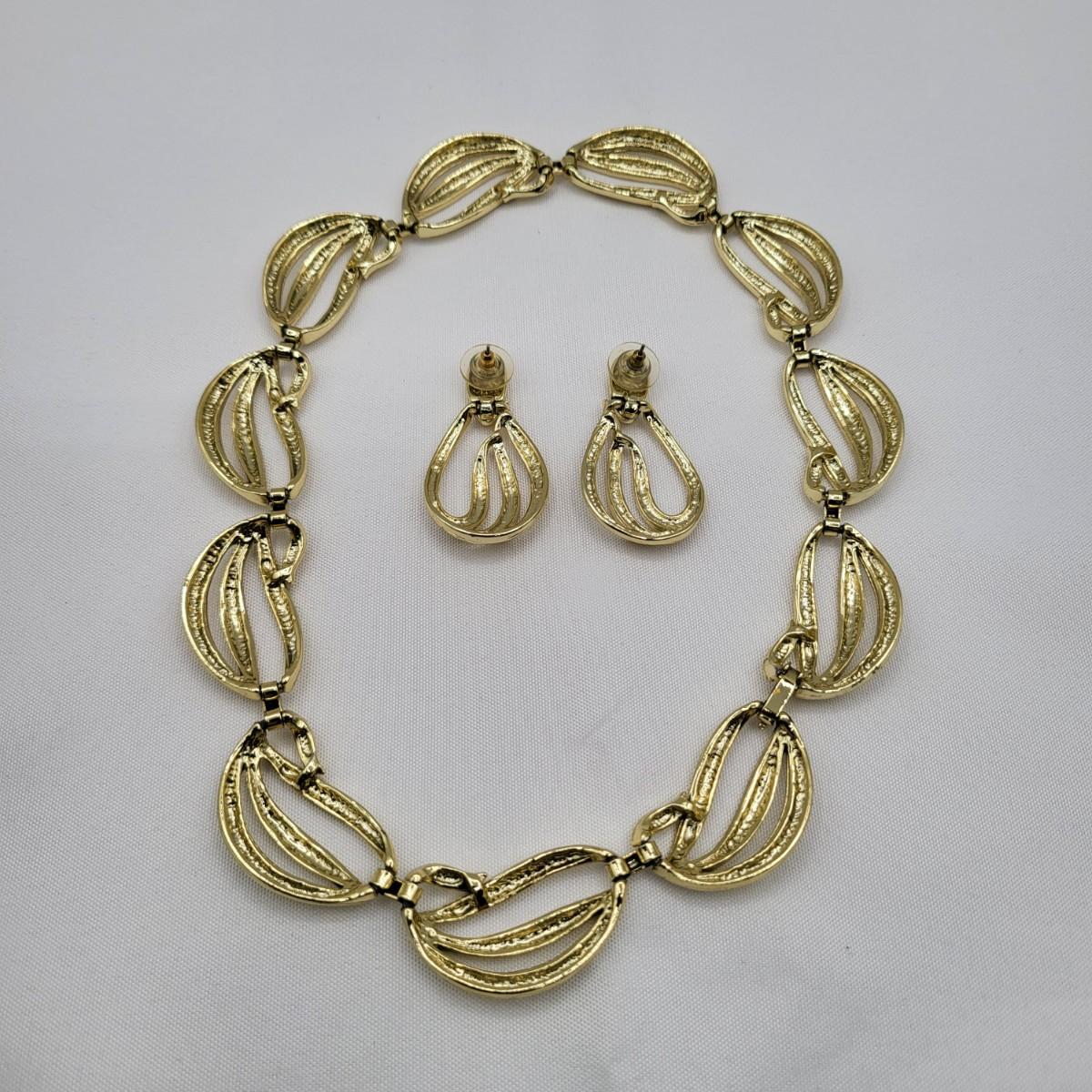 Open swirl link 16" choker & 2" long pierced earrings set. Clear stone & faux pearl 16" drop pendant necklace signed Aconda (2" extender included). Tribal-inspired crescent pendant 12" collar necklace & matching pierced earrings, matte gold tone.