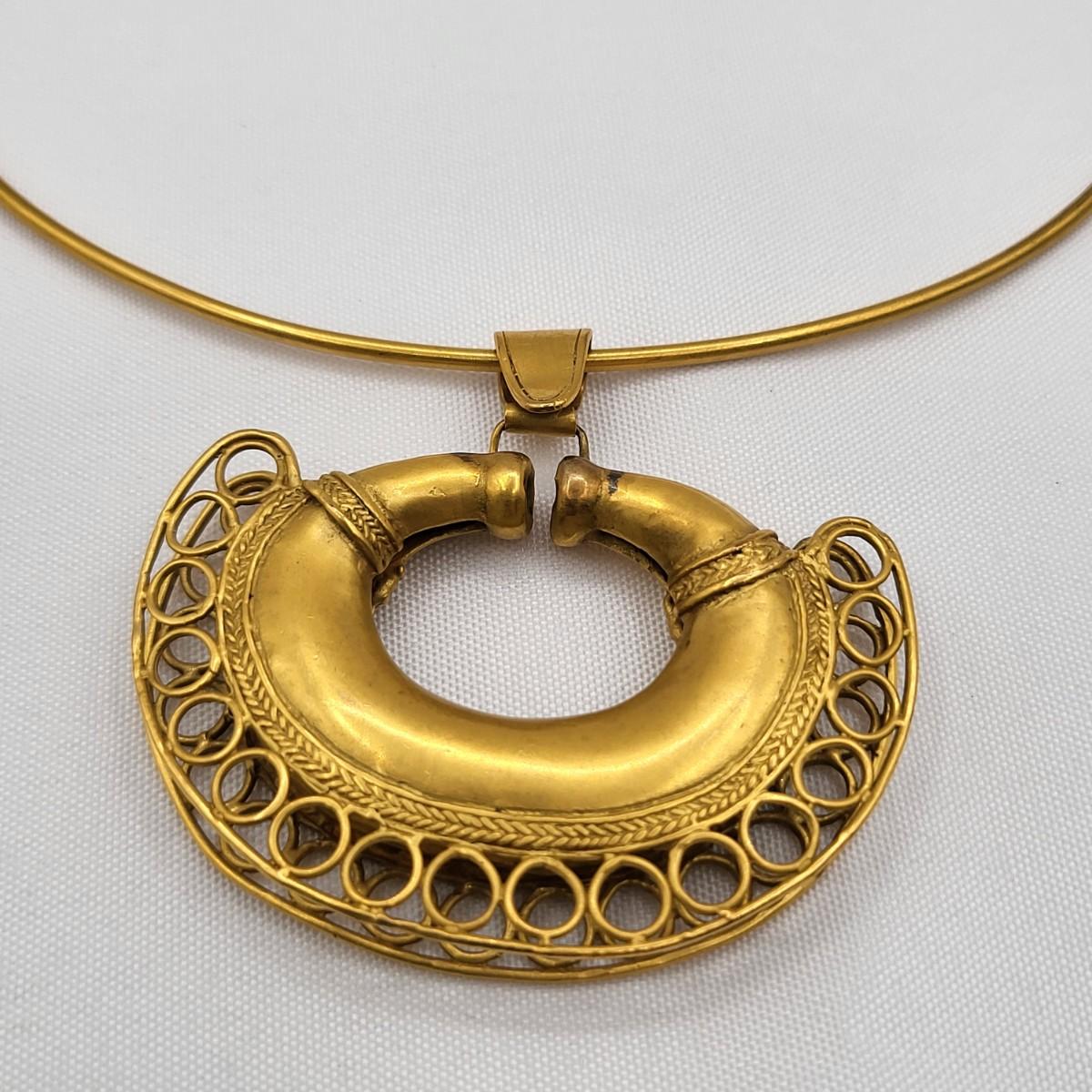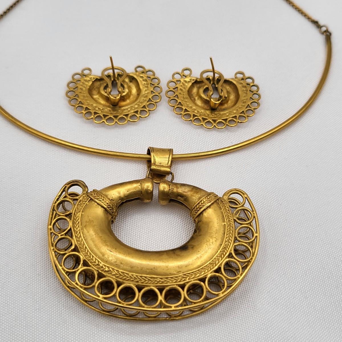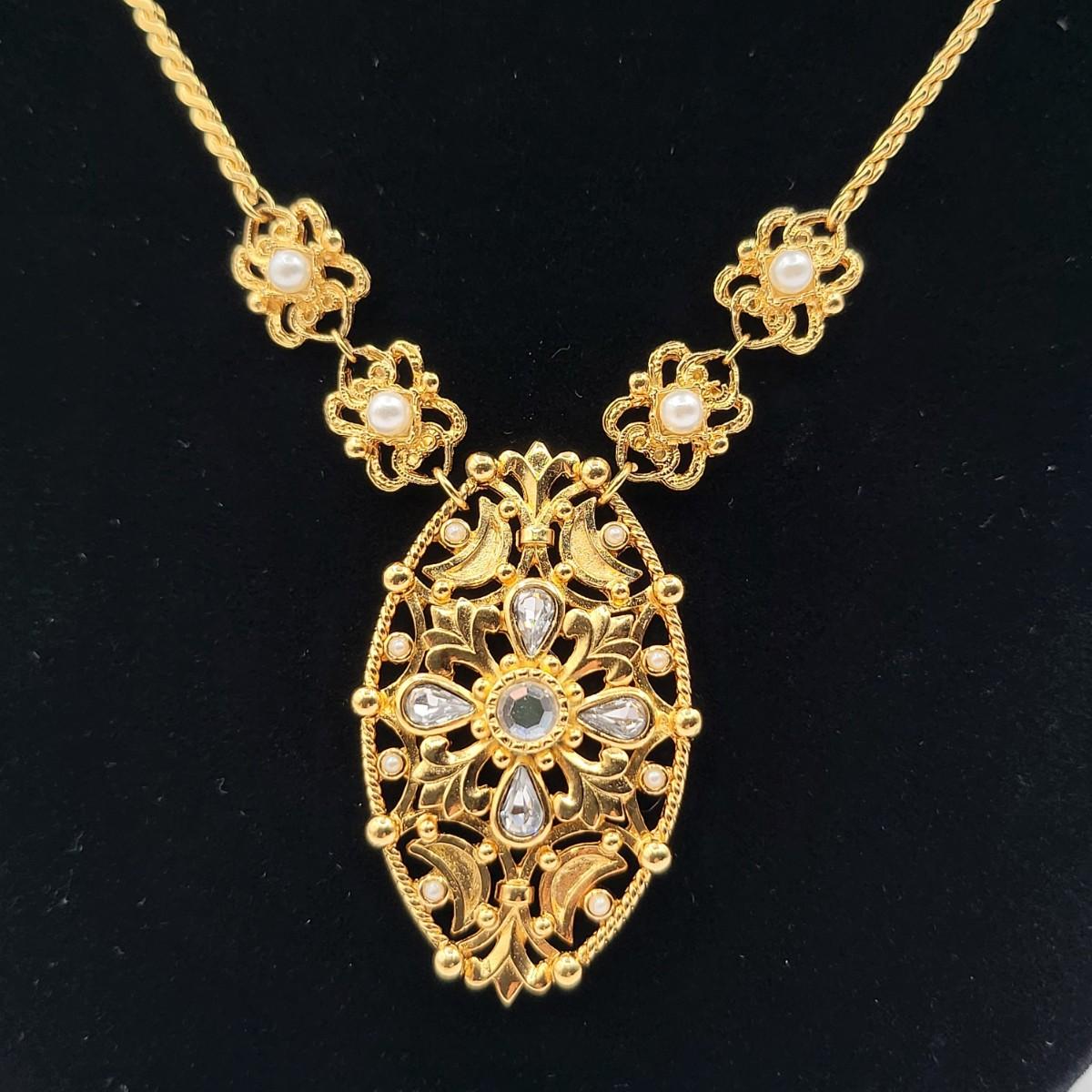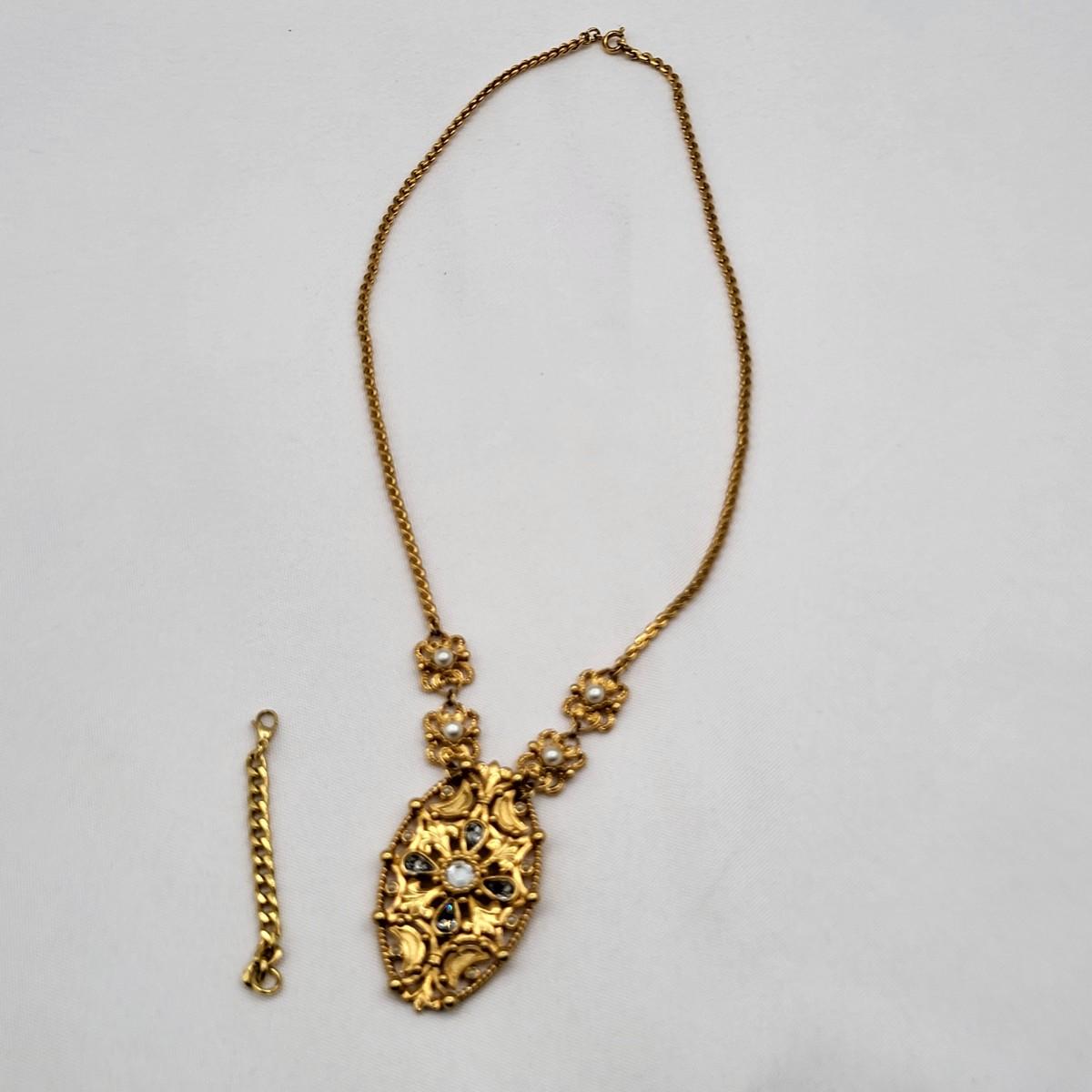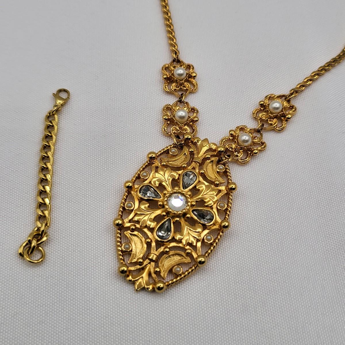 Open swirl link 16" choker & 2" long pierced earrings set. Clear stone & faux pearl 16" drop pendant necklace signed Aconda (2" extender included). Tribal-inspired crescent pendant 12" collar necklace & matching pierced earrings, matte gold tone.