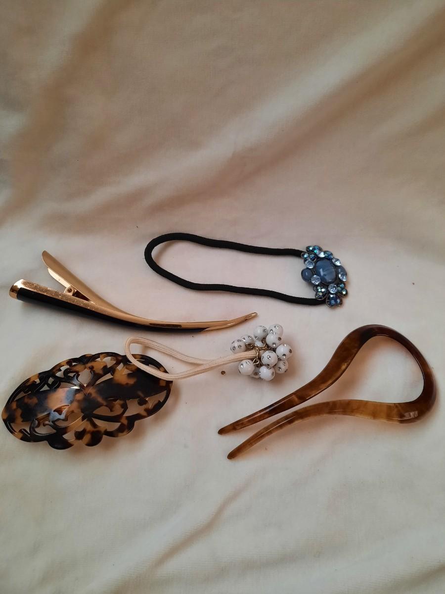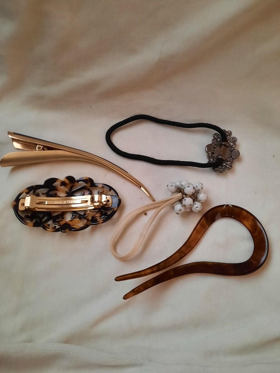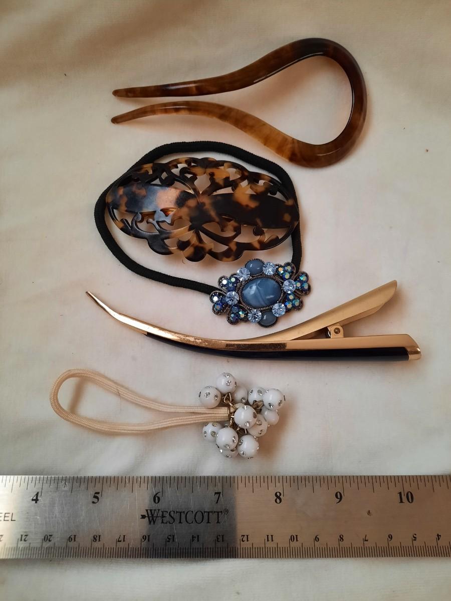 The blue one with rhinstones is metal. The black and gold clip is metal. The white beads are plastic and some rhinestones are missing. The tortoise shell is hard plastic and was made in France. The vintage piece may be bakelite.