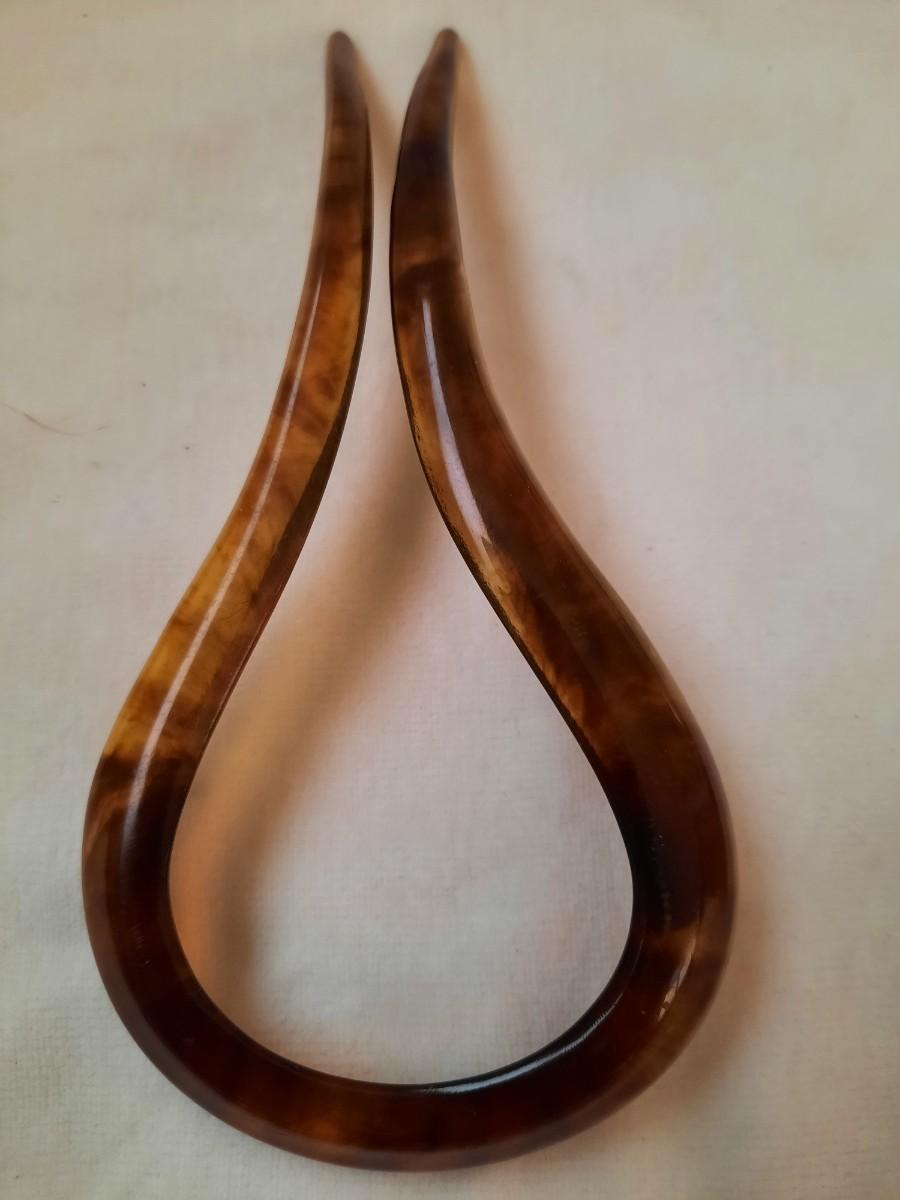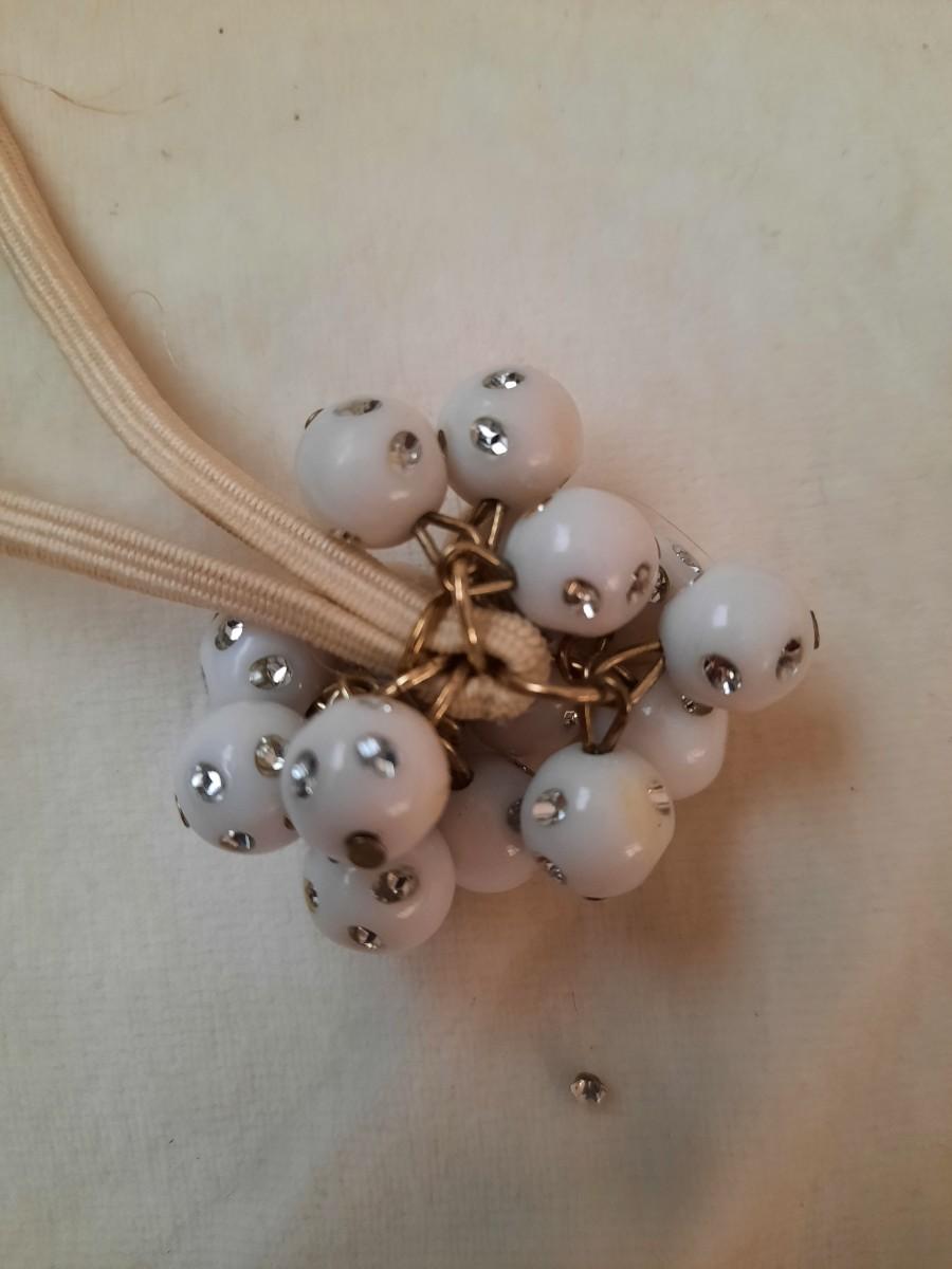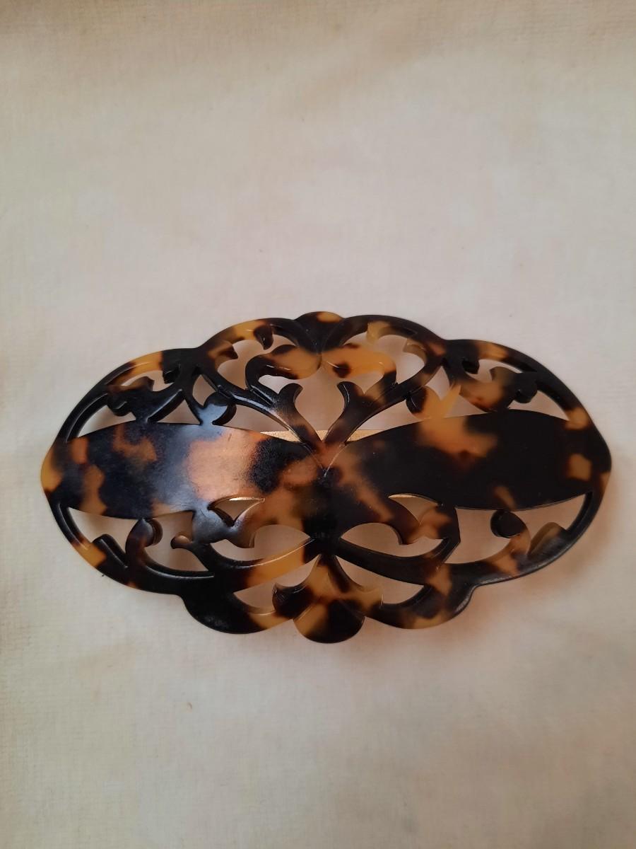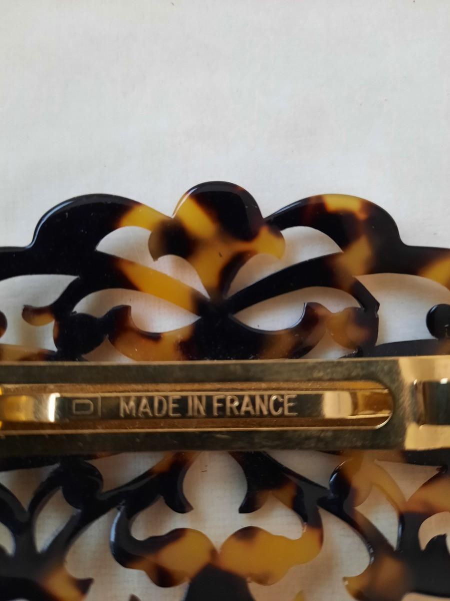 The blue one with rhinstones is metal. The black and gold clip is metal. The white beads are plastic and some rhinestones are missing. The tortoise shell is hard plastic and was made in France. The vintage piece may be bakelite.