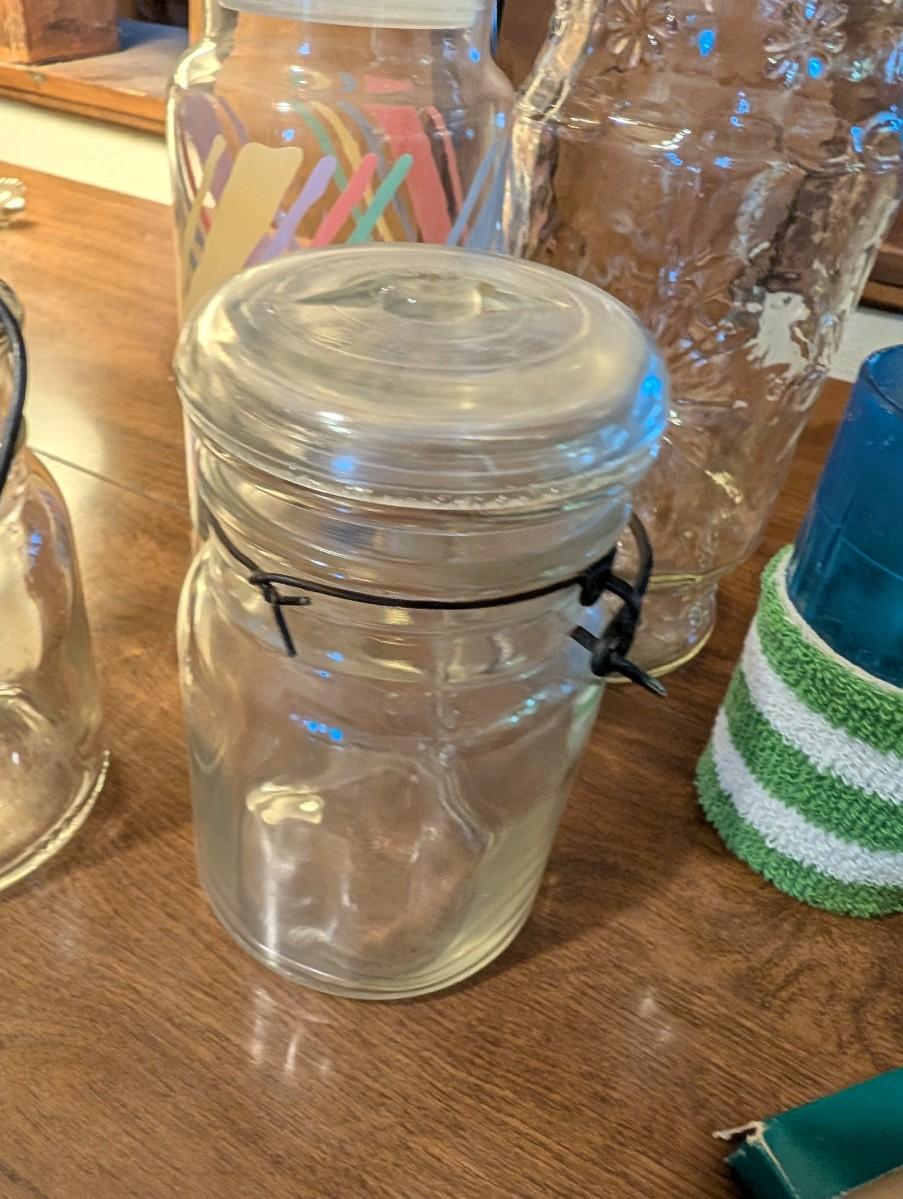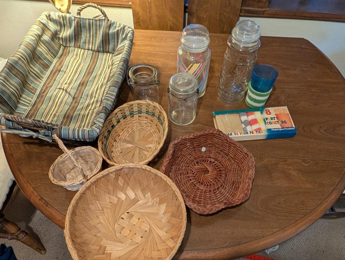 Large basket with jars, vintage party coasters, and other baskets.