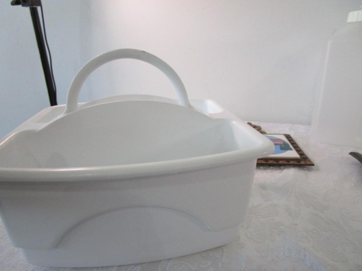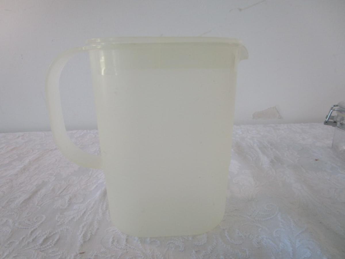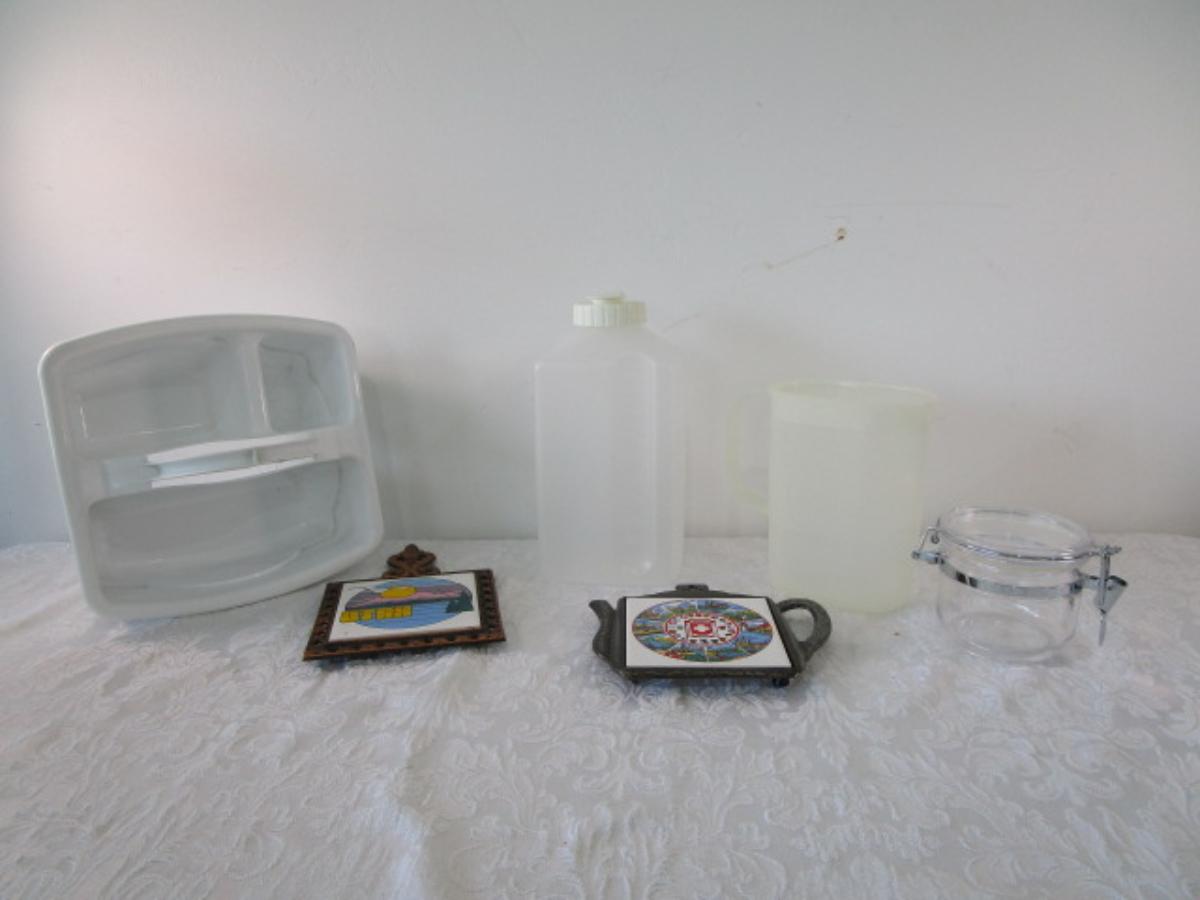 2 trivets, 1 Rubbermaid jug, 1 Tupperware pitcher, 1 small jar with lid, 1 multipurpose plastic caddy