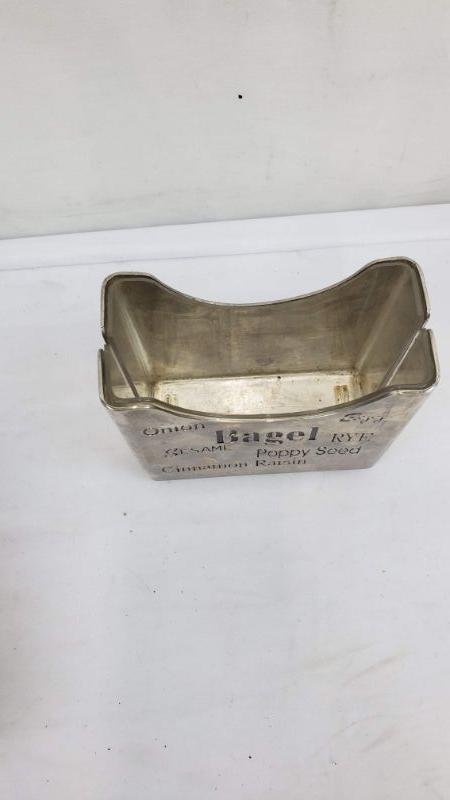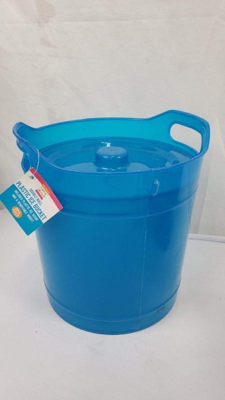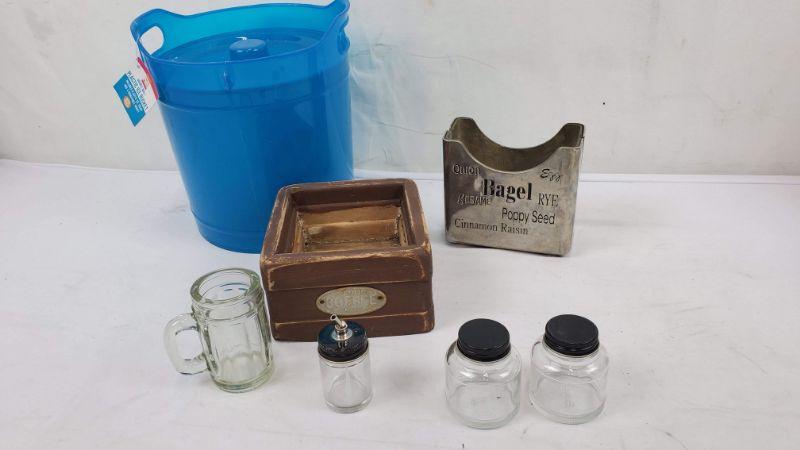 Various Kitchen Items: Blue Plastic Ice Bucket, Mini Wood Coffee Crate, 3 Mini Glass Bottles w/Lids, Mini Stein, and Bagel Slicer
