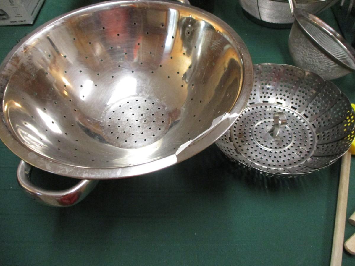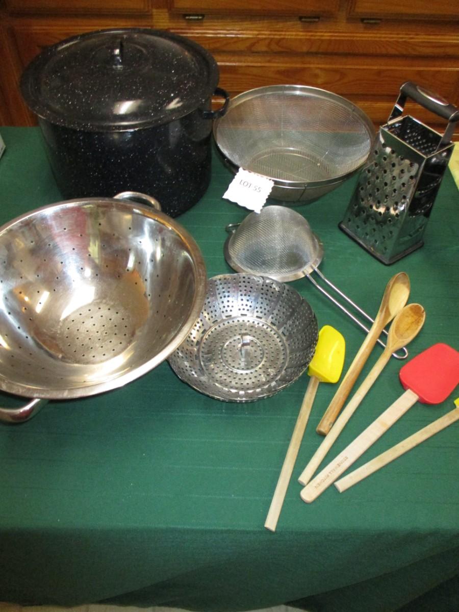 Collander, Wooden spoons, Enamel Stock pot, Cheese shredder, Strainers. Steamer. 11pcs
