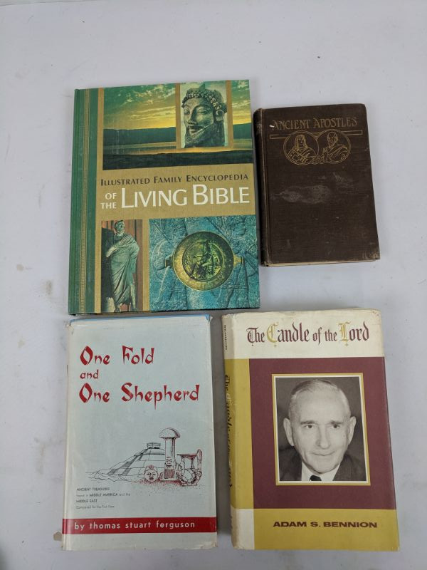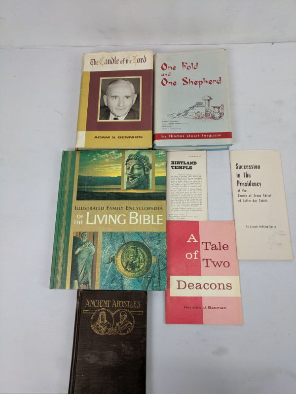 Pamphlets: Kirtland Temple, Succession in the Presidency, A Tale of Two Deacons & Books: Illustrated Family Encyclopedia of The Living Bible, Ancient Apostles, One Fold and One Shepherd, The Candle of the Lord