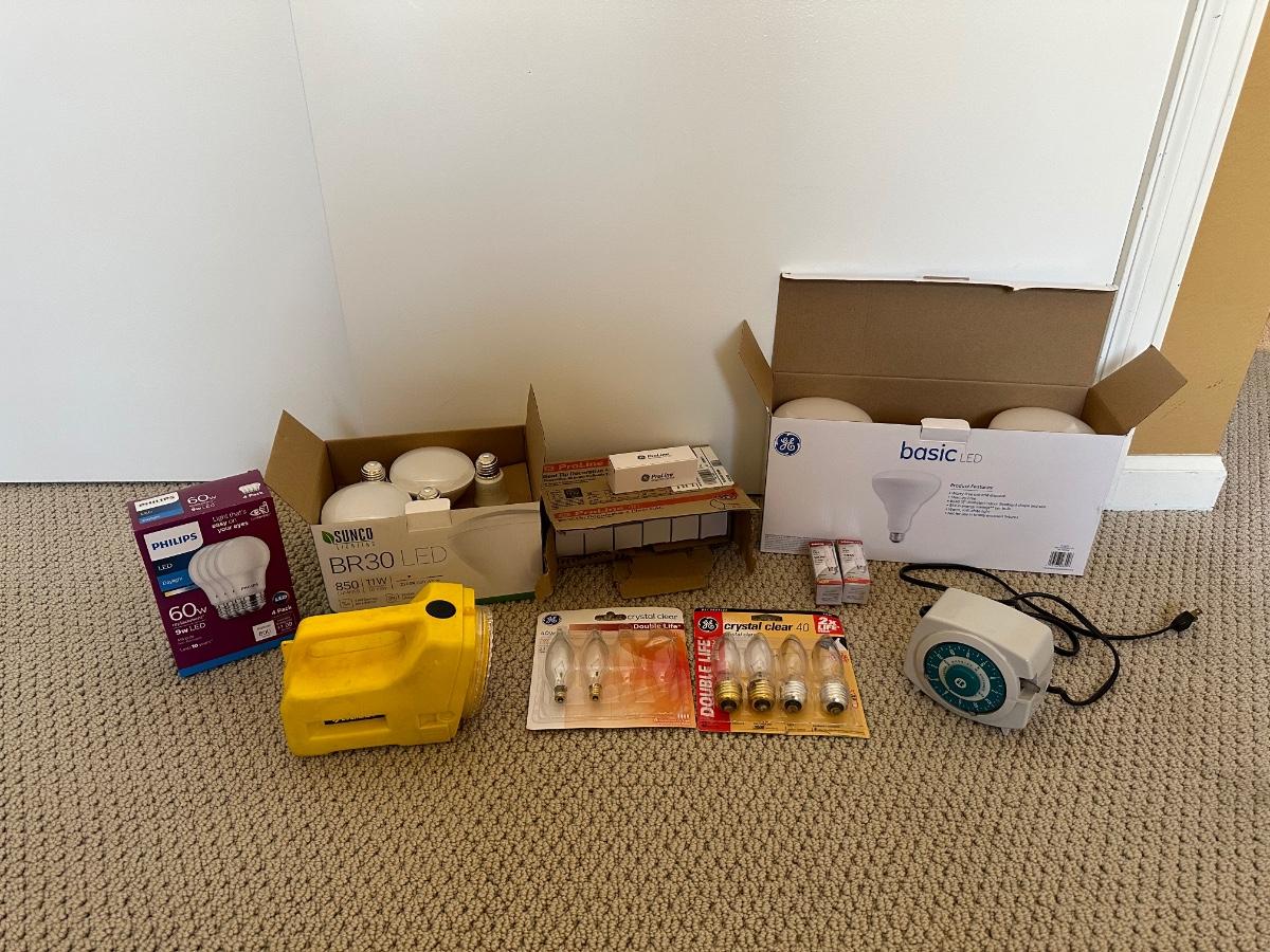 VARIOUS LIGHT BULBS, FLASHLIGHT AND TIMER