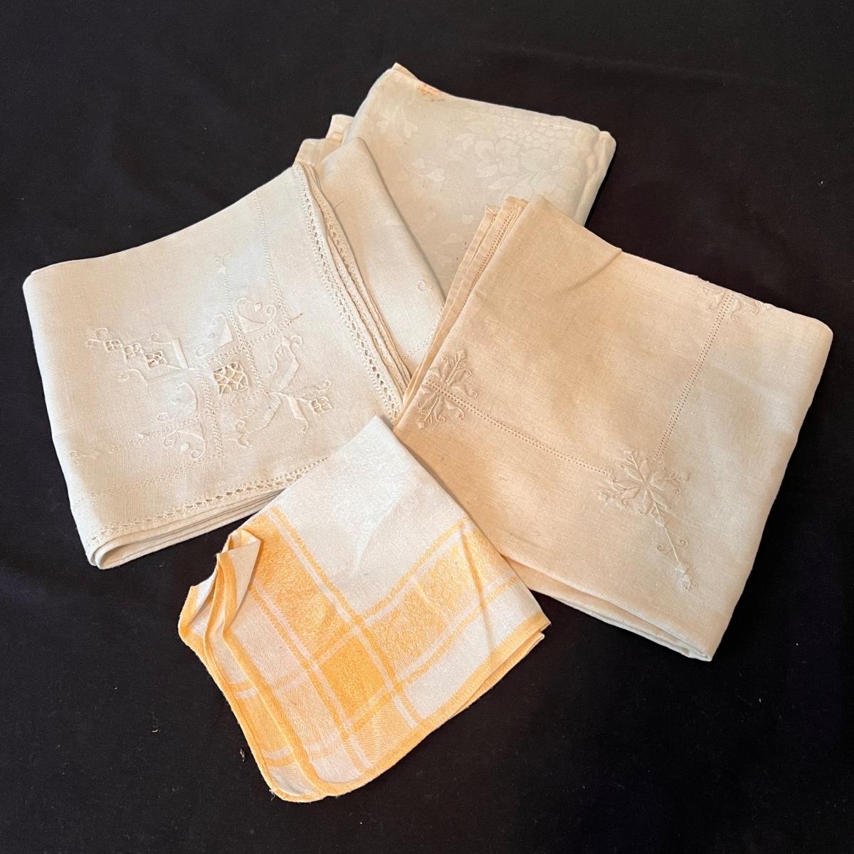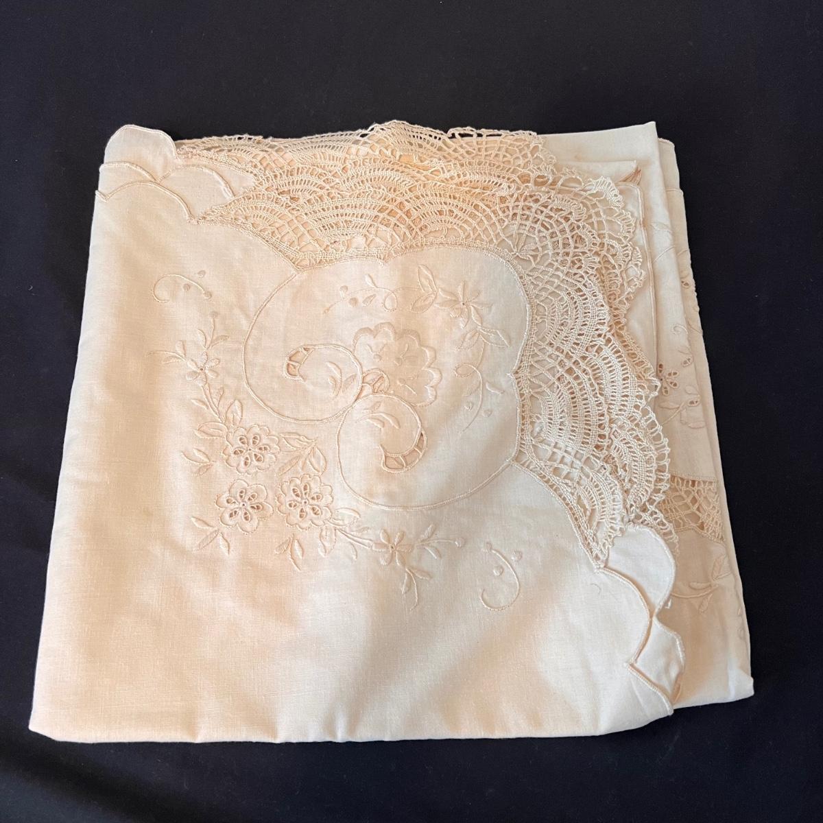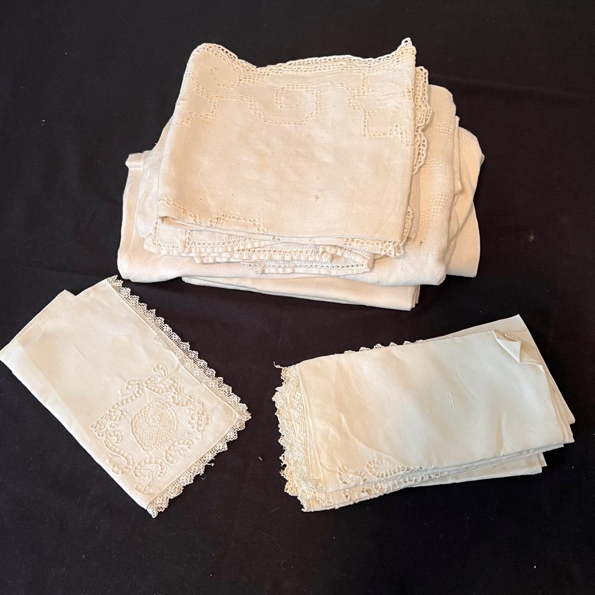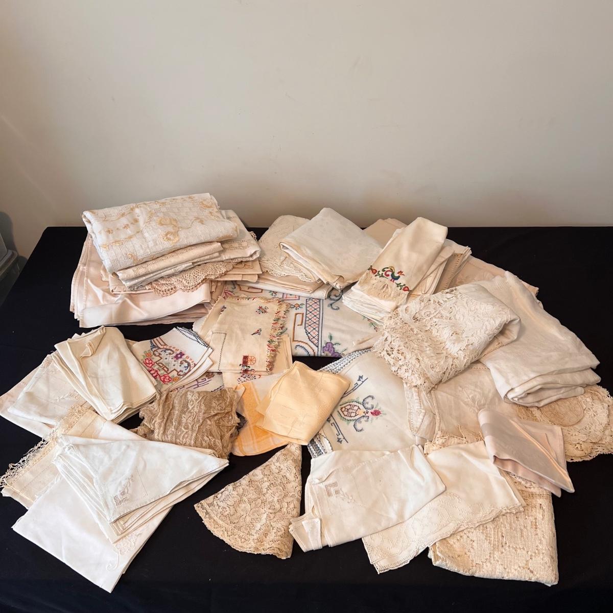 Lot includes several pieces of linens and lace. All appear to not have any markings with brand names or product details. The largest pieces measure 76” x 80”H. Shipping available.