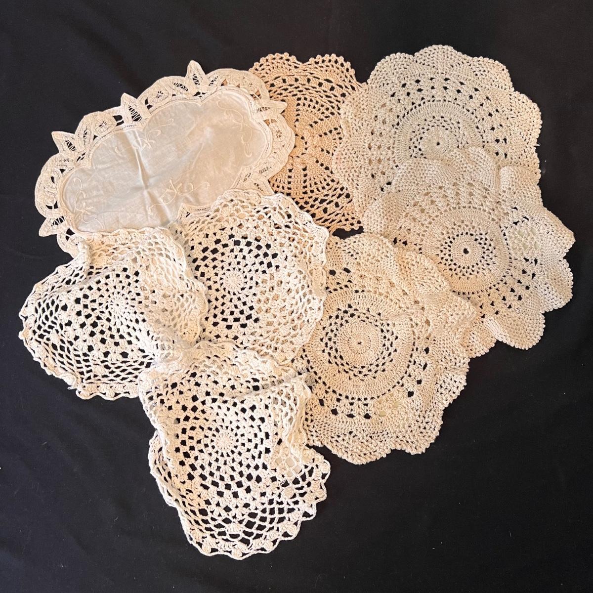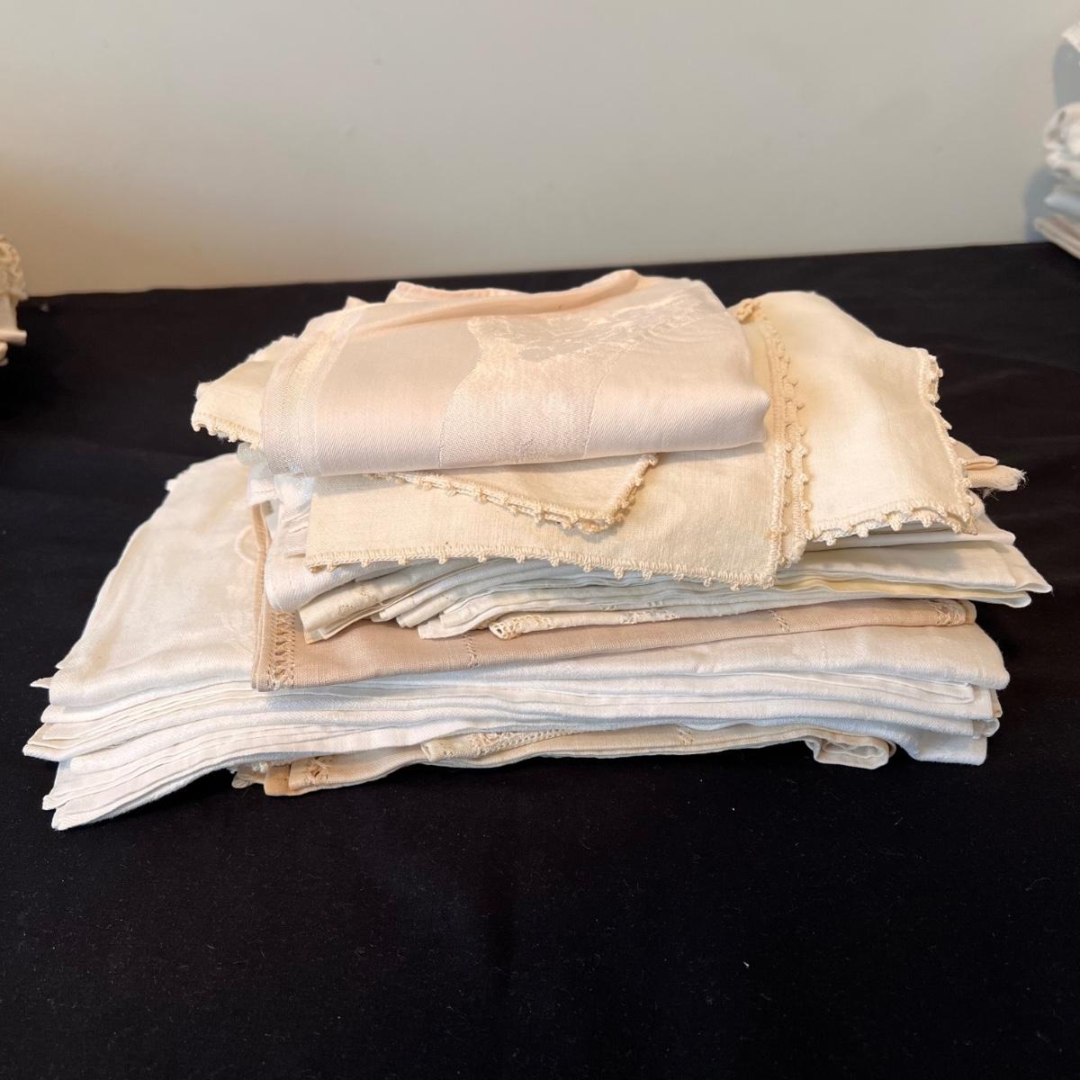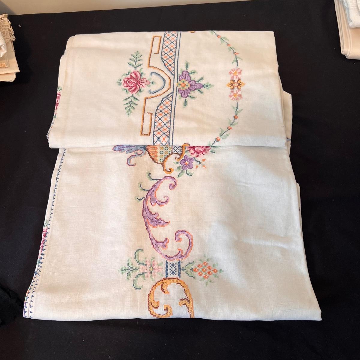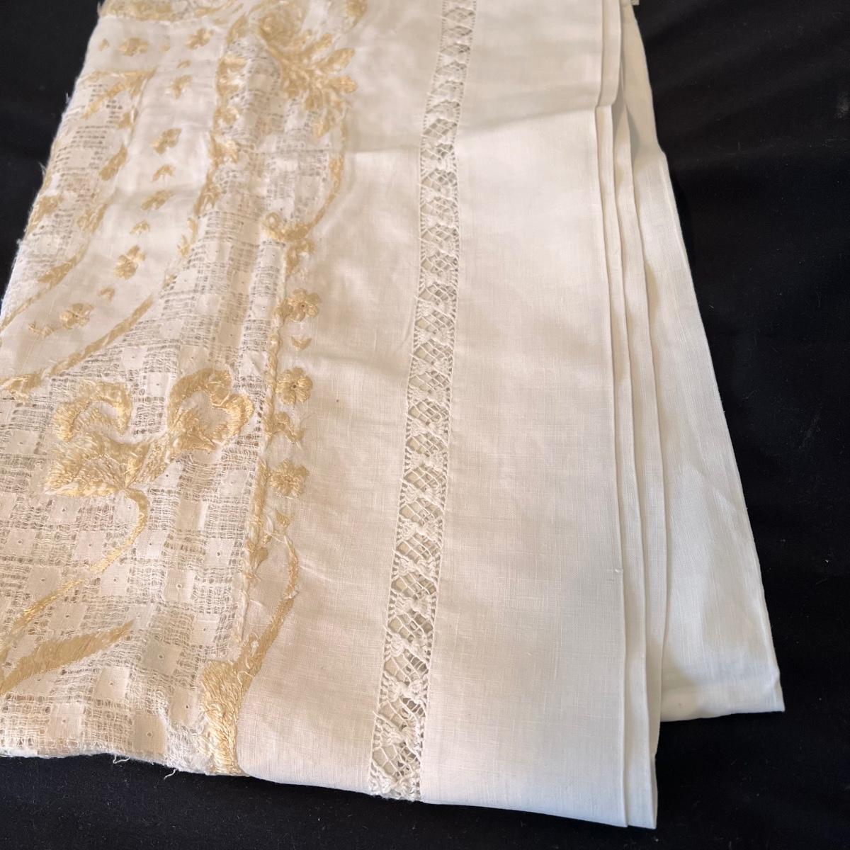 Lot includes several pieces of linens and lace. All appear to not have any markings with brand names or product details. The largest pieces measure 76” x 80”H. Shipping available.