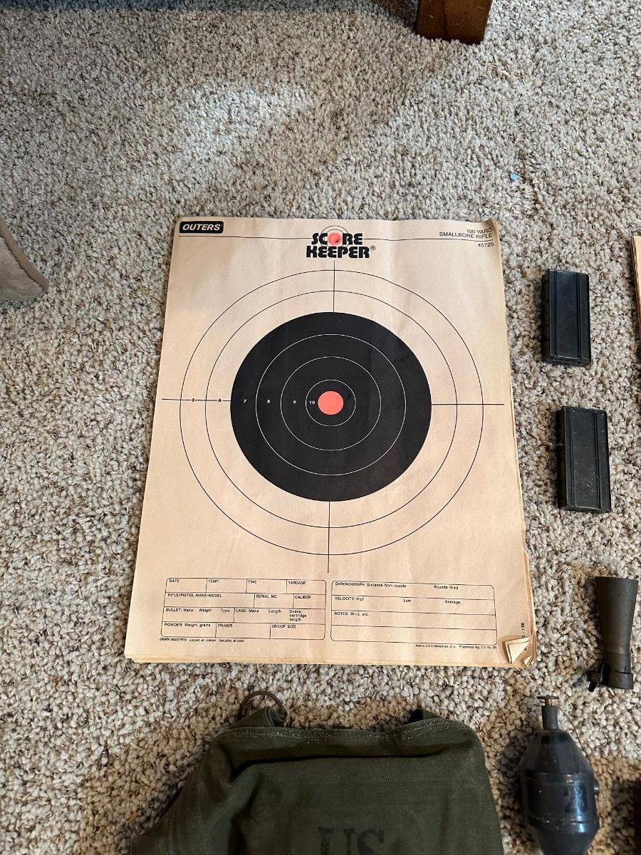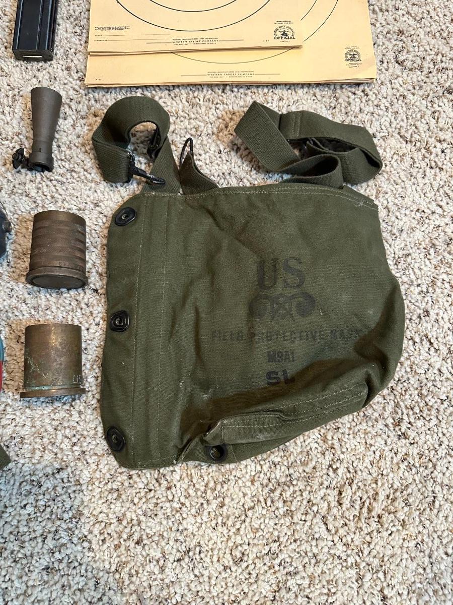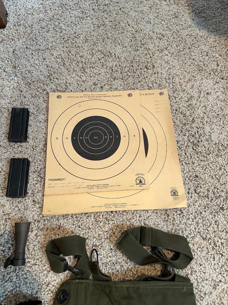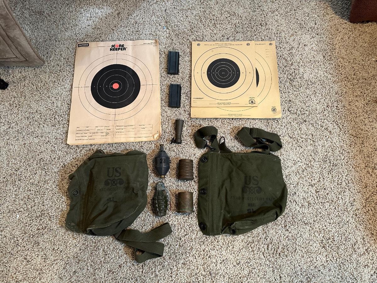 VARIOUS PAPER TARGETS, CARBINE MAGAZINES, SPENT SHELLS, MILITARY CANVAS BAGS AND MORE