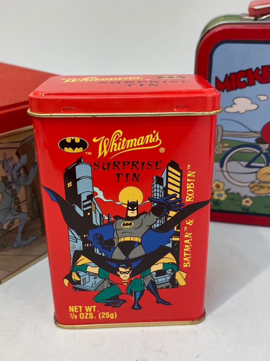 Various Small Tins Mickey Mouse Batman Coin Bank. All are in good condition. Small size, under 5".