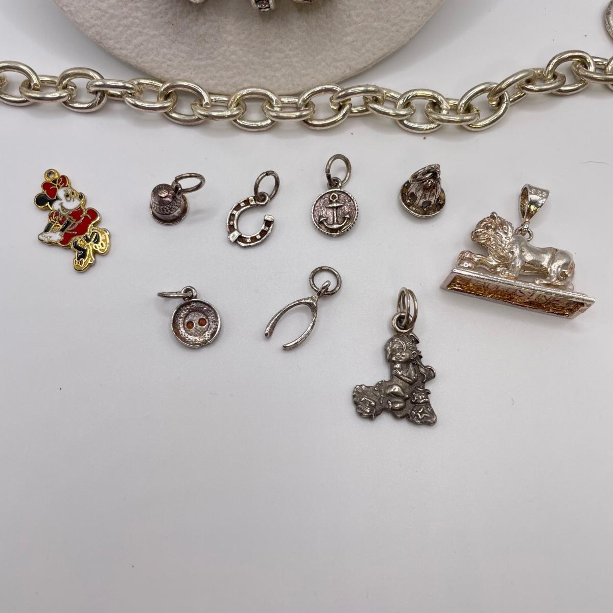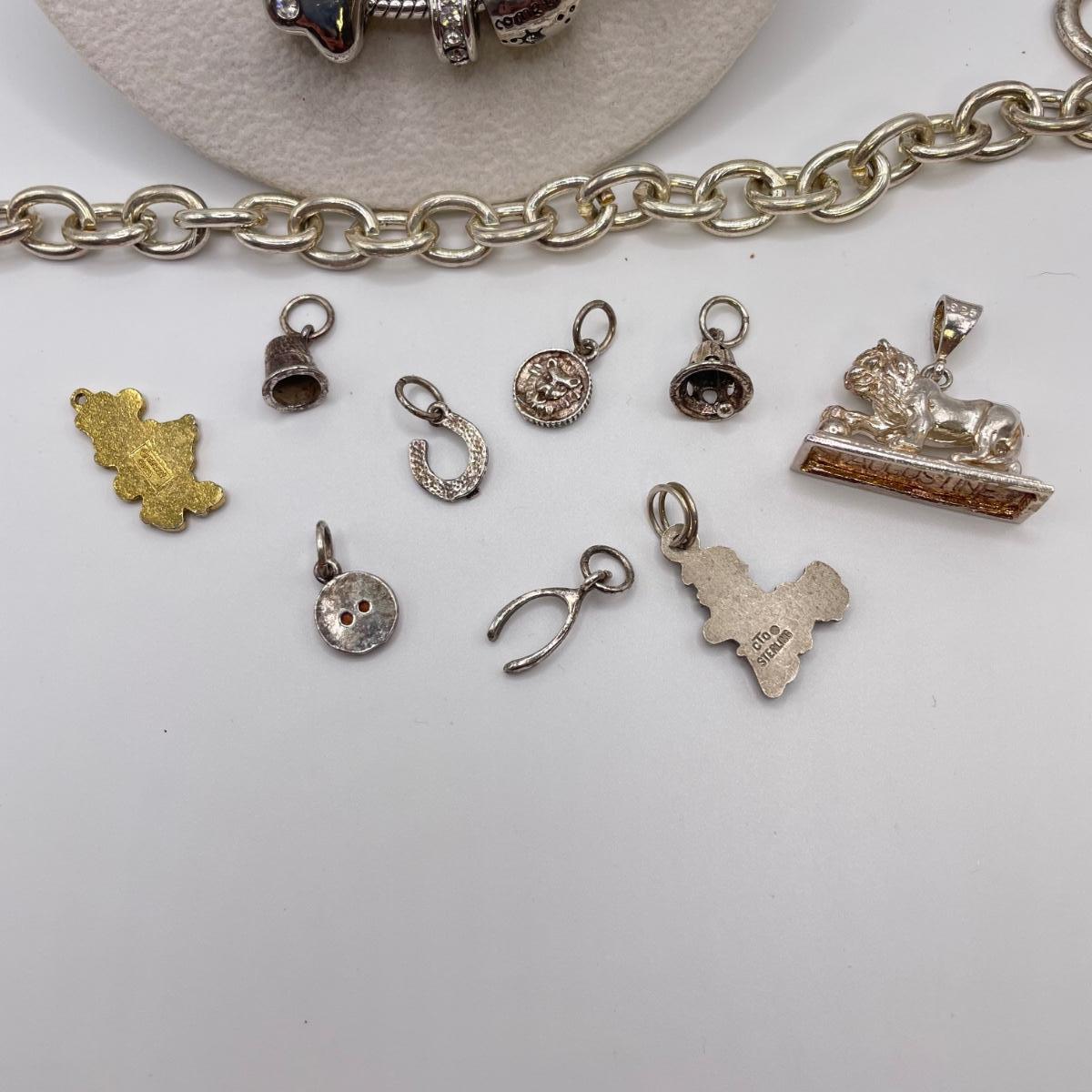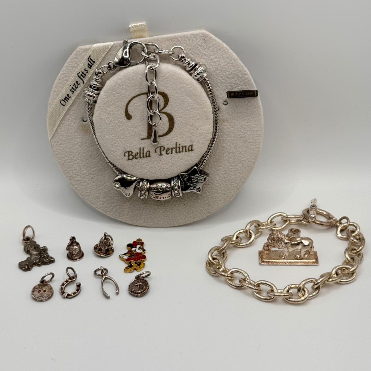 This lot includes nine small charms, what appears to be a Bella Perlina charm bracelet, and one chain link bracelet. The lion pendant/charm is marked 925 and St Augustine; and the young child charm is marked 'Sterling'. All other known markings are shown in photos. The Bella Perlina bracelet is said to be “one size fits all.” The chain link bracelet is 9”L.