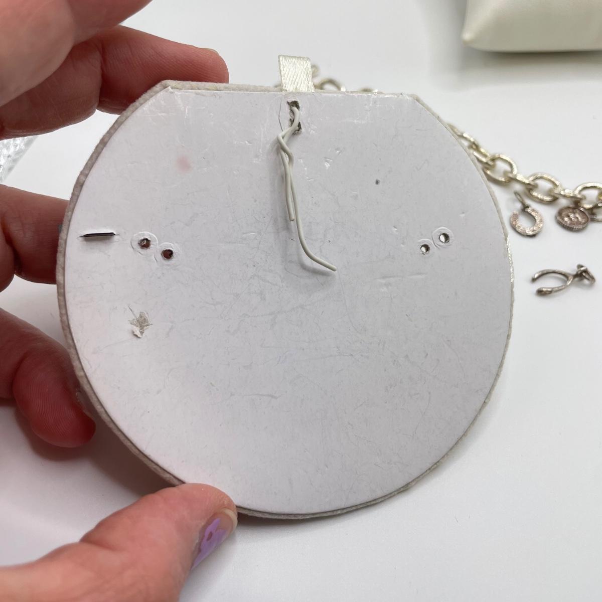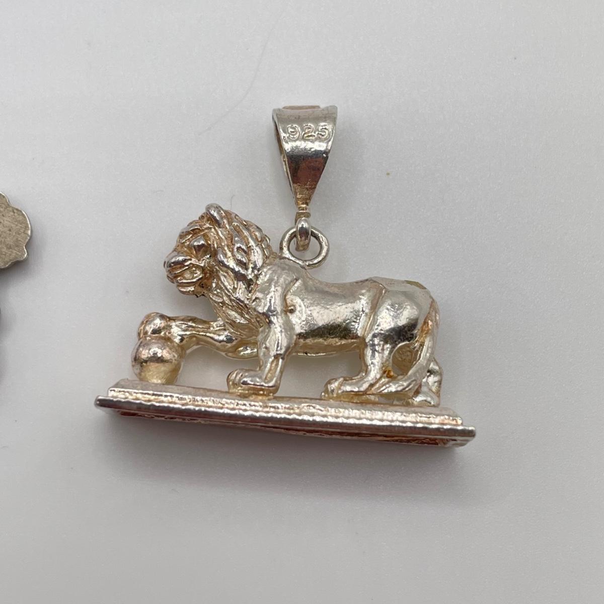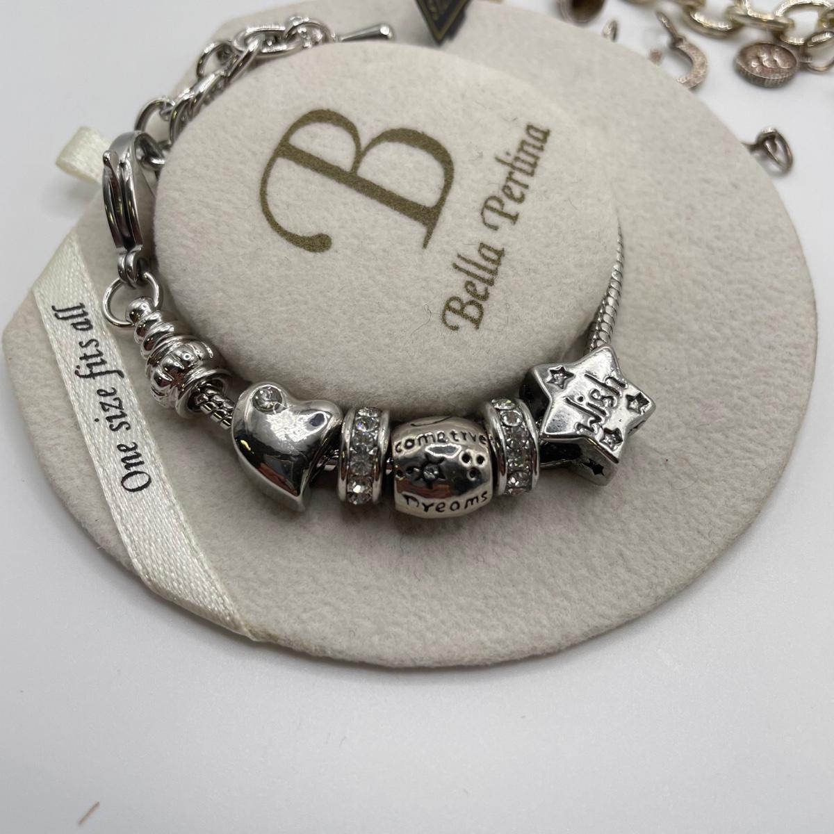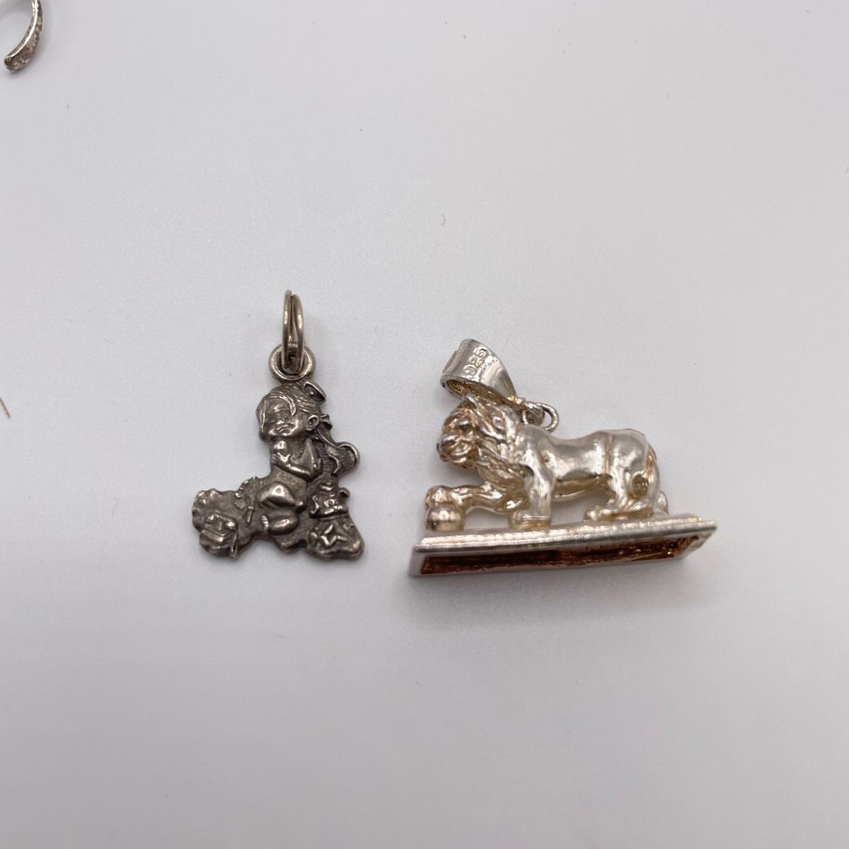 This lot includes nine small charms, what appears to be a Bella Perlina charm bracelet, and one chain link bracelet. The lion pendant/charm is marked 925 and St Augustine; and the young child charm is marked 'Sterling'. All other known markings are shown in photos. The Bella Perlina bracelet is said to be “one size fits all.” The chain link bracelet is 9”L.