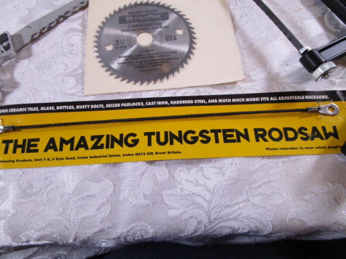 4-1/2" saw, 5-1/2" hacksaw, 8-1/2" amazing tungsten rod saw, circular saw blade