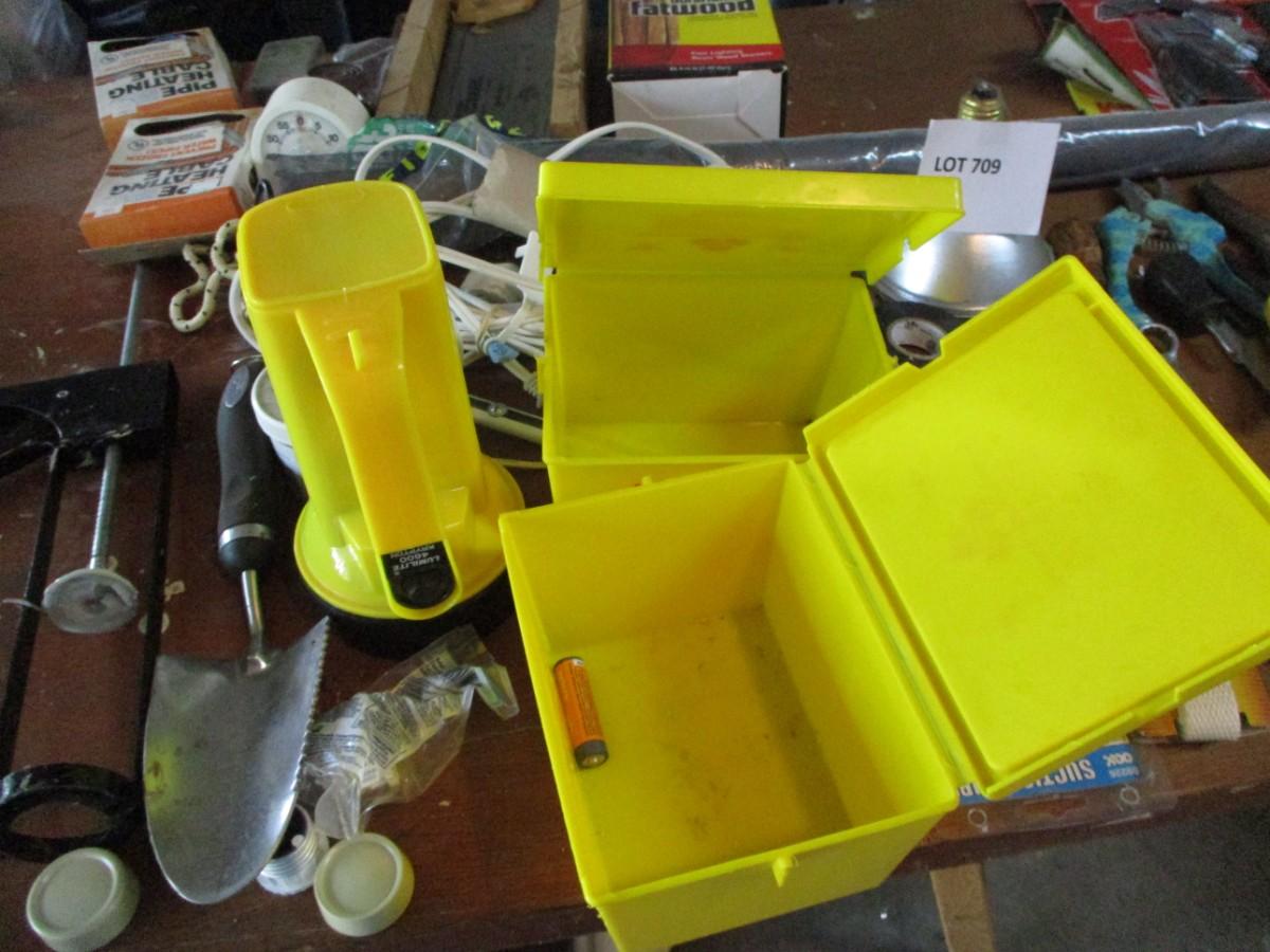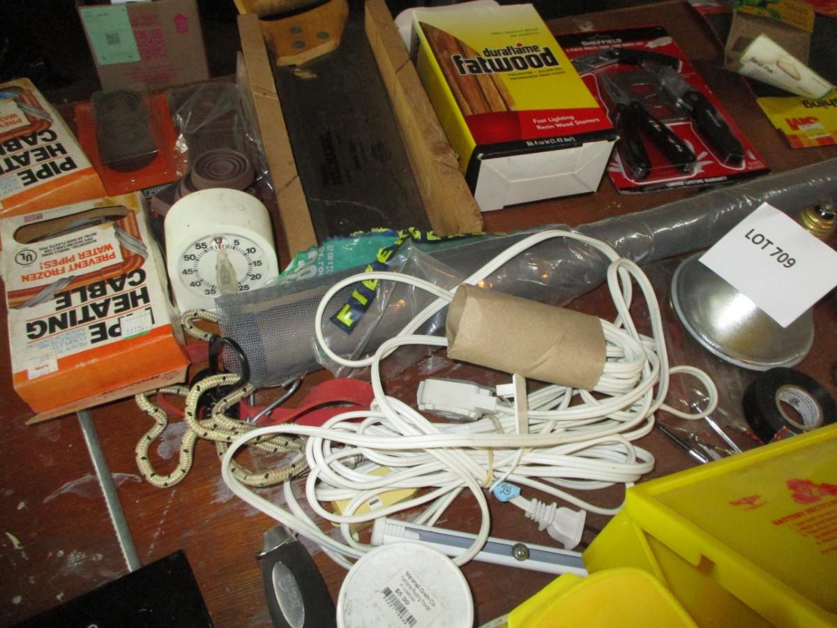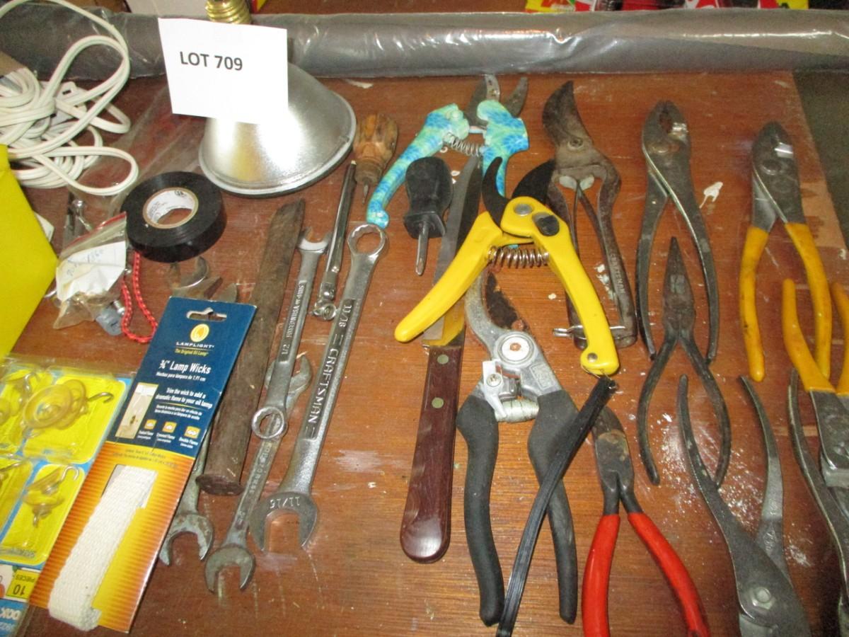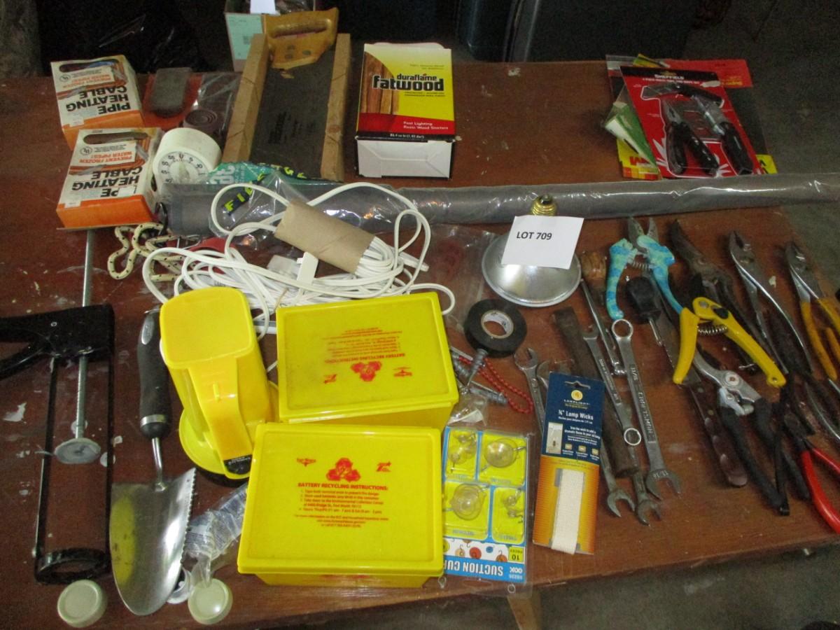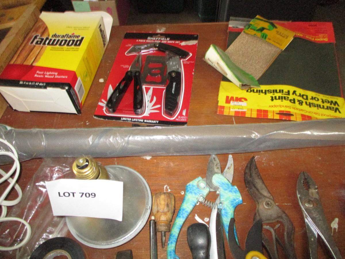 flashlight, extension cord, wrenches, plyers, garden tools, multi tool & knife set, miter saw