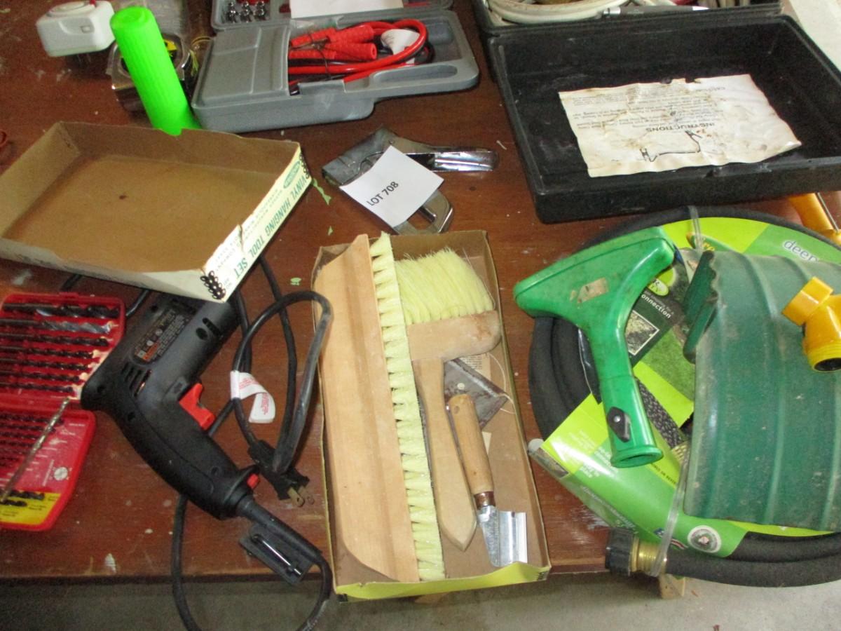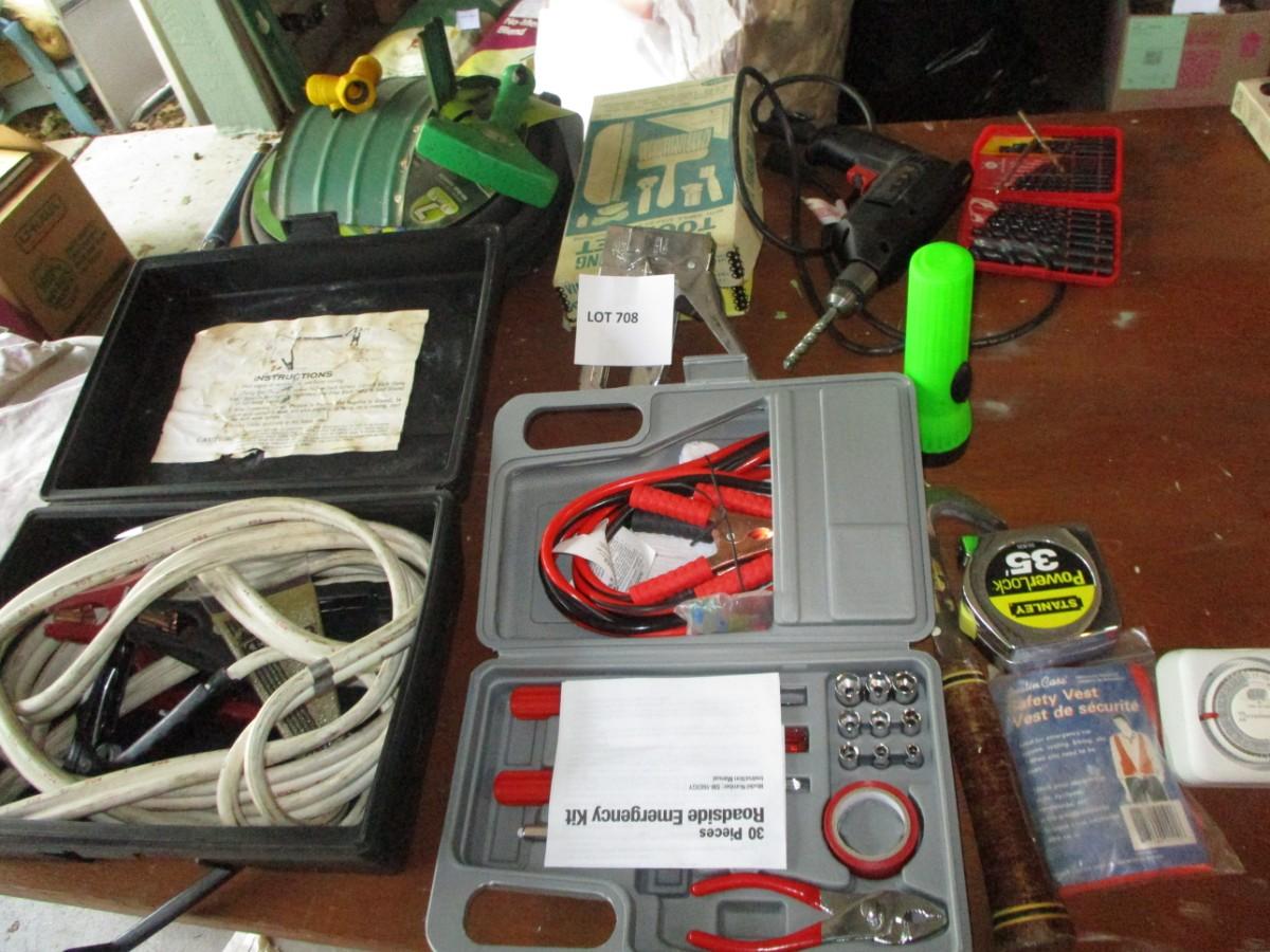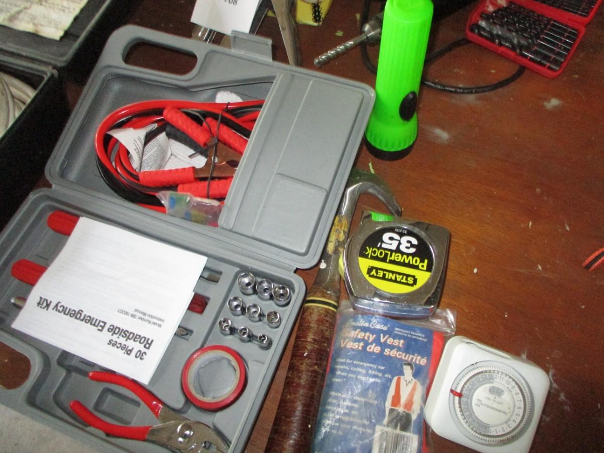 Drill & Bits, Roadside emergency kit, battery cables, garden hose and holder, paint supplies etc