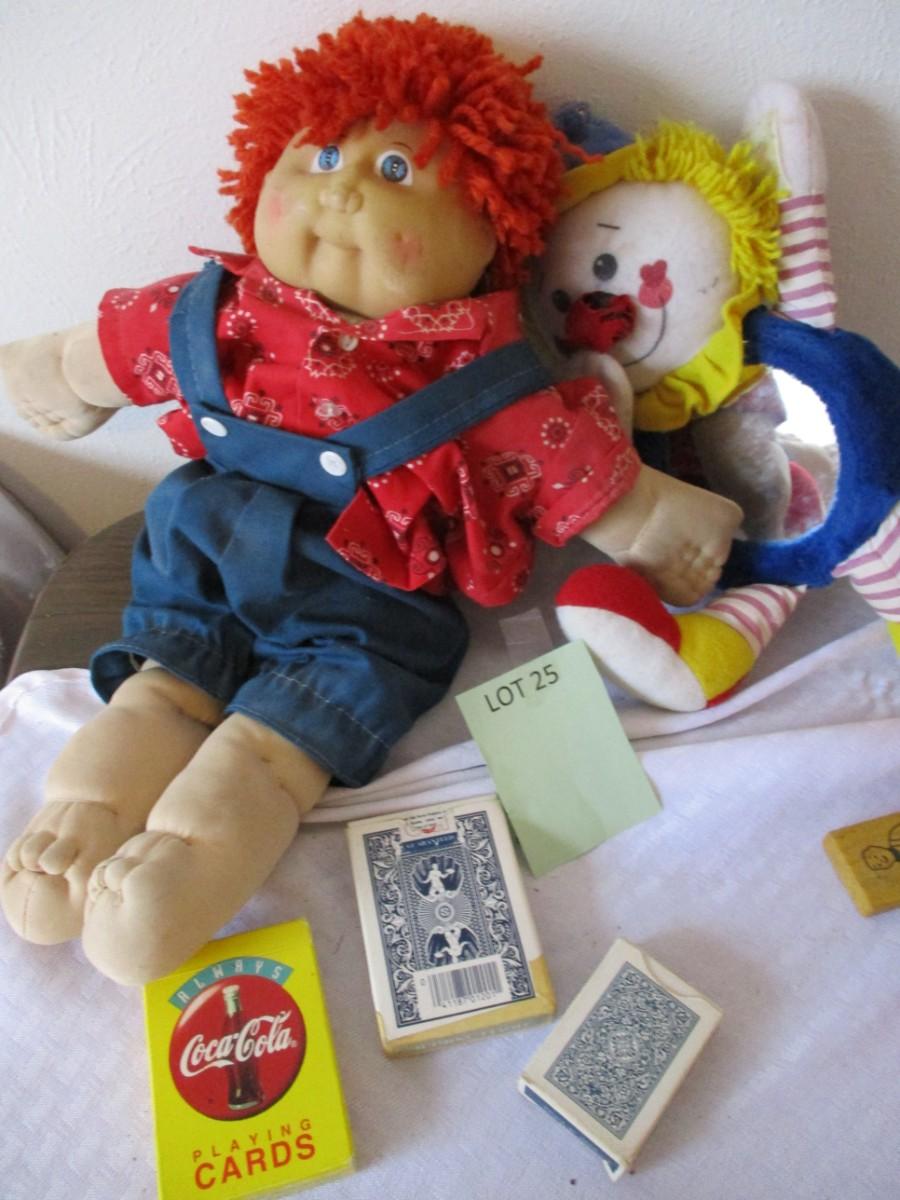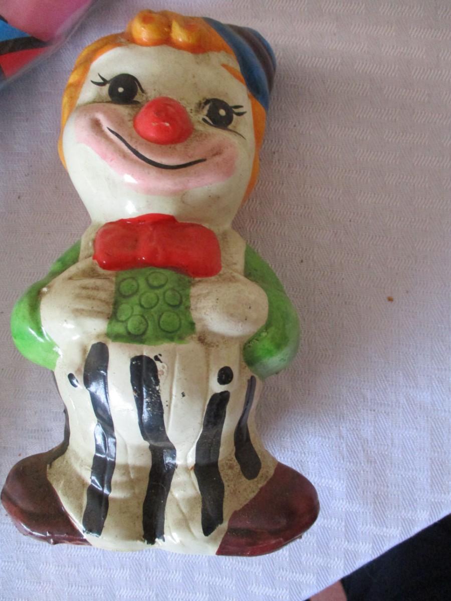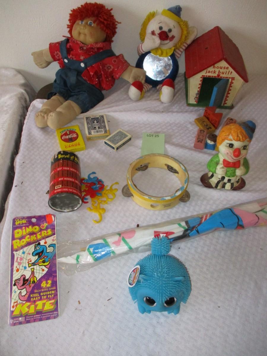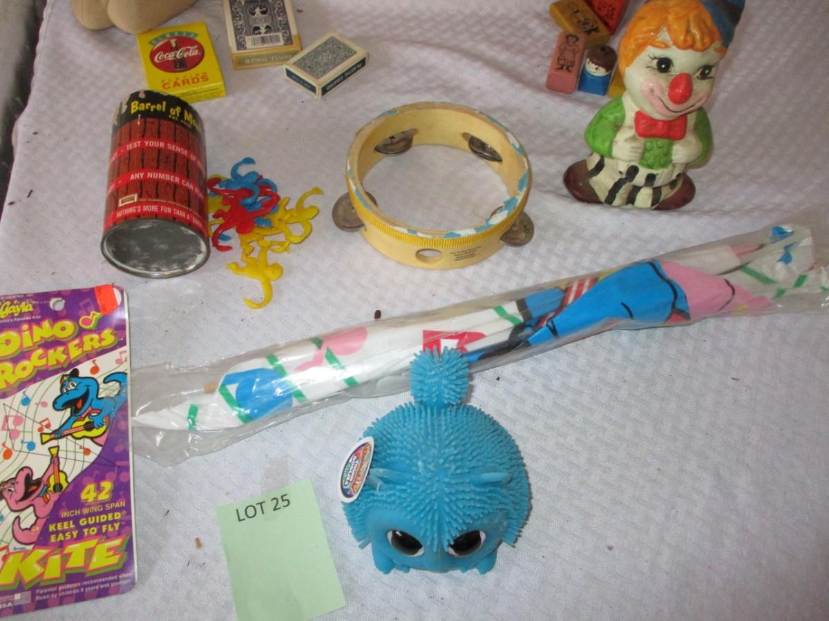 Tambourine, wooden School House, Ceramic Clown Banks, Mirror Clown doll, Doll w/plastic face and plush body. Barrell of Monkeys. Playing Cards. kite. Googly Town Ooglies.,