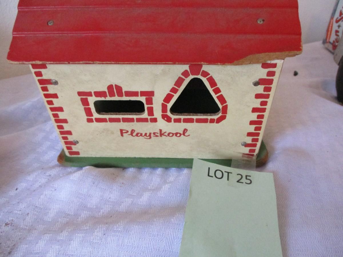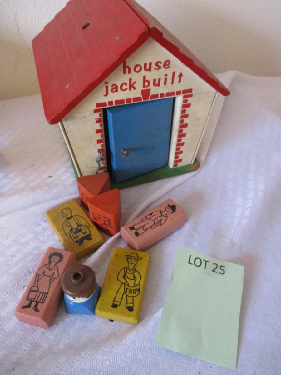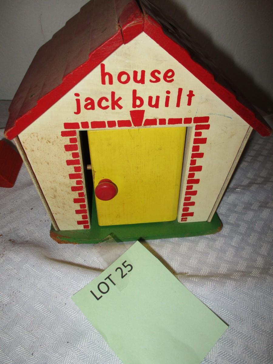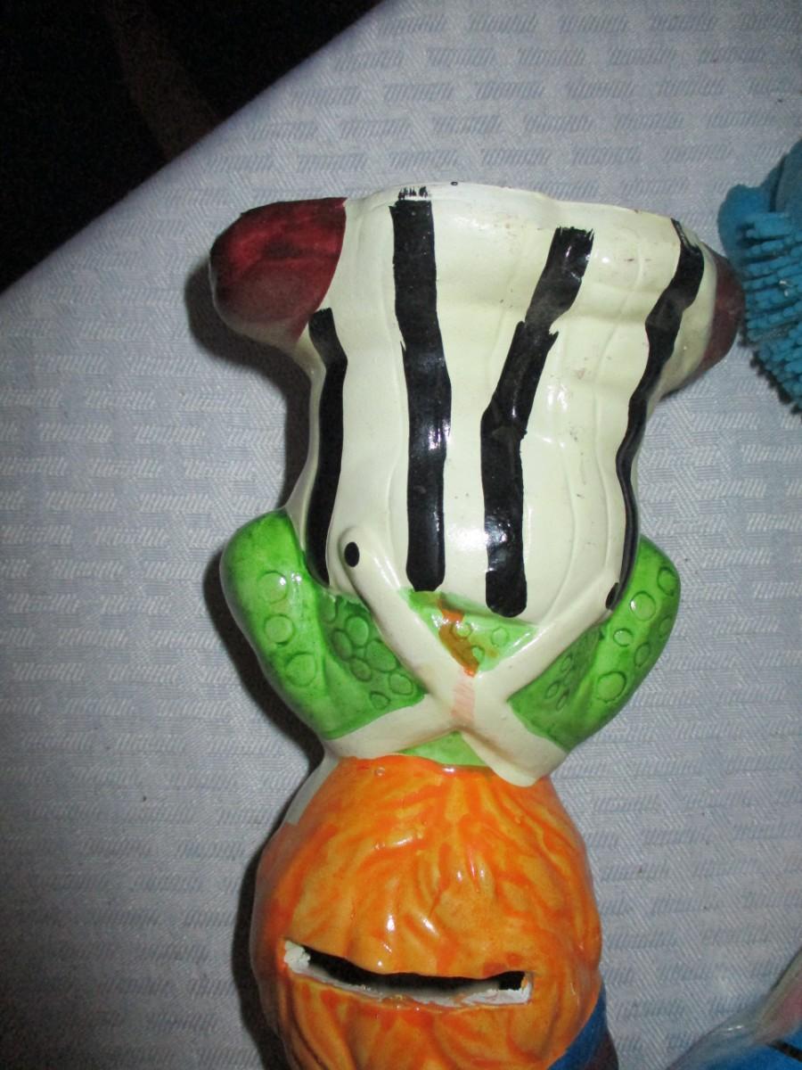 Tambourine, wooden School House, Ceramic Clown Banks, Mirror Clown doll, Doll w/plastic face and plush body. Barrell of Monkeys. Playing Cards. kite. Googly Town Ooglies.,