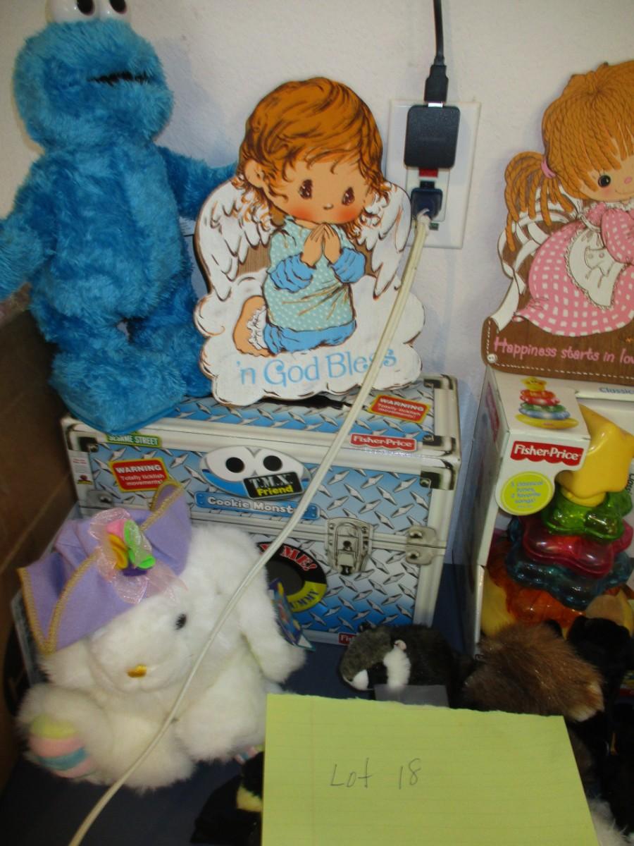 Cookie Monster, Stuffed Animals, Lillian Vernon plush kitchen set, Wooden rubber band shooter