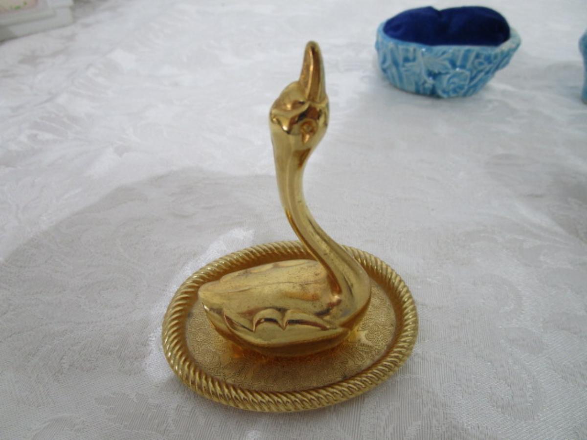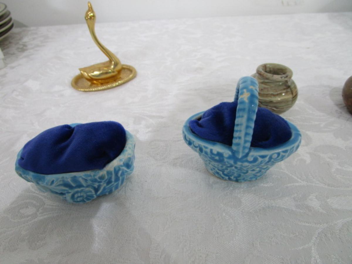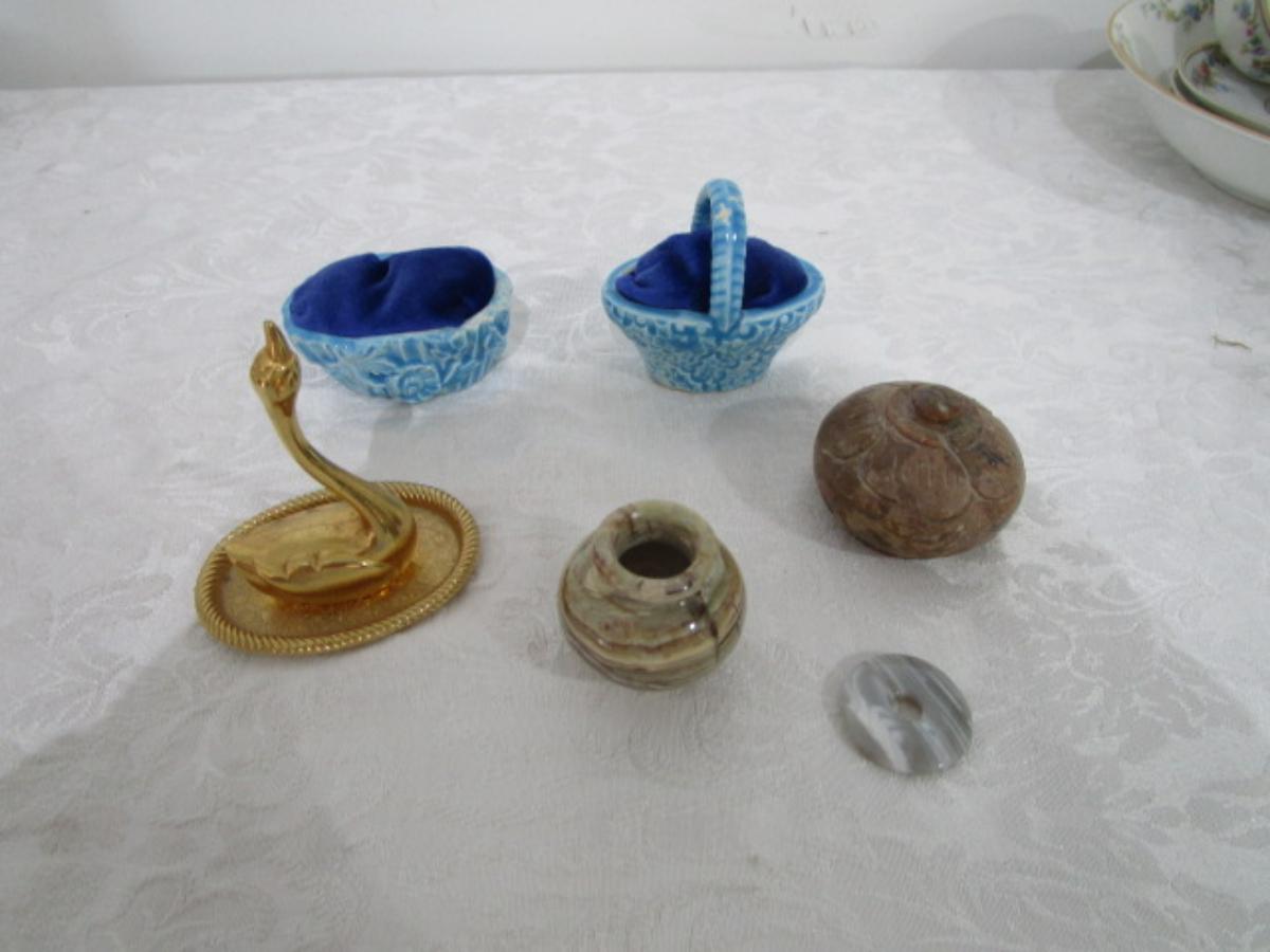 2 ceramic pin cushion holders, 1 small vase, 1 swan ring holder, 1 stone trinket box, polished rock disc